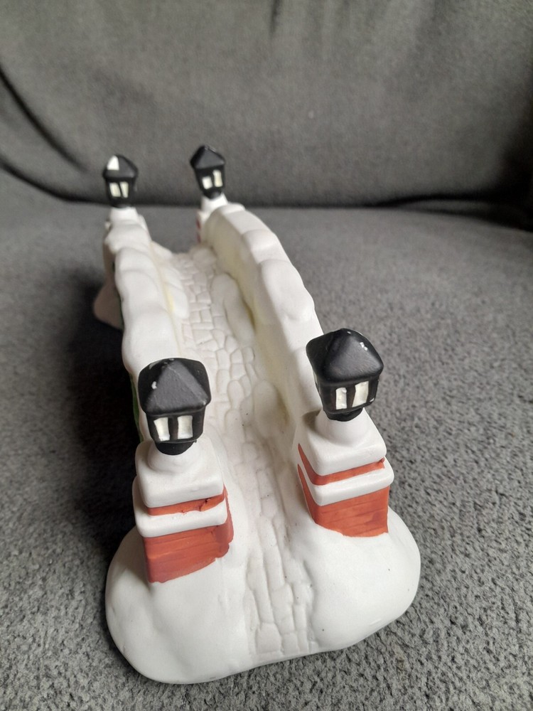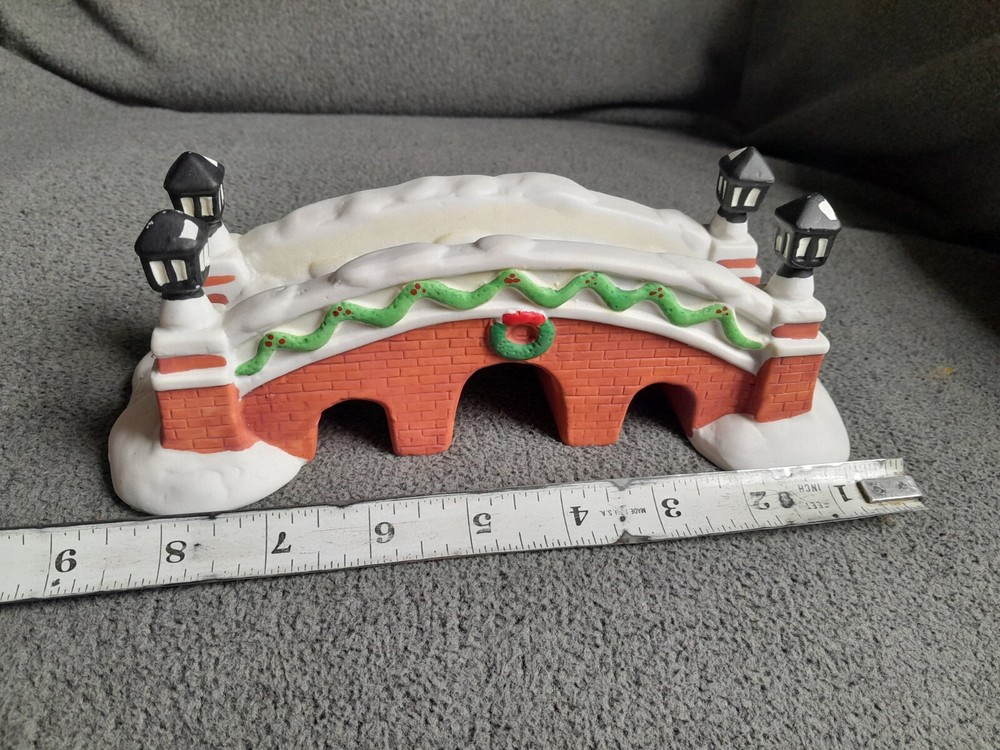 This vintage NOMA porcelain bridge is a beautiful addition to any Christmas village collection. Made in China in 1995, it features intricate handmade details and a charming design that will transport you back in time. The bridge is made of high-quality porcelain and is a retired piece from the Dickensville collectibles series. The bridge is perfect for collectors looking for a unique addition to their village, and is sure to impress with its stunning craftsmanship. It has been well-maintained and is in excellent shape, making it a great investment for those looking to add to their collection. Bring some holiday cheer to your home with this nostalgic and beautiful porcelain bridge.