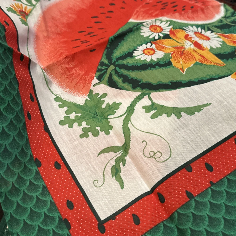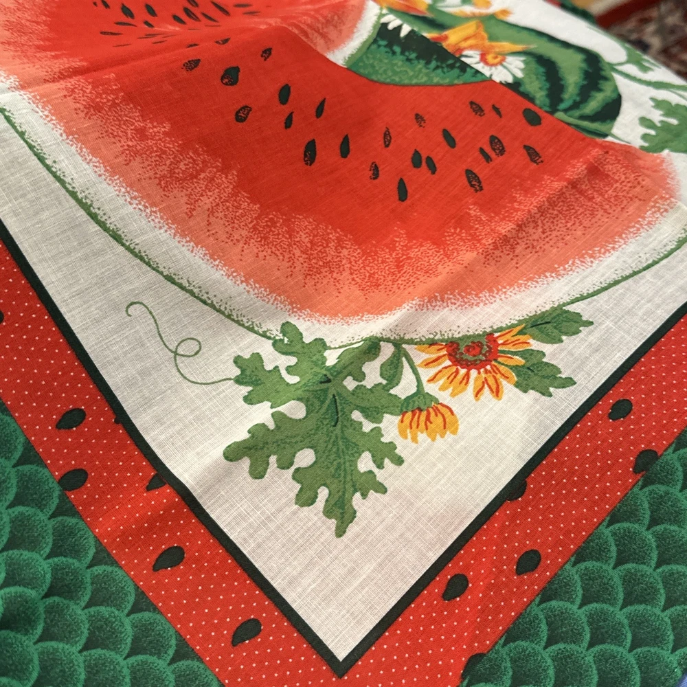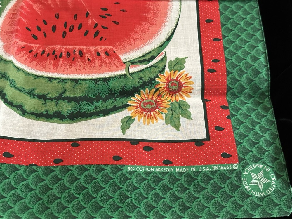 This is a vintage bandana with a watermelon design, made from a poly/cotton blend fabric. It measures 22" x 22" and features a nature character. The bandana can be used as a neck warmer, face mask, and scarf, making it a multifunctional accessory. It is suitable for unisex use and can be worn during any season. The exciting watermelon plant design makes it a unique piece to add to your collection. This bandana is new without tags and was made in the United States. What a great Mother’s Day gift this will make, especially for the mom who enjoys planting and growing watermelon!
