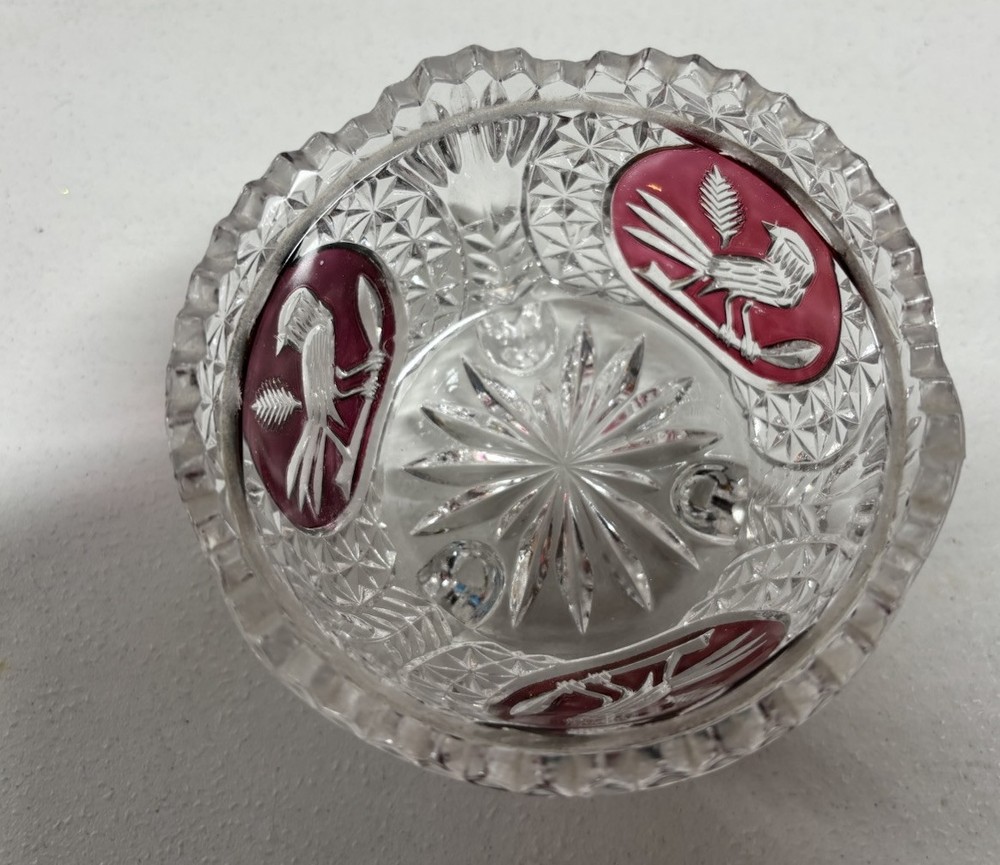 The Nachtmann Amaris Ruby Red Bird Crystal Candy Dish is a vintage piece made in Denmark. Crafted from glass in a round shape, it features a vibrant red color with a bird design, adding a touch of elegance to any space. This candy dish is an original creation by Nachtmann, perfect for serving candies or small treats while also serving as a decorative piece in a home.