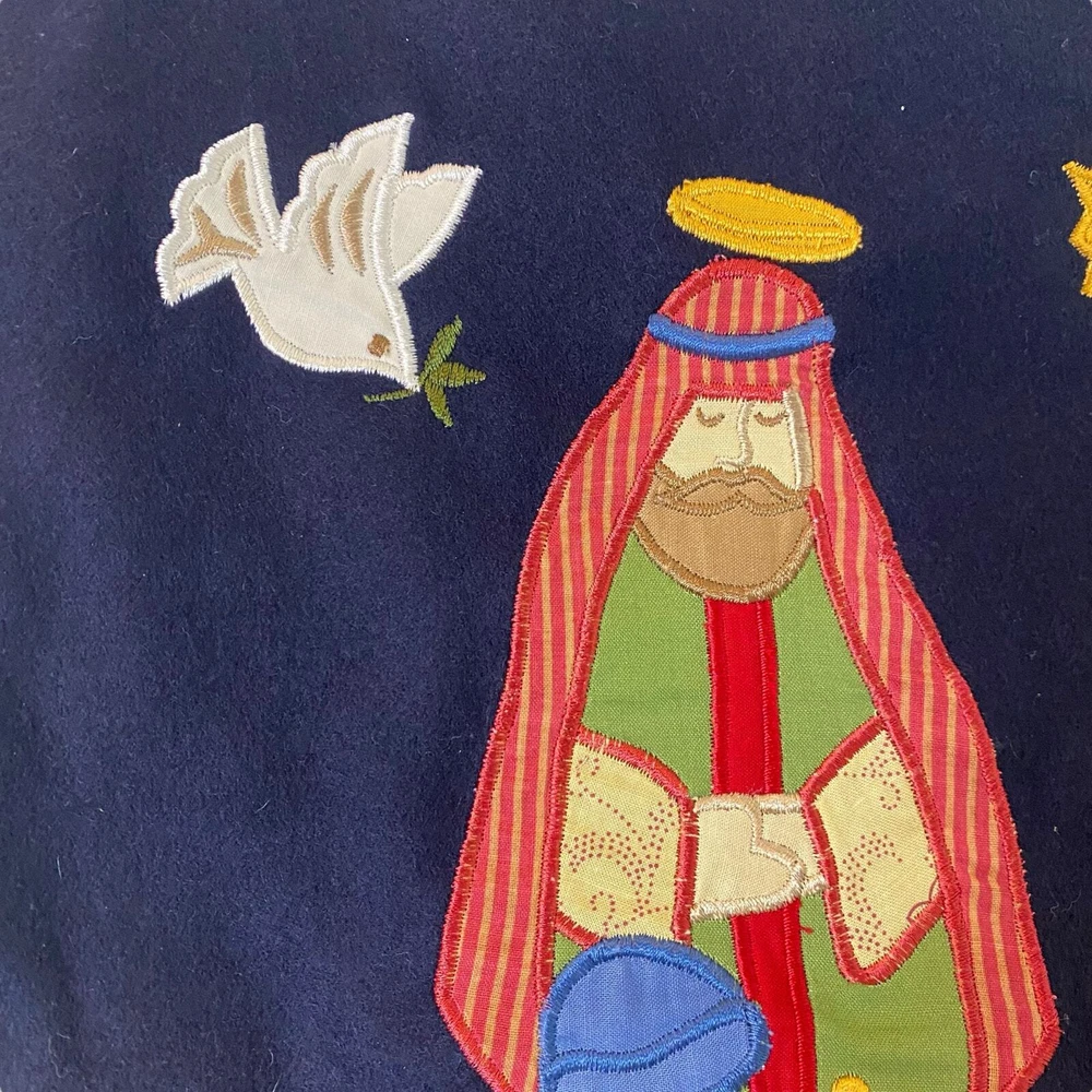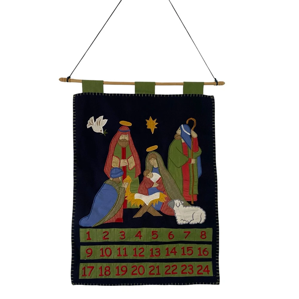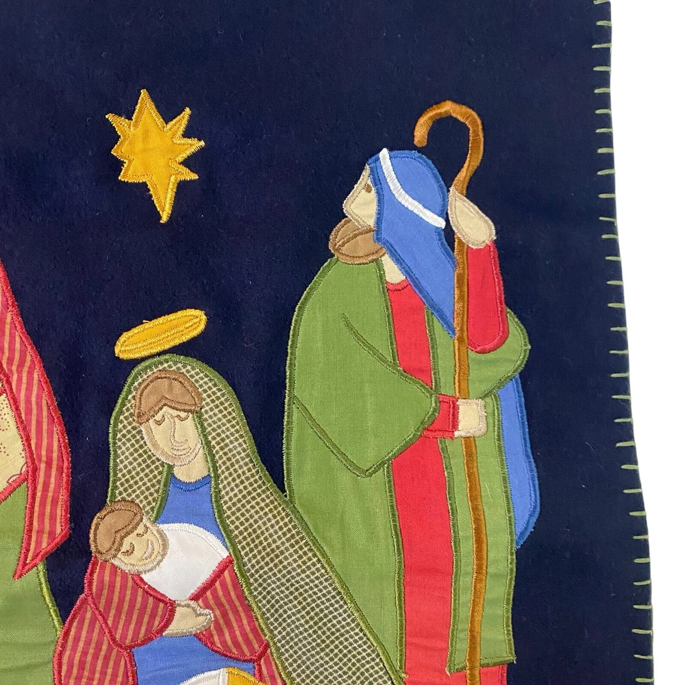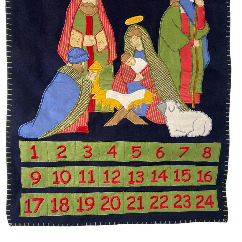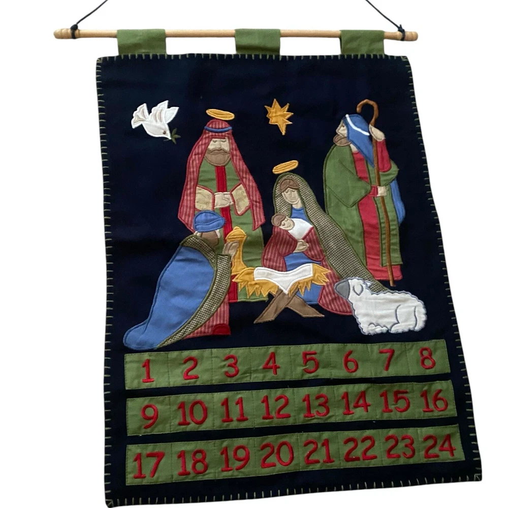 Vintage Nativity Scene Fabric Pocket/Bag Advent Calendar Wall Decor Beautiful embroidered Nativity advent wall hanging calendar. Cotton fabric. Vibrant colors. Lightly used. Color in pics may vary due to lighting and/or monitor settings APPROX. MEASUREMENTS: 16" Wide 21" Tall SHOP POLICIES * All items ship within 1-3 business days (I always try to ship by next business day) * This item is used vintage/pre-loved * Any defects (if any) are noted and shown in the photos * All sales are final * Please review the description/pictures and ask questions before purchasing