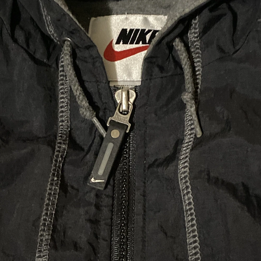 Vintage Nike jacket. Big swoosh on back, embroidered. Size XL. Black with gray accents. No holes or stains.