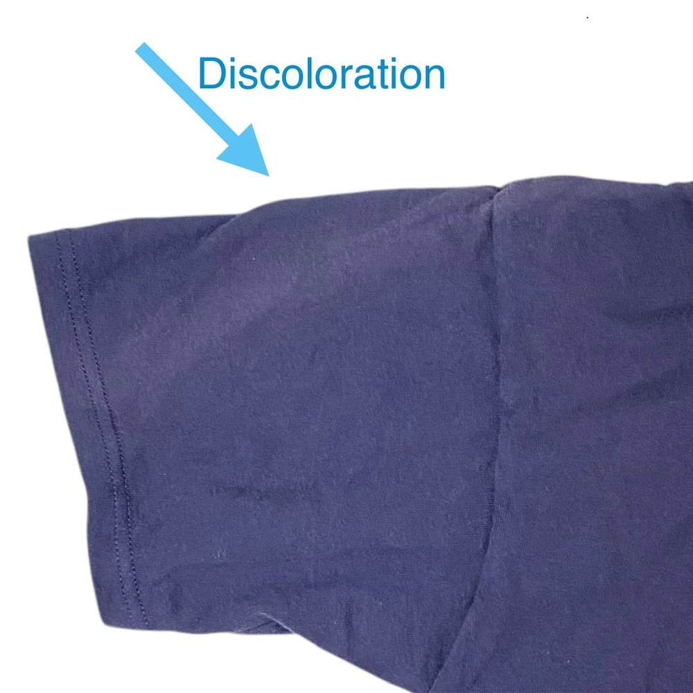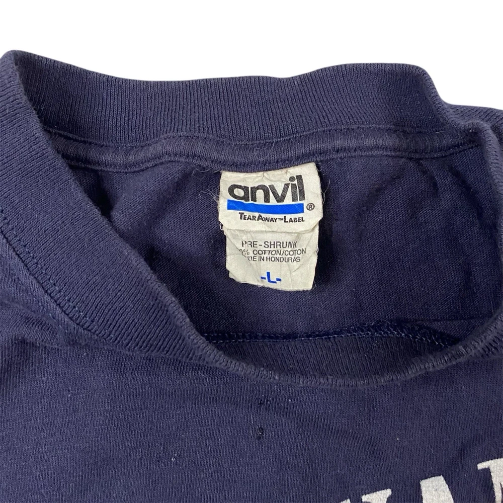 Color: Blue Seller Notes: “Some discoloration and stain.” Type: T-Shirt Sleeve Length: Short Sleeve Size Type: Regular Size: L Department: Unisex Adults Theme: Band Brand: Nirvana Anvil Fit: Regular