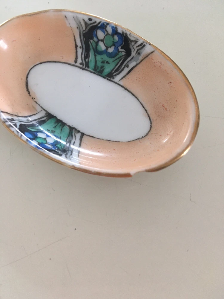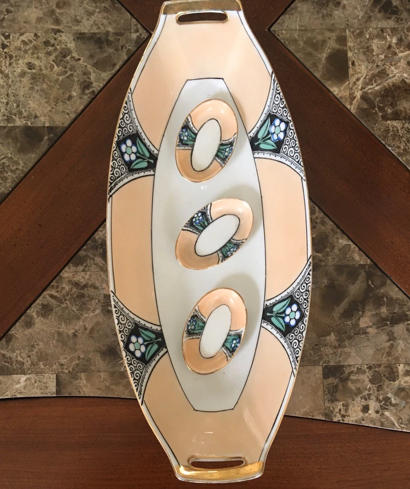 Vintage Noritake Morimura Japan Celery/Relish Dish & 3 Salt Cellars Art Nouveau. Beautifully Retro & Hand painted in pale peach, black & teal on white porcelain. Gold trim. Celery Dish is 12” long, 5 1/8” wide. Salt cellars 2 3/8” long, 1” wide. Preowned/Condition is Used. Please use zoom to see detail & condition. Estate find. Not perfect with some age related wear (one salt cellar has a chip on the bottom rim). Very lovely overall. Shipping in Continental US only. Shipping USPS Ground Advantage.