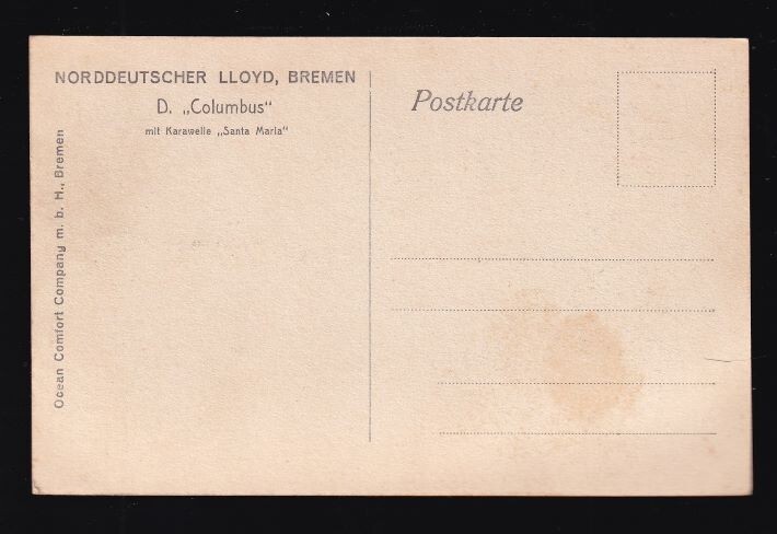[84931] OLD POSTCARD NORTH GERMAN LLOYD D. "COLUMBUS" ; NOT POSTALLY USED; IN VERY GOOD CONDITION with slightly soft corners. PAYMENT to be received and collected within 24 hours OF END OF AUCTION. International Buyers – Please Note: Import duties, taxes and charges are not included in the item price or shipping charges. These charges are the buyer's responsibility. Please check with your country's customs office to determine what these additional costs will be prior to bidding/buying. These charges are normally collected by the delivering freight (shipping) company or when you pick the item up – do not confuse them for additional shipping charges. We do not mark merchandise values below value or mark items as "gifts" - US and International government regulations prohibit such behavior.