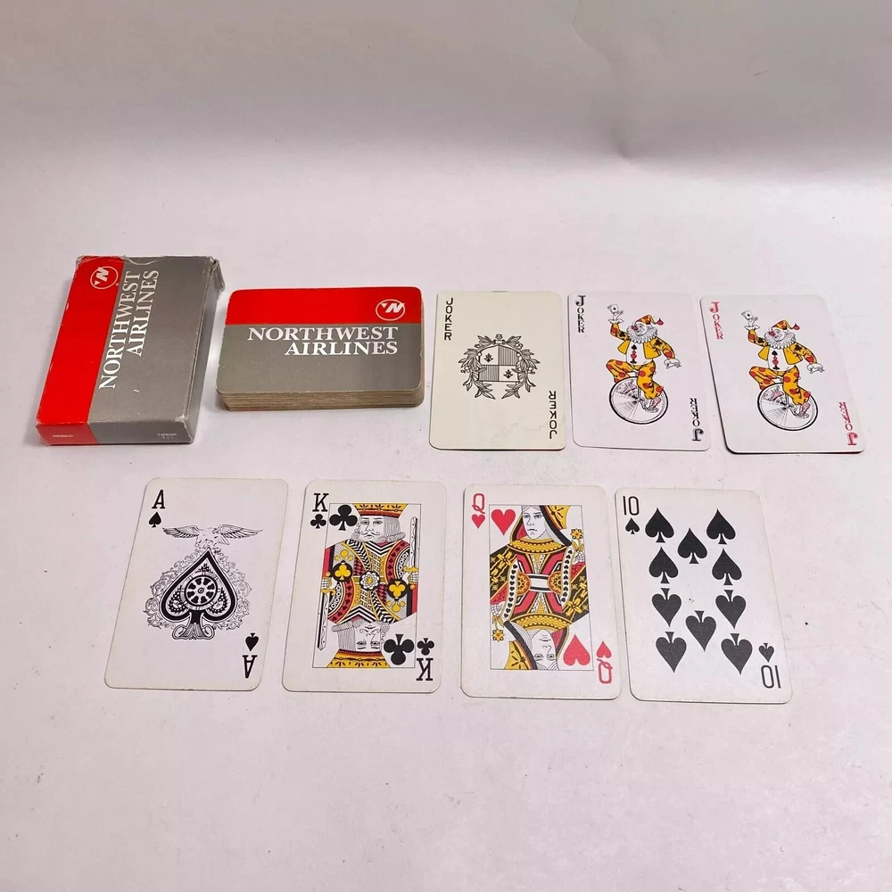 Country/Region of Manufacture:United StatesFeatured Refinements:Airlines Playing CardsBrand:Northwest AirlinesSeller Notes:“Complete 52 card deck plus 3 jokers. Photos show the actual items you will receive.”Age:Modern (1970-Now)Theme:Transportation