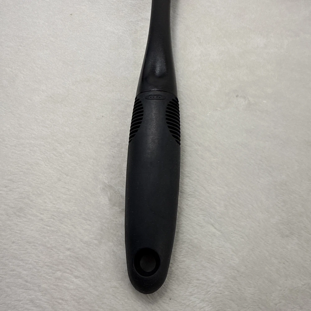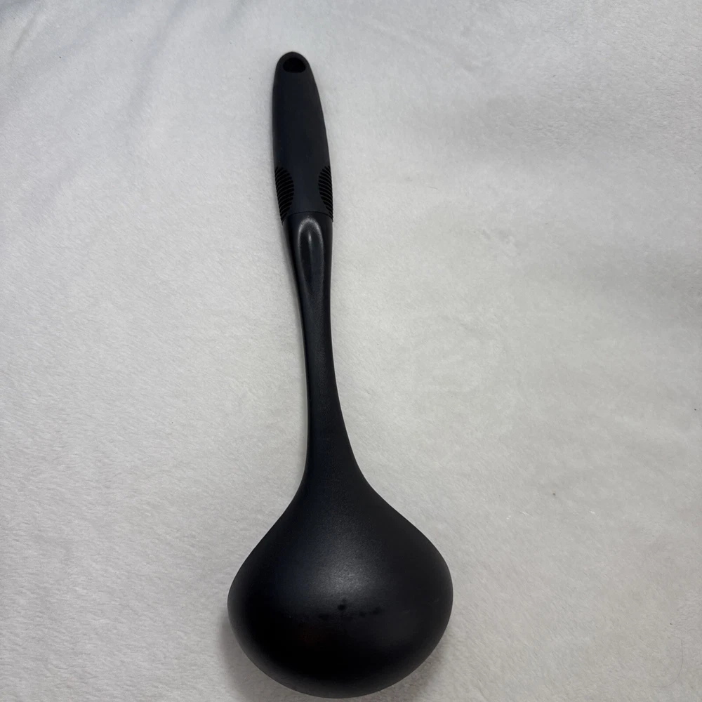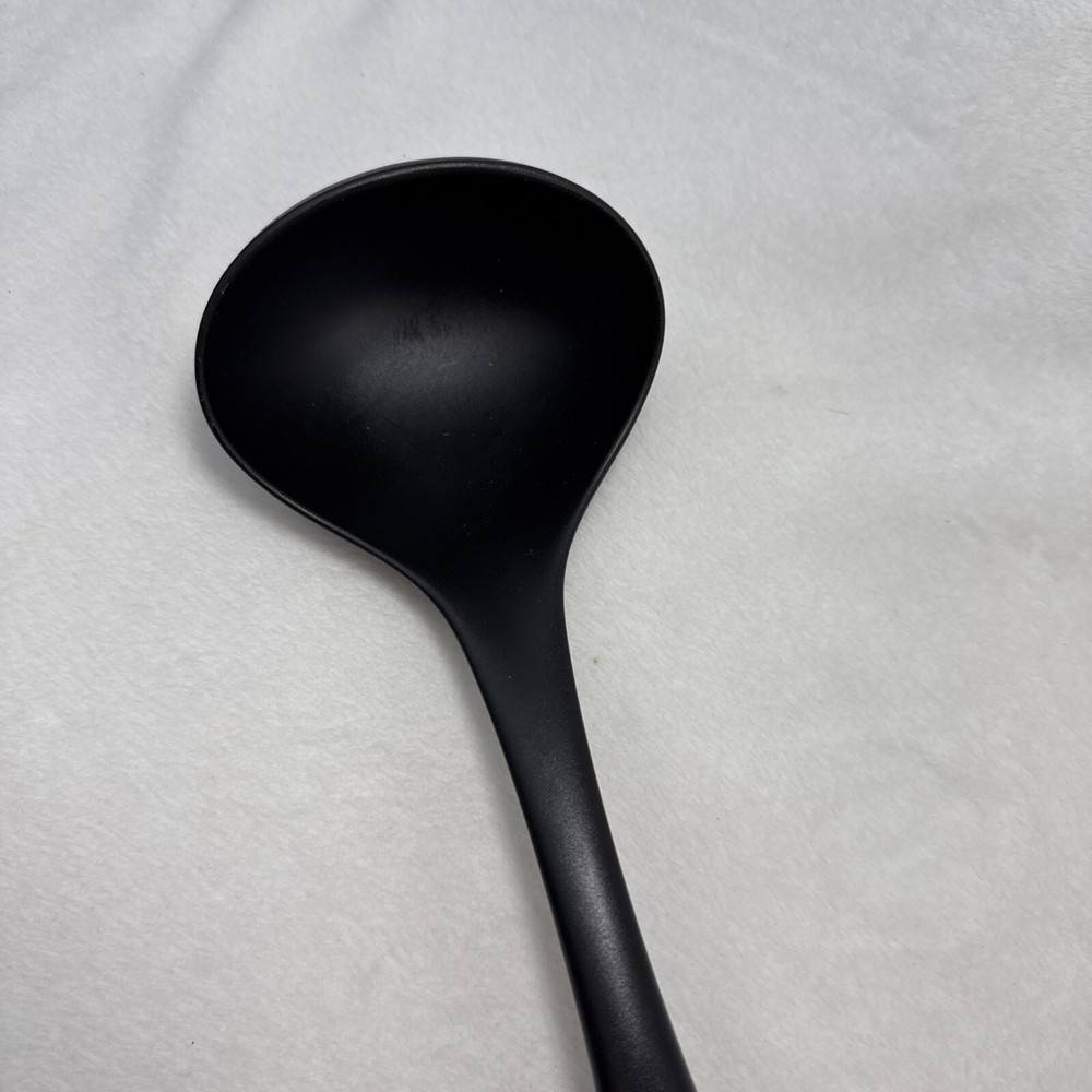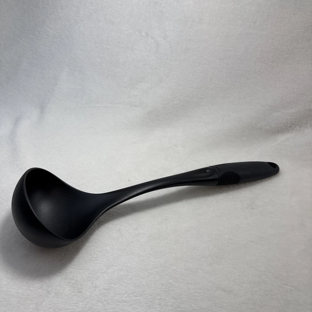 Vintage OXO Good Grips Black Nylon Soup Ladle with a soft comfortable grip. This soup ladle is solid black in color and made of plastic with a nylon handle. It is dishwasher safe and designed by the brand OXO. The set includes one soup ladle perfect for serving soups and stews.
