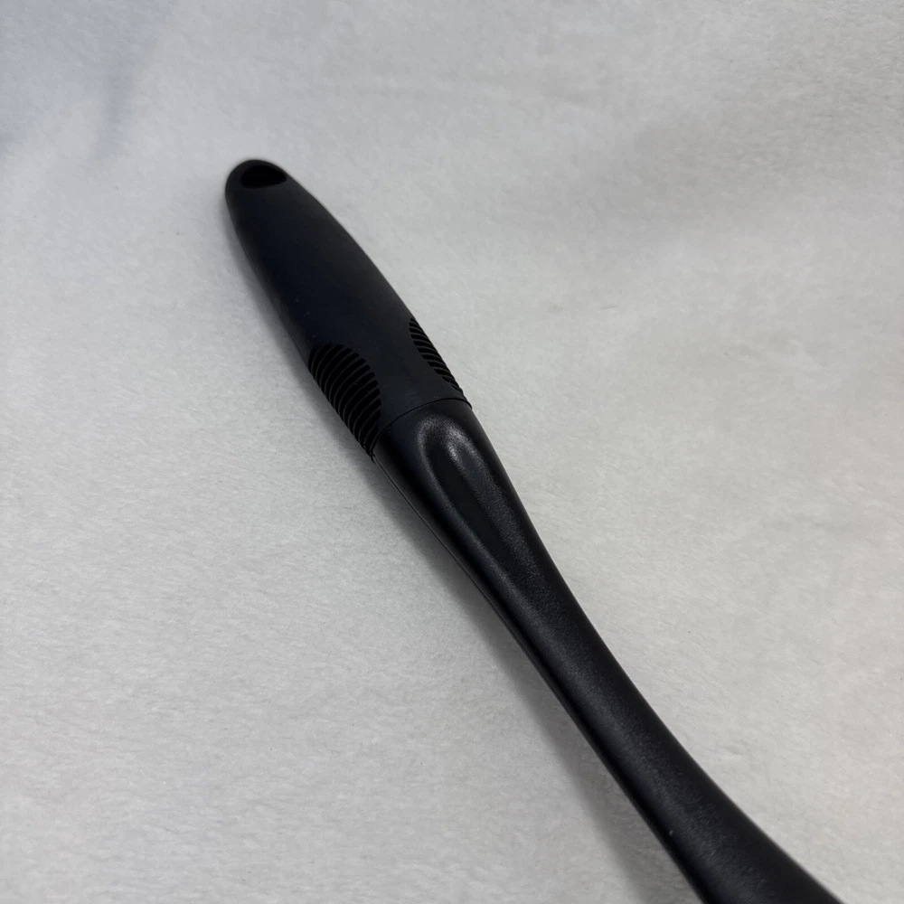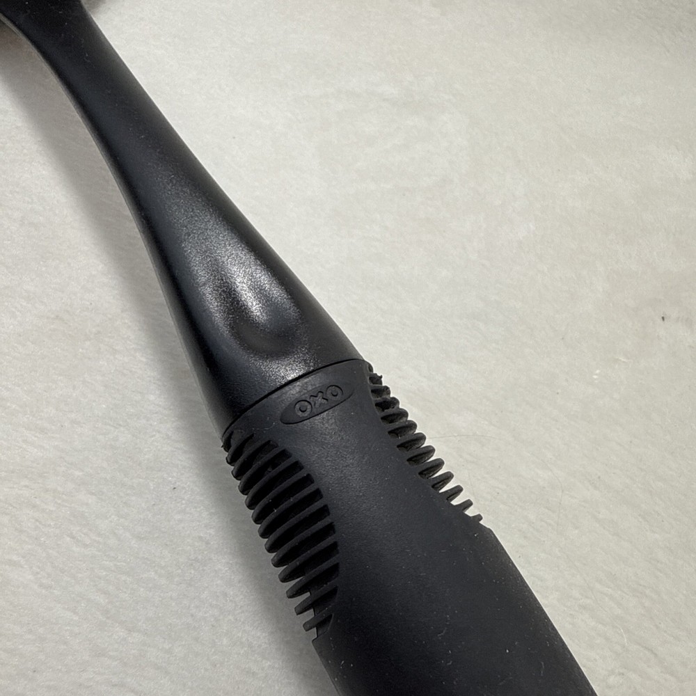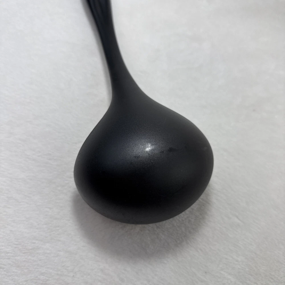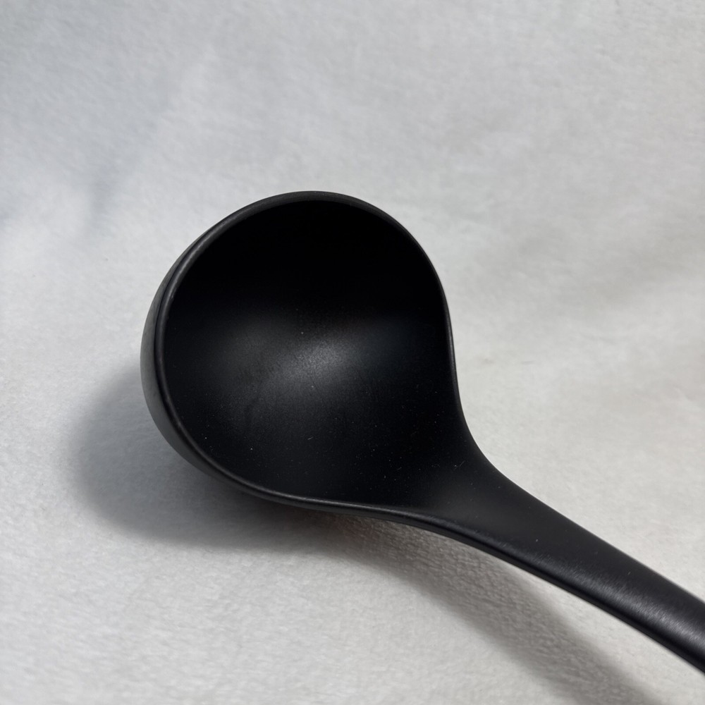 Vintage OXO Good Grips Black Nylon Soup Ladle with a soft comfortable grip. This soup ladle is solid black in color and made of plastic with a nylon handle. It is dishwasher safe and designed by the brand OXO. The set includes one soup ladle perfect for serving soups and stews.