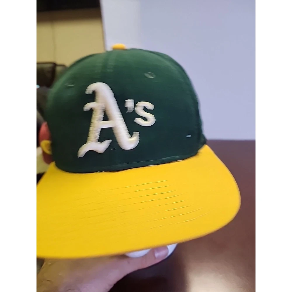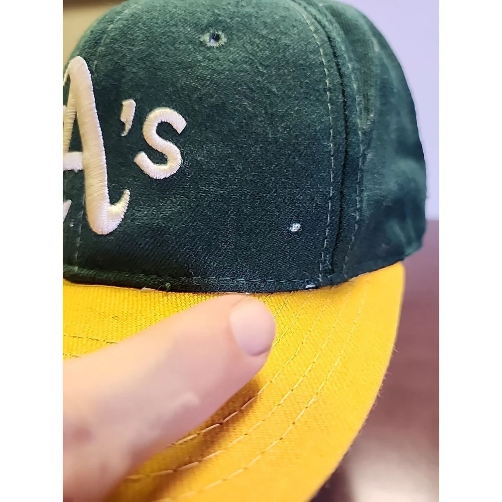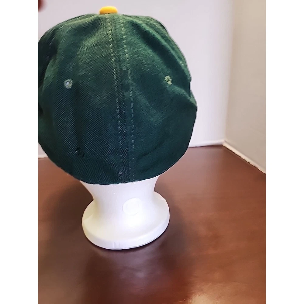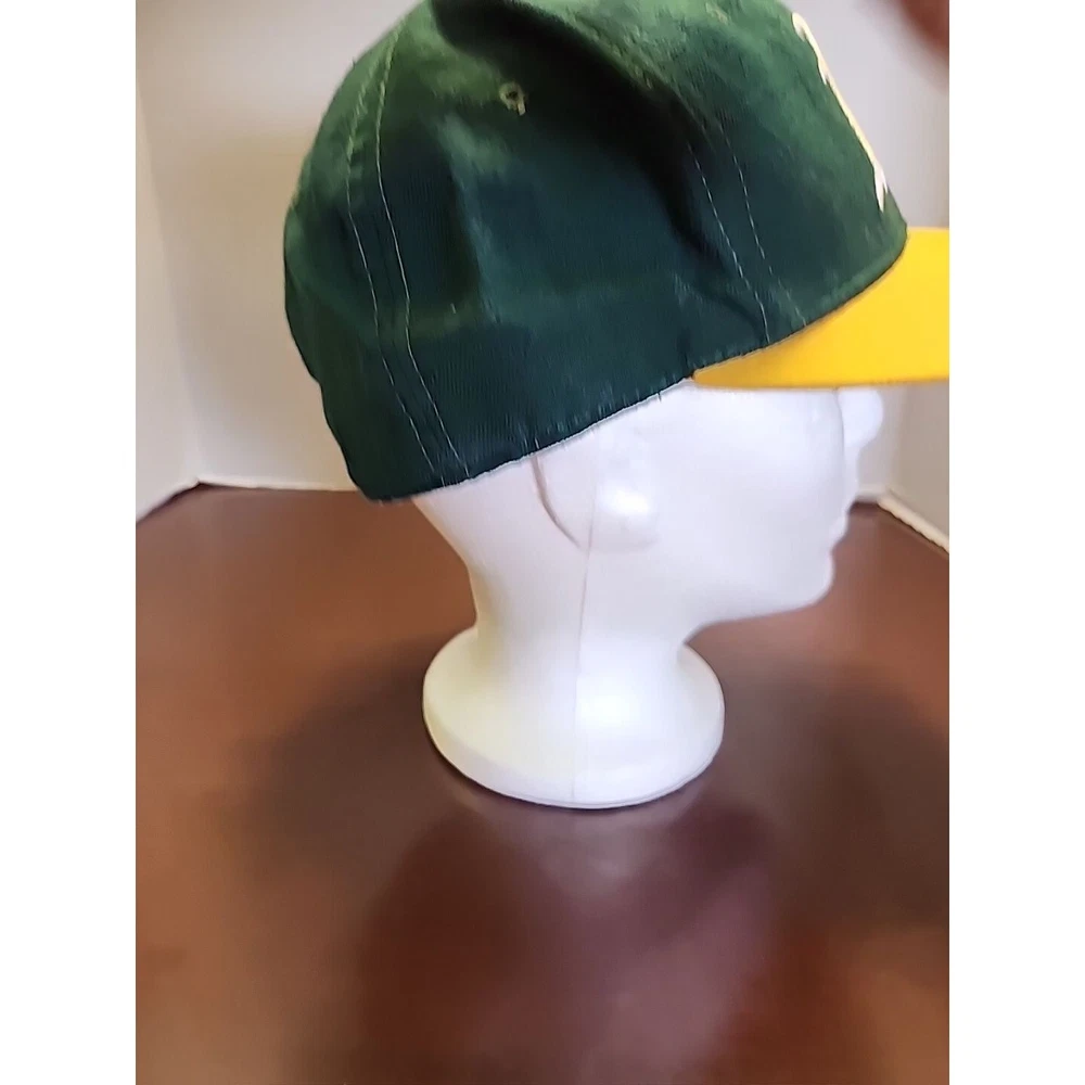Show your team spirit with this vintage Oakland A's baseball cap in green and yellow. Ideal for fans and collectors alike. • Green cap with yellow brim • Embroidered A's logo on front • Adjustable fit • Vintage design Minor wear and small holes on the back and side.