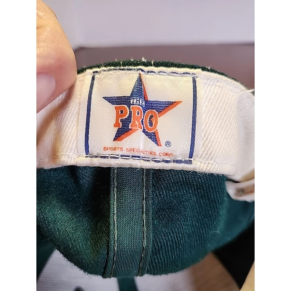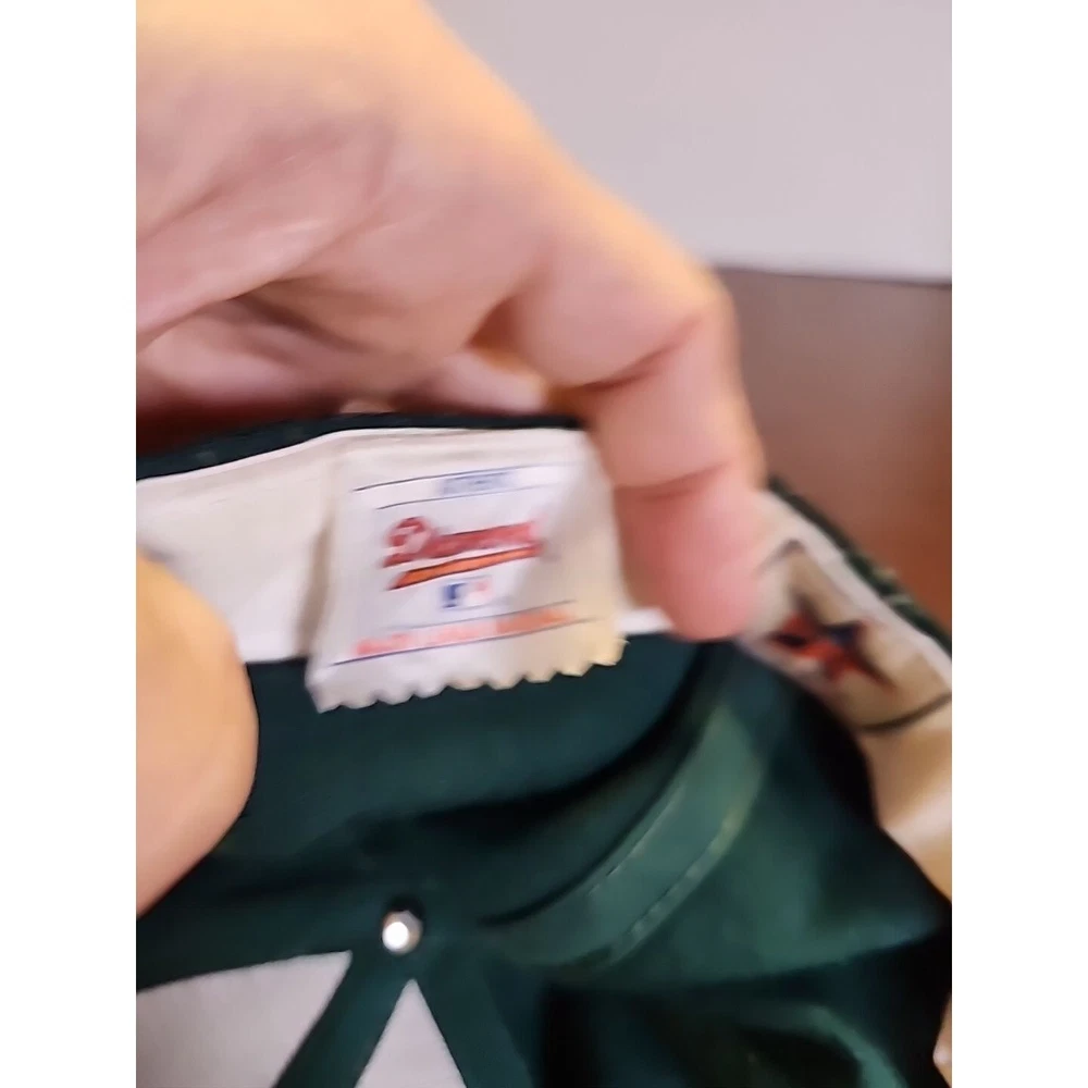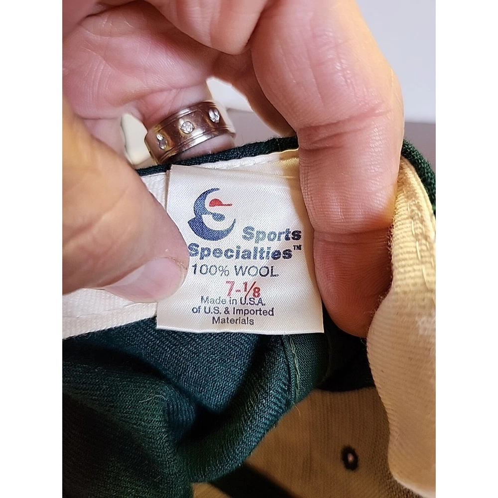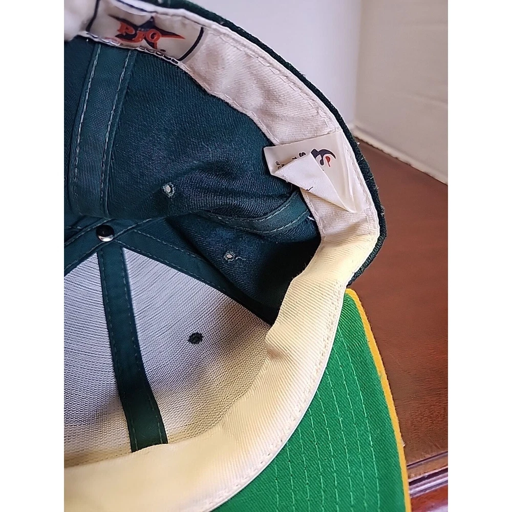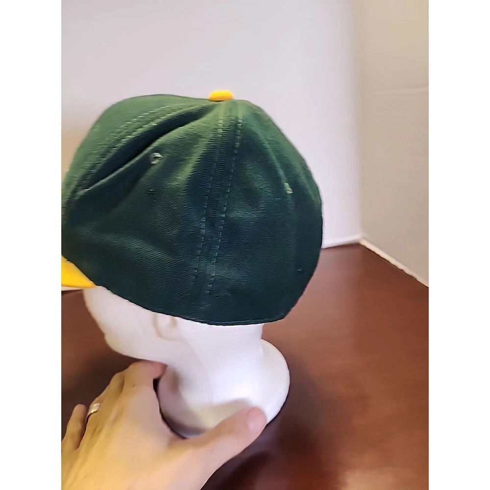 Show your team spirit with this vintage Oakland A's baseball cap in green and yellow. Ideal for fans and collectors alike. • Green cap with yellow brim • Embroidered A's logo on front • Adjustable fit • Vintage design Minor wear and small holes on the back and side.