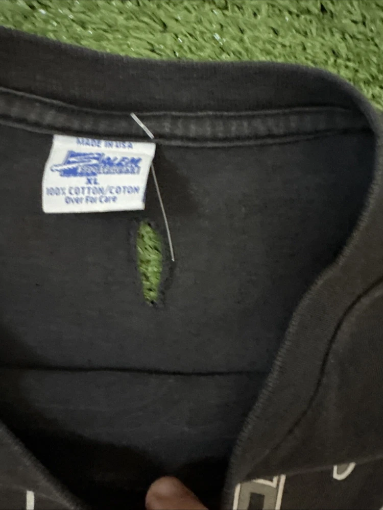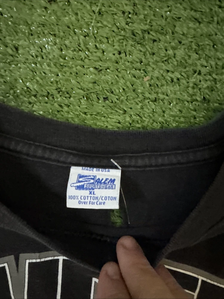 Capture the essence of the '90s with this Vintage Oakland Raiders NFL Salem Sportswear 1992 BIG Helmet T-Shirt. Black in color and sized XL, it's a classic piece of sports apparel that brings a touch of nostalgia to any wardrobe. The shirt features a distinctive graphic print with the iconic Raiders logo, catering to fans and vintage fashion enthusiasts alike. Constructed in the United States, this T-shirt is made from comfortable cotton material and designed with a traditional crew neck and short sleeves. Its regular fit ensures ease of movement, while the easy-care fabric allows for hassle-free maintenance. Ideal for all seasons, it's a timeless addition to your collection. Measurements 24x28