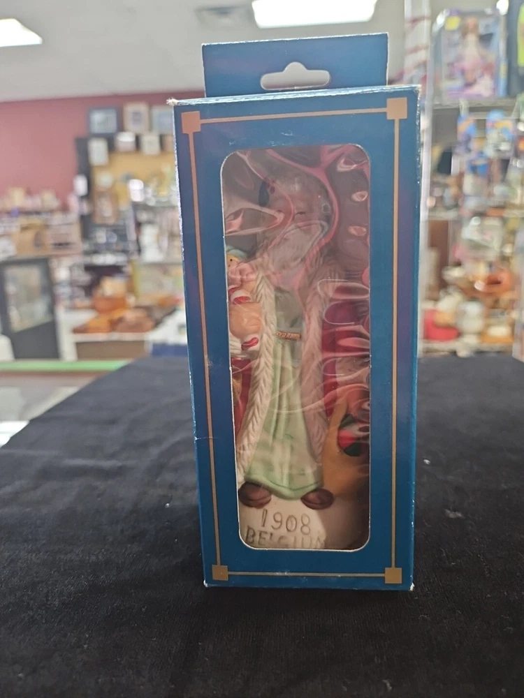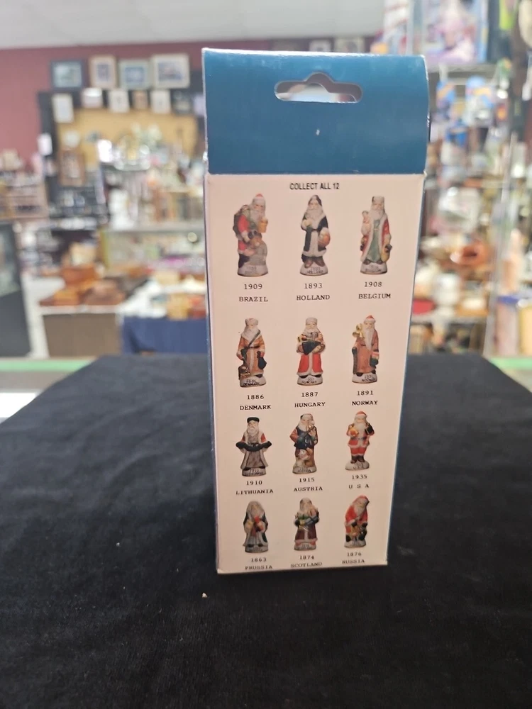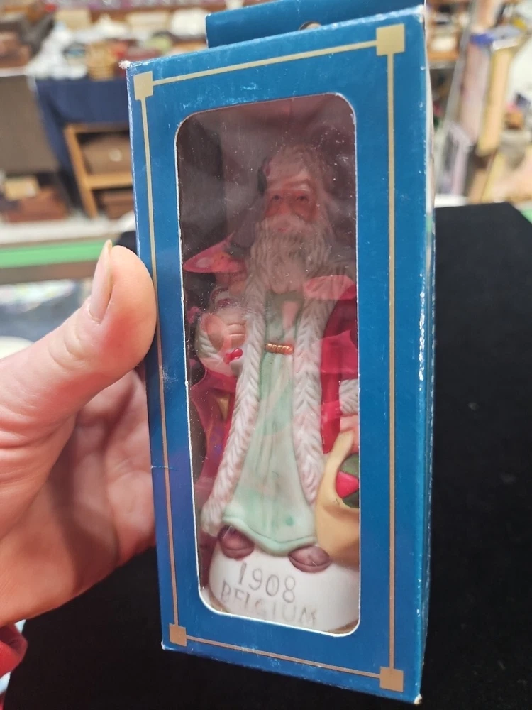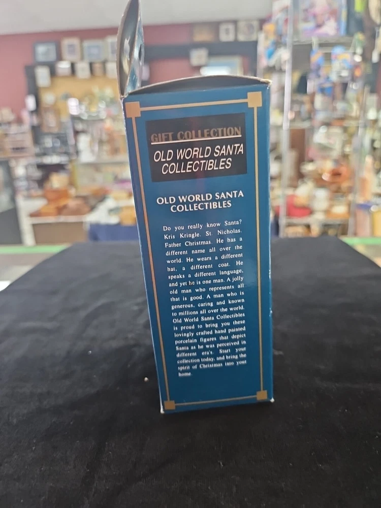 This is a vintage Santa figurine made of porcelain. It features a multicolor design and is part of a limited edition collection. The figurine is in its original box and is a licensed reproduction from the late 20th century. It measures 5 inches in height, 5 inches in length, and 2 inches in width. The Santa figurine is a great addition to any Christmas collection and is perfect for adults.