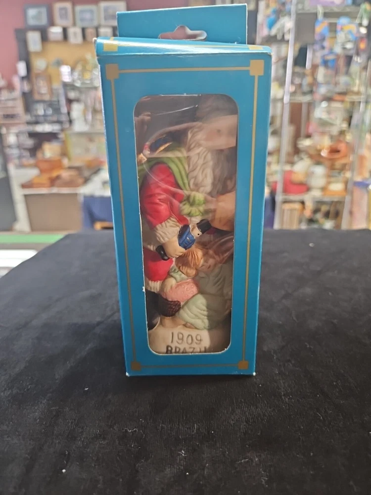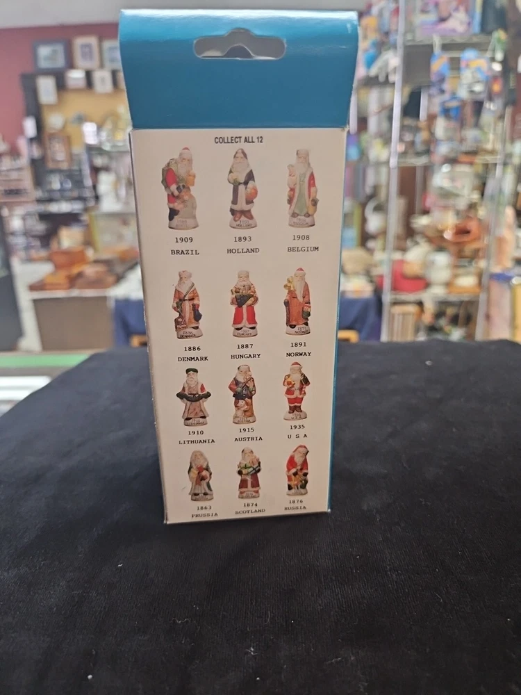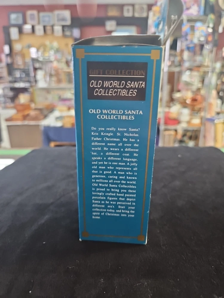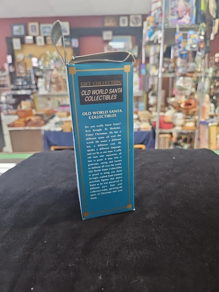This is a vintage Santa figurine from the Limited Editions collection by Old World Collectibles. The figurine features a traditional Santa in bisque finish with multicolor details. It measures 5 inches in height and 2 inches in width, and is made of porcelain. The figurine comes in a box and is a licensed reproduction from the late 20th century.