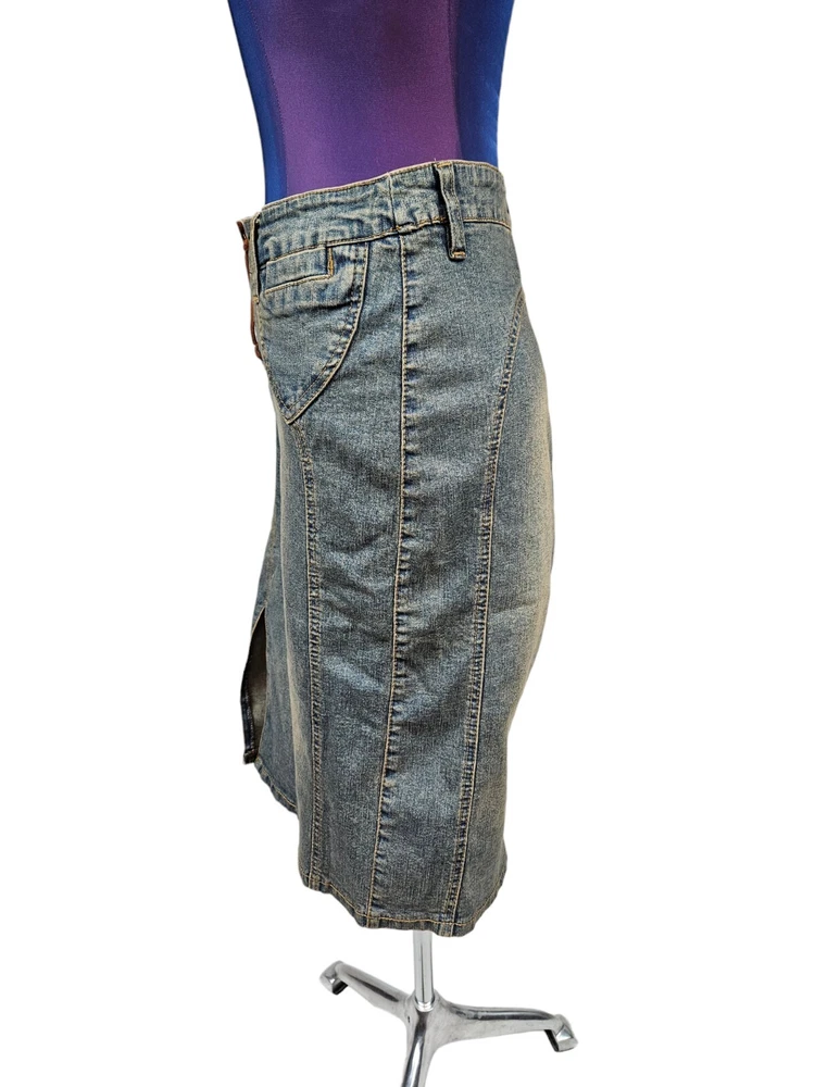 Vintage One Tuff Babe Y2K Corset Lace Up Front Slit Jean Midi Skirt Size 5/6 H39 In excellent condition Vintage One Tuff Babe Y2K Corset Lace Up Front Slit Jean Midi Skirt Size 5/6 Juniors Features 90s Y2K style vintage OTB One Tuff Babe faded medium wash denim jean skirt, corset lace up closure, mid rise, 2 small coin pockets, front slit, stretch, exposed seams, 90s vibes. Measurements laying flat waist 14" hips 18" length 21.5" Fabric cotton, spandex This is a pre-owned item that may show signs of wear. In excellent condition, no flaws.