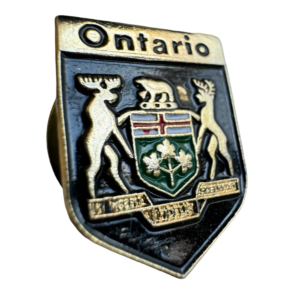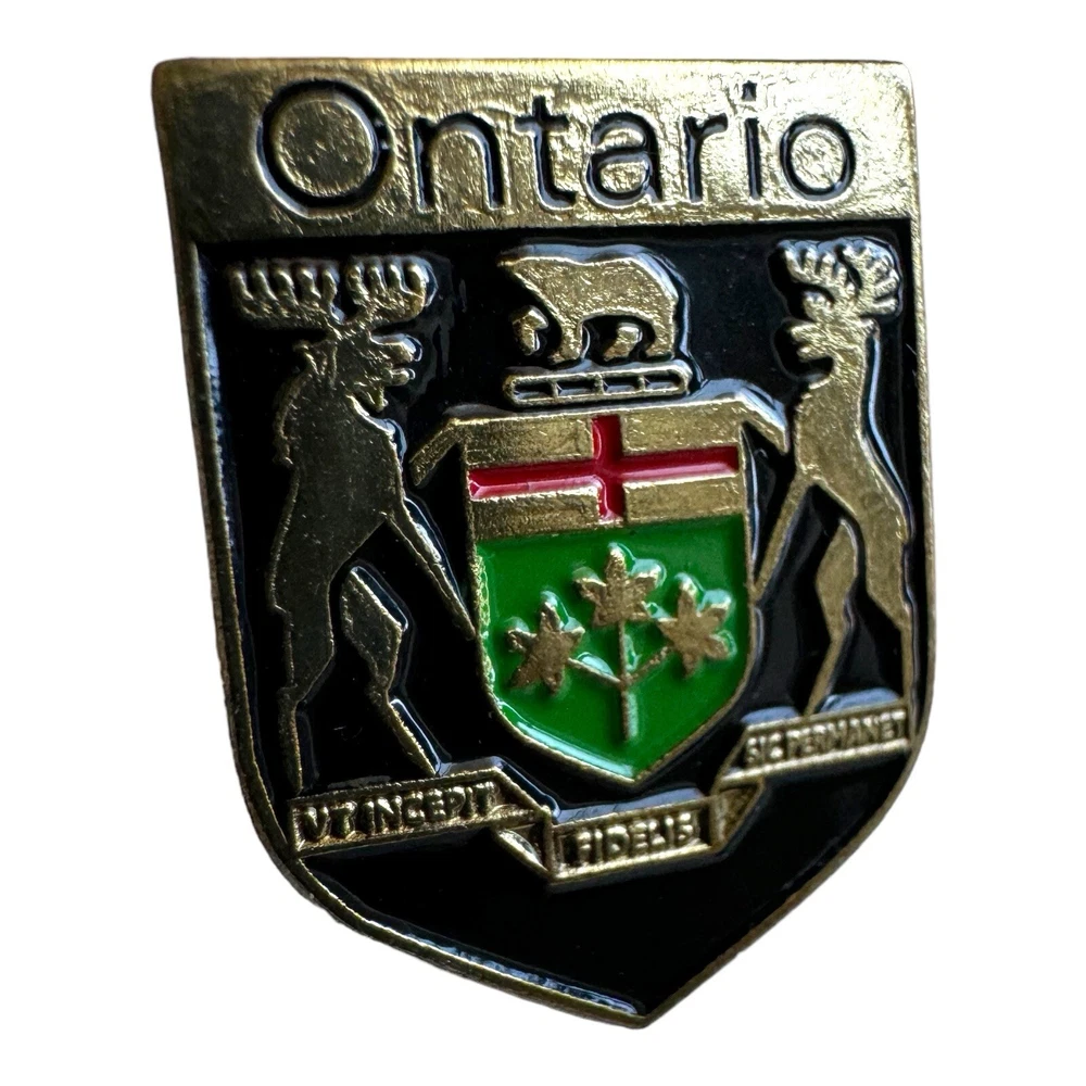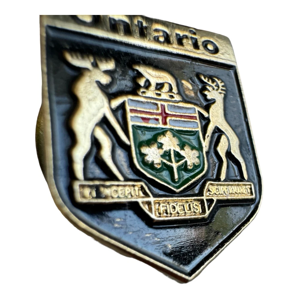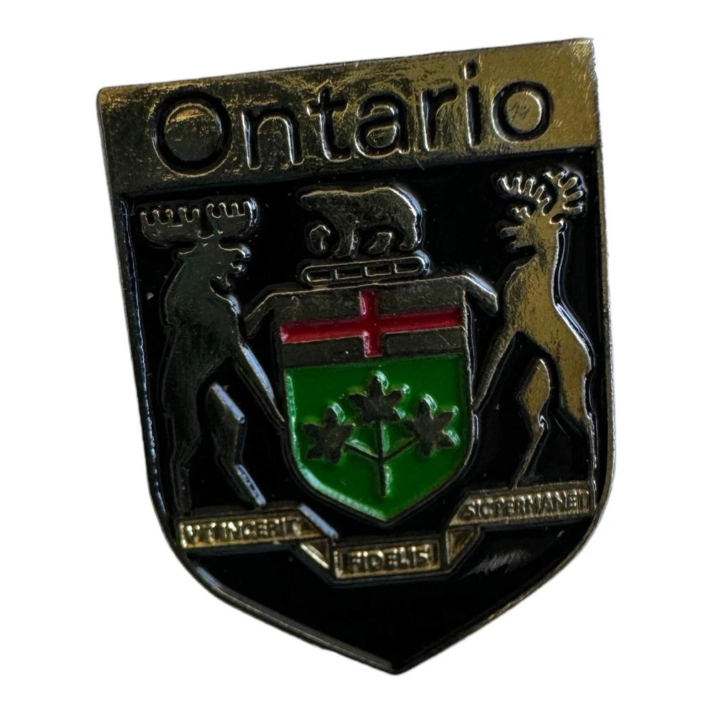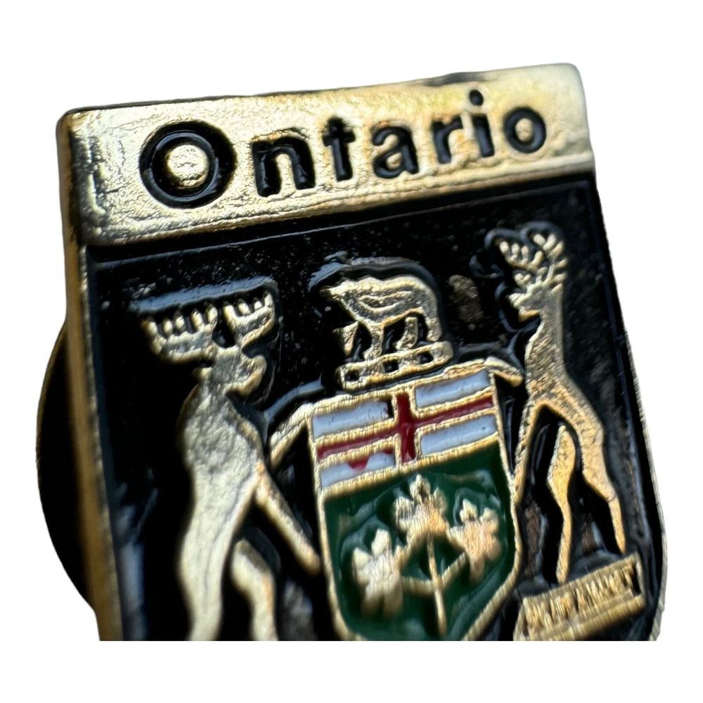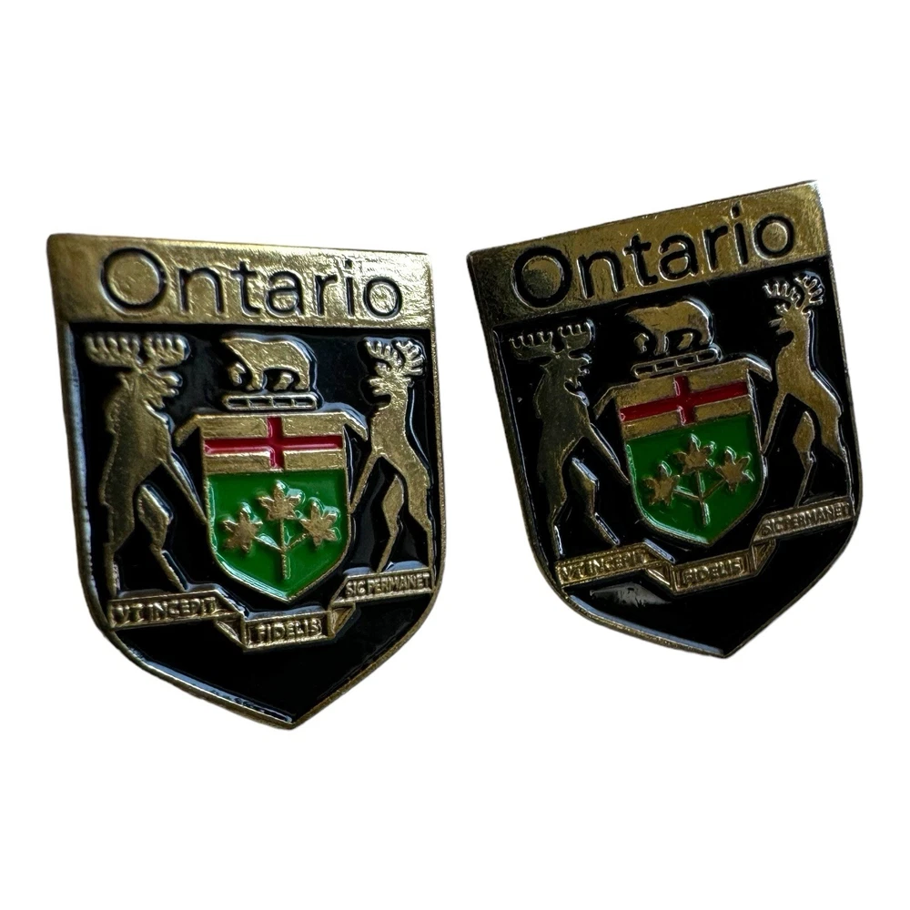 This set of two vintage Ontario Provincial Coat of Arms lapel pins is a beautifully crafted pair of enamel badges featuring the iconic symbols of Ontario, Canada. These pins are a great piece of Canadian historical memorabilia, ideal for collectors or as a thoughtful gift for someone with ties to Ontario. Key Features: • Type: Lapel pin badges • Design: Ontario Provincial Coat of Arms • Material: Metal with enamel finish • Features: Detailed depiction of the moose, deer, bear, and maple leaves • Condition: Excellent vintage condition with secure pin backs • Dimensions: Standard lapel pin size