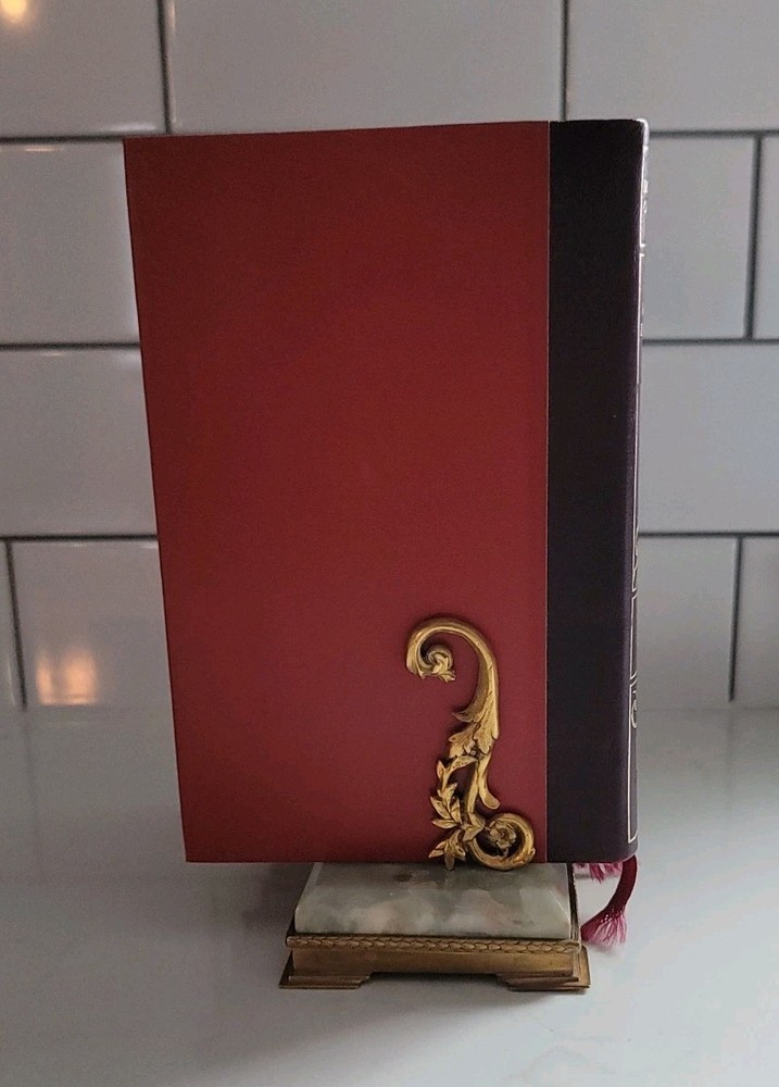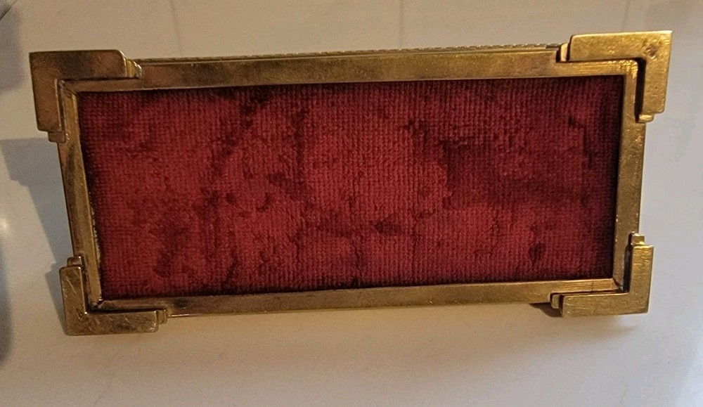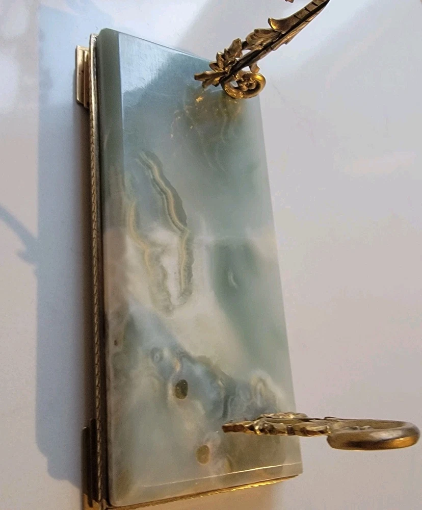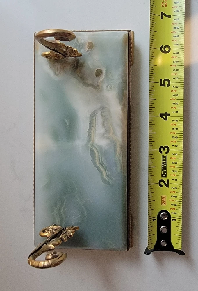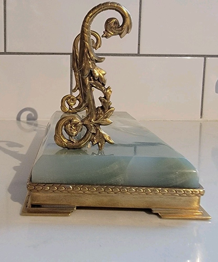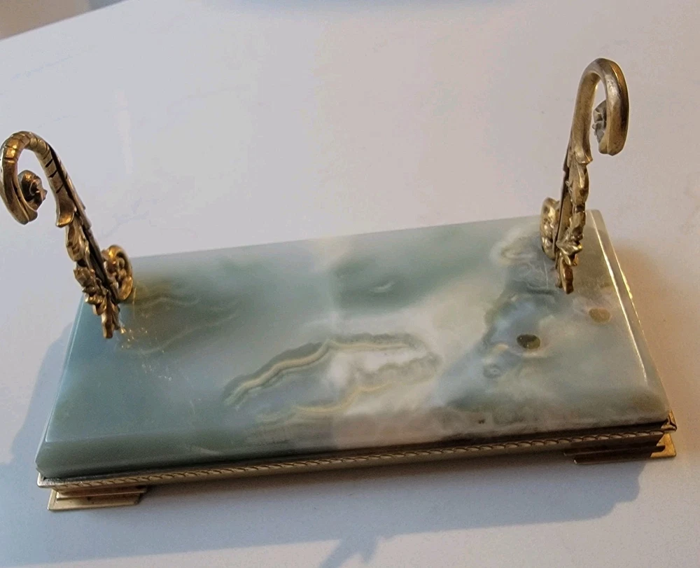 Elegant vintage Art Deco / Hollywood Regency onyx and brass letter holder / book rack, dating from approximately the 1920s–1950s. The piece features a heavy green/blue onyx stone base with beautiful natural veining and two ornate Rococo-style brass scroll arms. Perfect for holding letters, mail, postcards, notebooks, or small books. A stylish and eye-catching desk accessory for collectors and lovers of vintage décor. Features: Genuine green/blue onyx stone base Ornate brass scrollwork with floral/acanthus details Art Deco to mid-century Hollywood Regency style Heavy and stable – excellent for books or mail Beautiful decorative accent for office, library, vanity or entryway Condition: Very good vintage condition with minor brass patina consistent with age. Onyx is intact with natural mineral variations. Very functional.