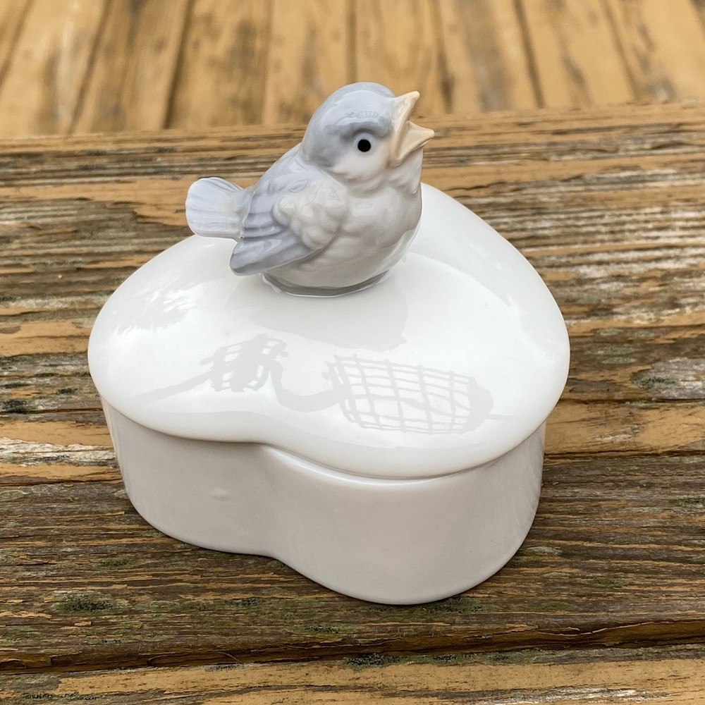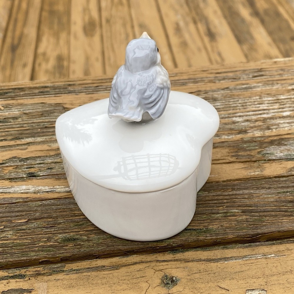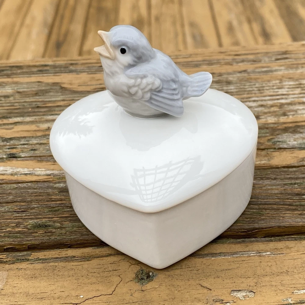 Vintage Otagiri Porcelain Heart Trinket Box Gray Figural Bird on Lid Japan. 3” wide. 3.5” tall No chips, cracks or crazing Sweet Trinket Box Cute! Great addition to a gift basket.
