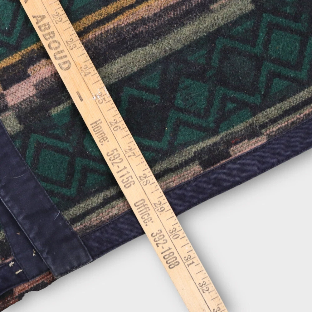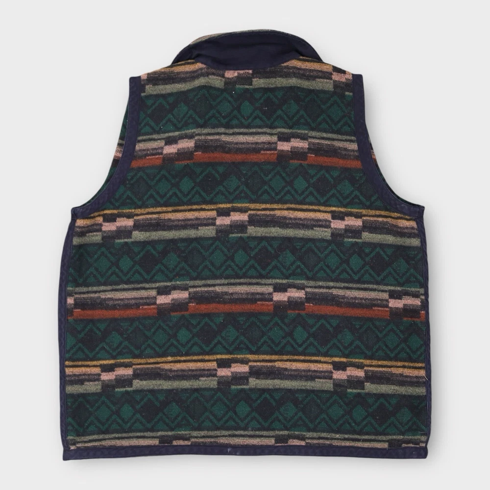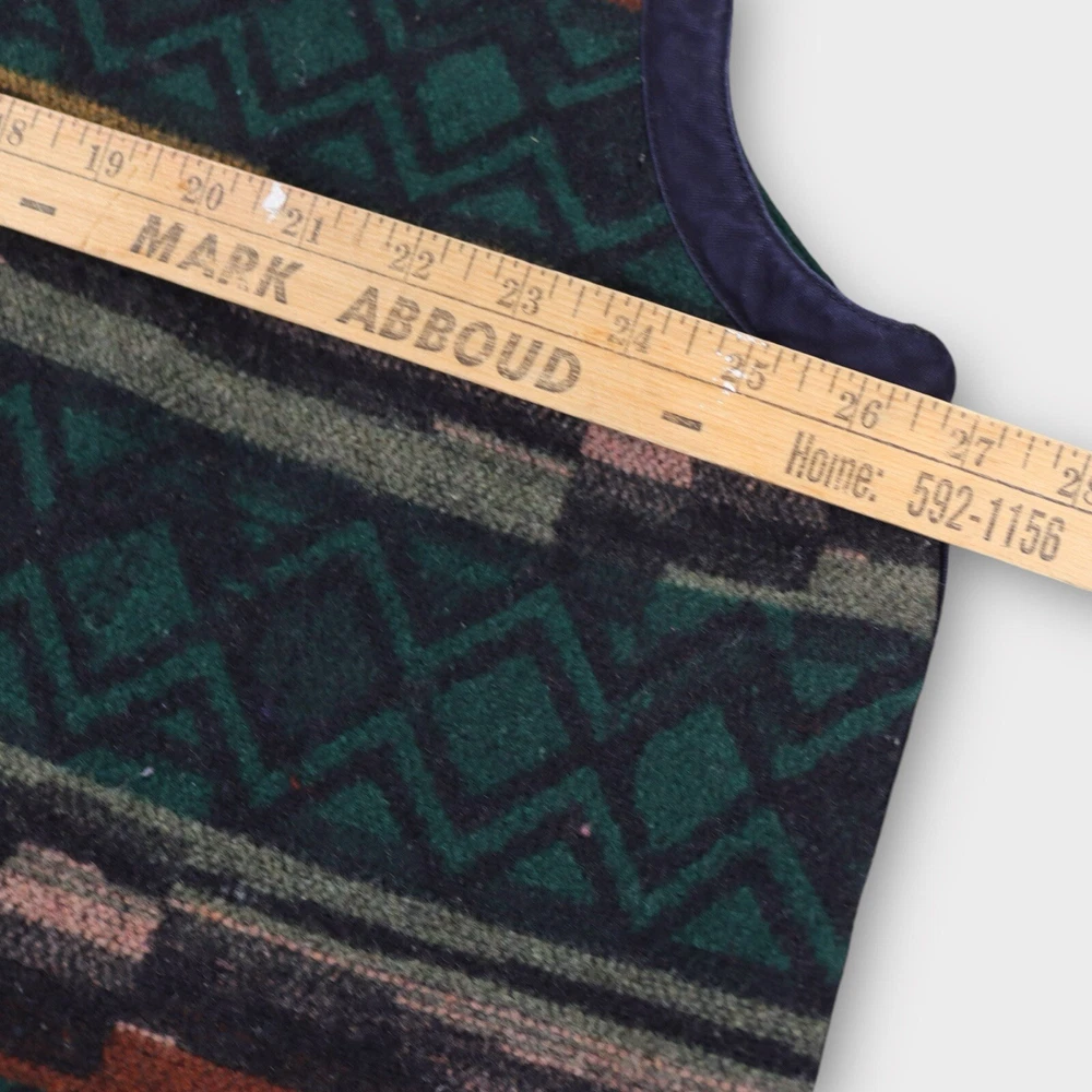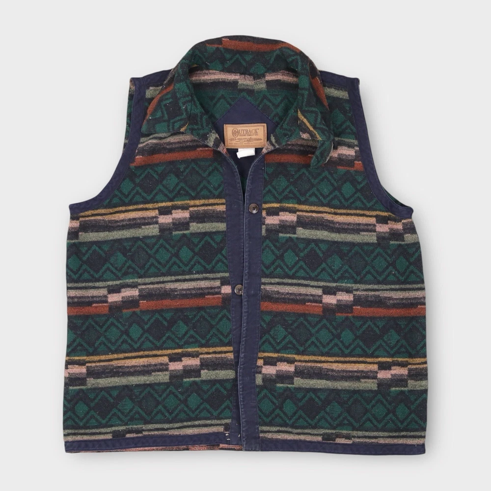 This vintage vest from Outback Trading Company is a must-have for any fashion-conscious man. With a spread collar and button closure, it's perfect for both casual and workwear occasions. The vest is made from a lightweight and breathable triblend fabric with a geometric pattern in multicolor, making it a great addition to any wardrobe. Featuring a mid-length jacket/coat style, this vest has a regular fit and is available in size 2XL. The lining material is polyester, and the insulation material is wool. The vest is machine washable and suitable for winter, fall, and spring seasons. This Outback Trading Company vest is a great choice for those who want to go for a Western, Aztec, cowboy, or outdoor theme. Tag Size: N/A Best Fit: * Men: 2XL Approximate Flat Measurements: * Chest: 27” * Length: 30” * Material: 70% Cotton 30% Wool Condition: Missing three buttons All items are second hand, many being vintage and may have small imperfections. Anything major is noted.