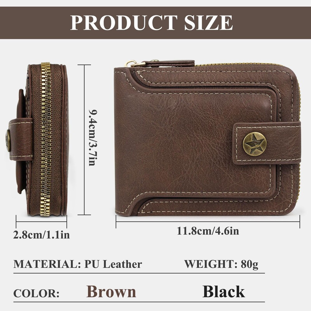 Materials: Our men wallet card holder is made of PU leather, and the thickened materials are not easy to wear, the texture is clear, the surface is smooth, and it is not easy to fade, and its performance can still be maintained after long-term use Large Capacity: The zipper wallets for men adopt a practical multi-card slot design, including 8 card slots, a coin snap pocket, and a large cash slot, which has sufficient storage space to meet your daily needs Snap and Zipper: DesignThe surface of men's wallet leather has a simple retro snap and a hardware zipper, which can effectively prevent the items stored in your wallet from slipping or losing, which is very fashionable and practical Easy to Carry: The size of a card holder wallet is about 12*9.5*3cm/ 4.73*3.74*1.18inch, which is small and will not take up space. You will not have any burden when you put it in your clothes pocket, and it is easy to carry Wide Application: This men's trifold wallet is very suitable for storing credit cards, cash, change, bills, etc., suitable for men of all ages and various occasions, and is an ideal choice for giving presents to your father and male friends