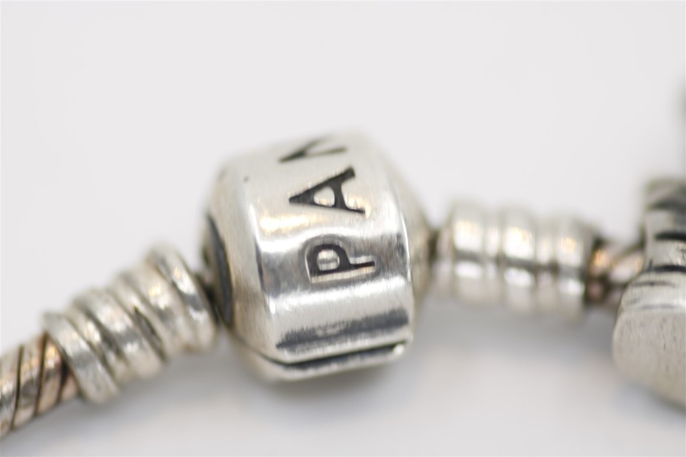 Vintage sterling silver Pandora charm bracelet with seventeen charms. Standard Pandora clasp. Stamped 925 (Sterling Silver). 8" long. 69.6 grams. NG01215 Item As Is. All stones not identified unless clarified above. All items are pre-owned and pre-loved. Stones may show minor nicks and abrasions or small signs of wear. Diamonds are graded using GIA standards by GIA Graduates. Diamond and gemstone weight is estimated by formula. The metal is stamped or identified by acid testing and/or XRF alloy analyzer gun. All items shipped USPS First Class, Signature Required Items over $1000 ship overnight, Signature Required Please message with any questions. We are available Monday through Saturday 10am to 6pm. Powered by SixBit's eCommerce Solution