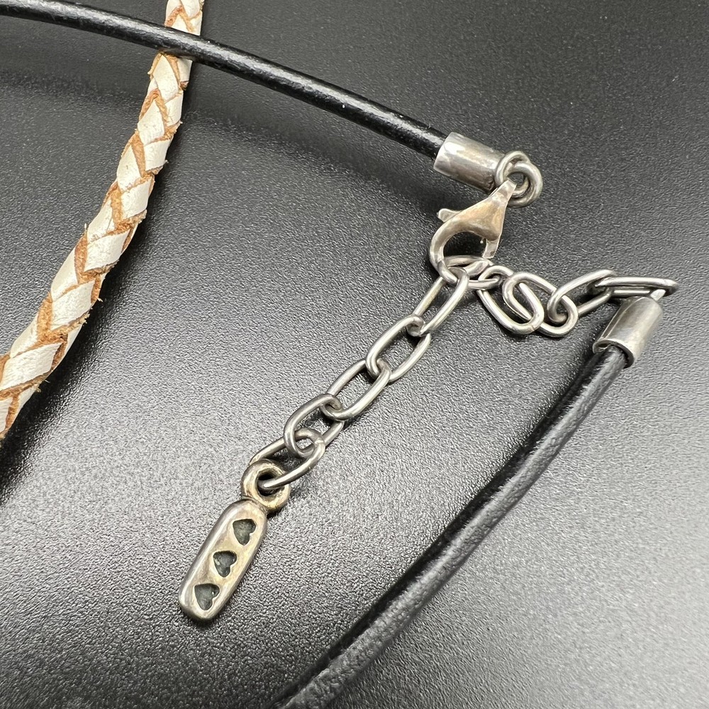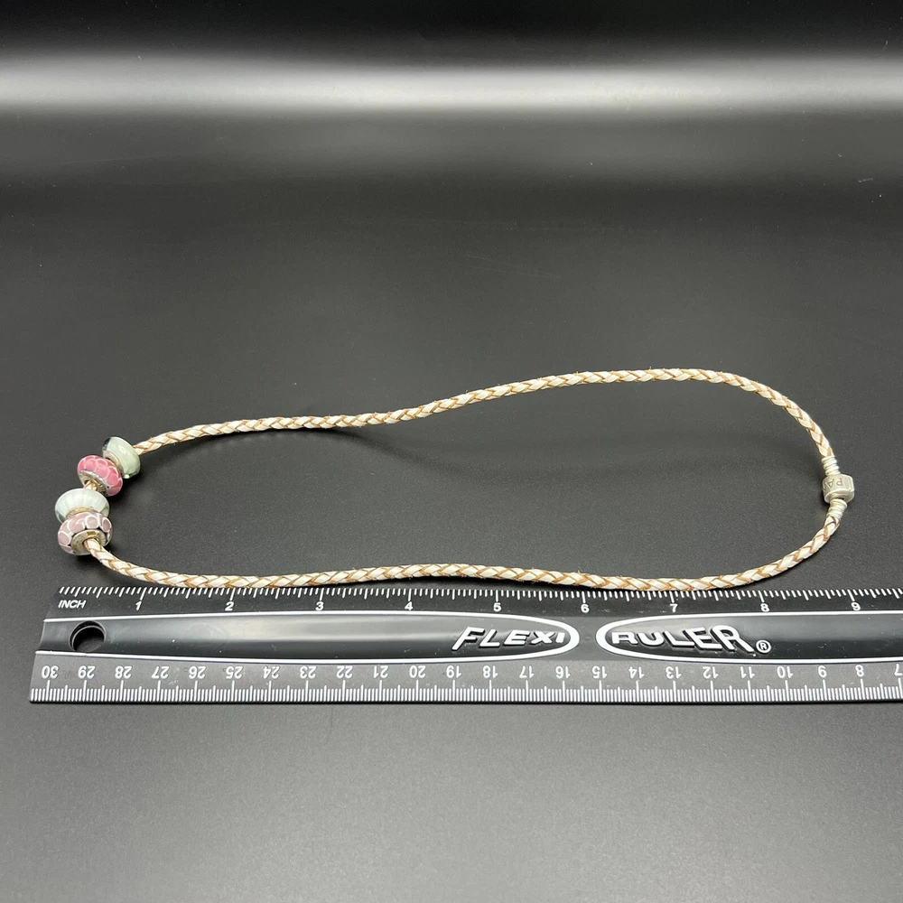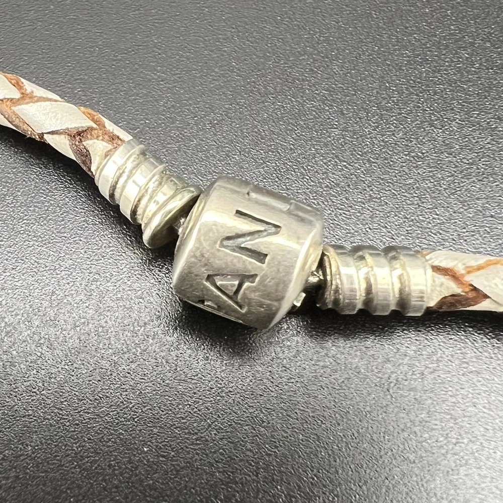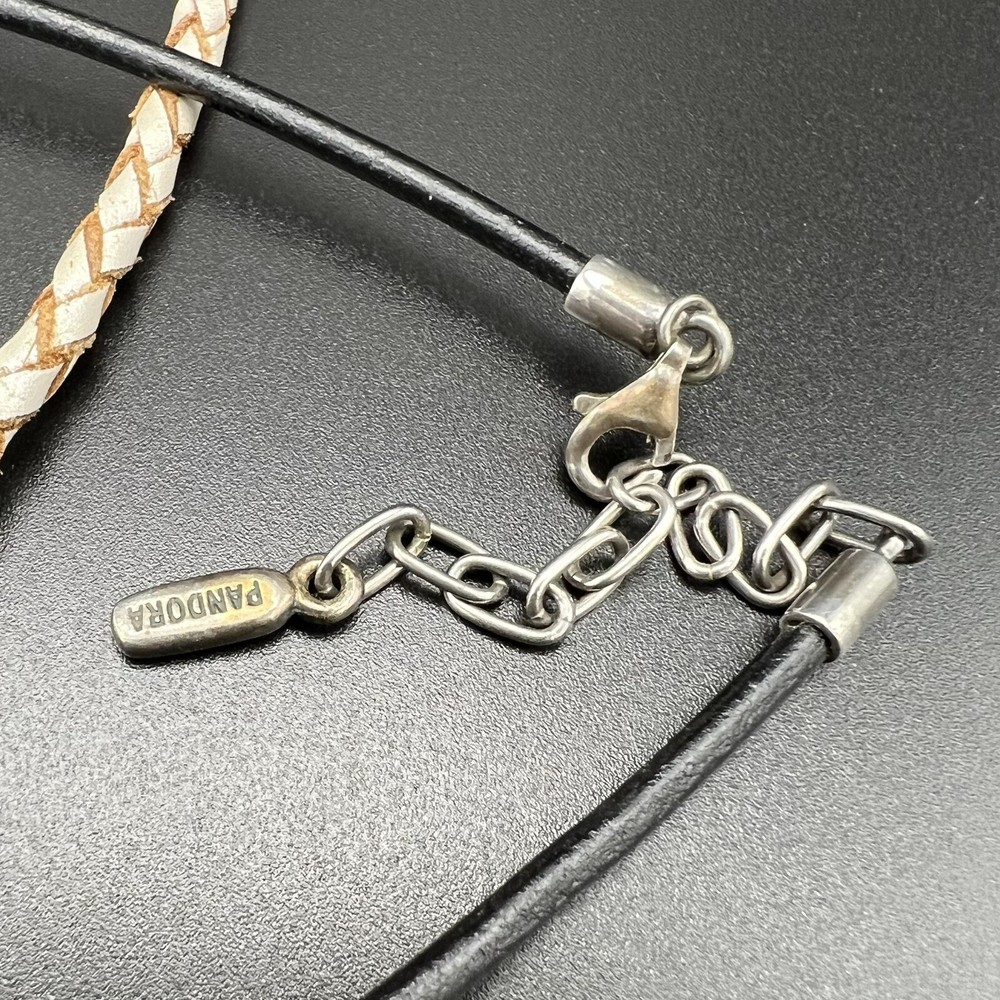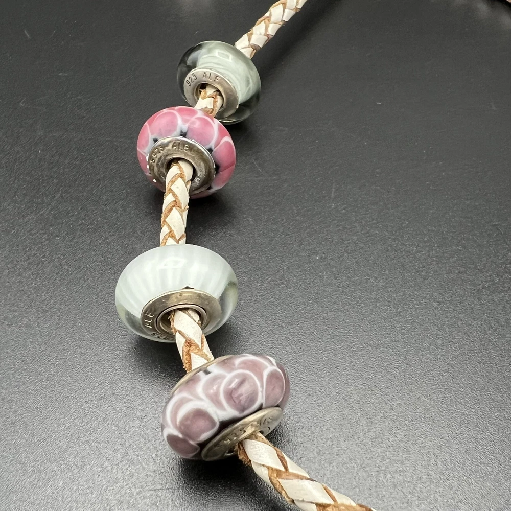 A huge find for Pandora collectors! 2 leather cords with sterling clasps and 5 Murano glass beads. ALL signed with the Pandora and the S925 ALE hallmark. Sellers best guess of age of components is around 2010. Modern Pandora beads may not be compatible with these vintage pieces. Please review photos carefully; they are considered part of the description. Photos may be enhanced to show detail. Priced to move quickly! Bid now!