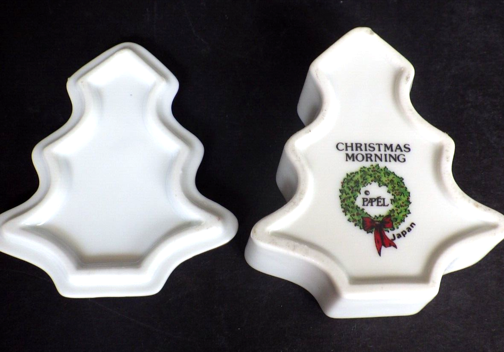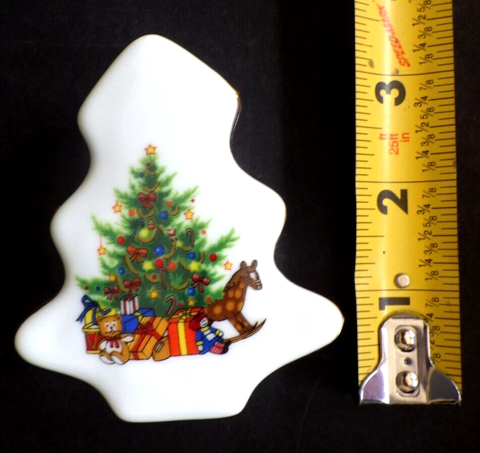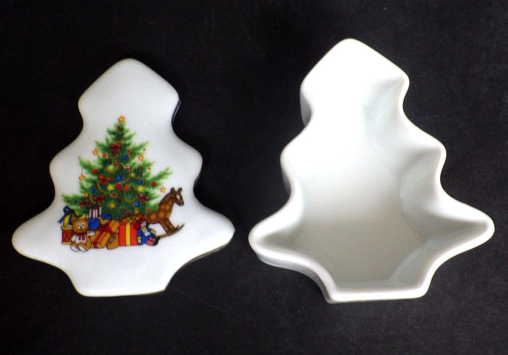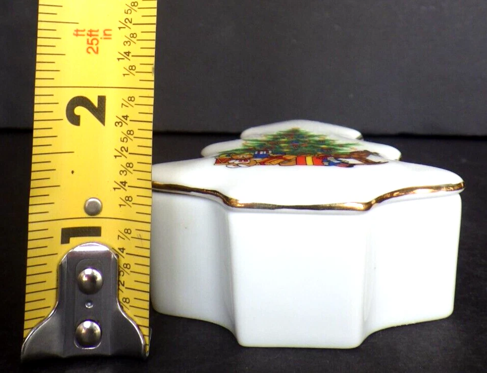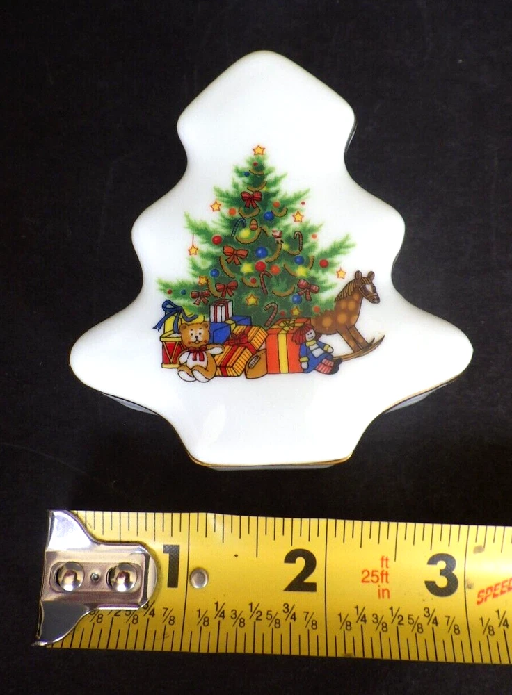 Vintage Miniature Porcelain Trinket Box Papal Japan Christmas Morning Christmas Tree Motif with Lid Very Good and Well Cared for Pre-Owned Condition No Chips or Cracks 3 1/4" L 2 5/8" W 1 1/4" H