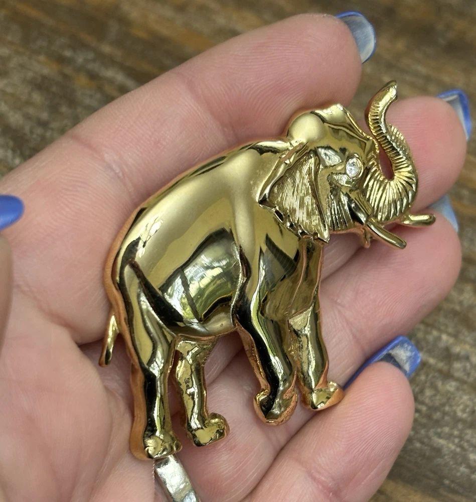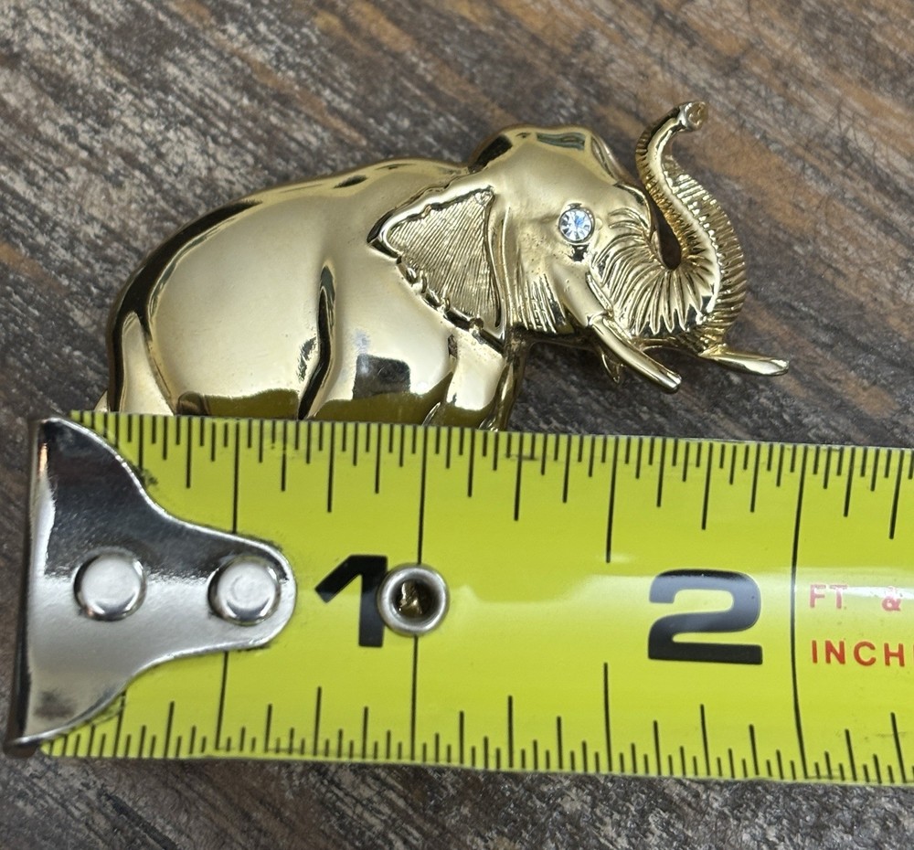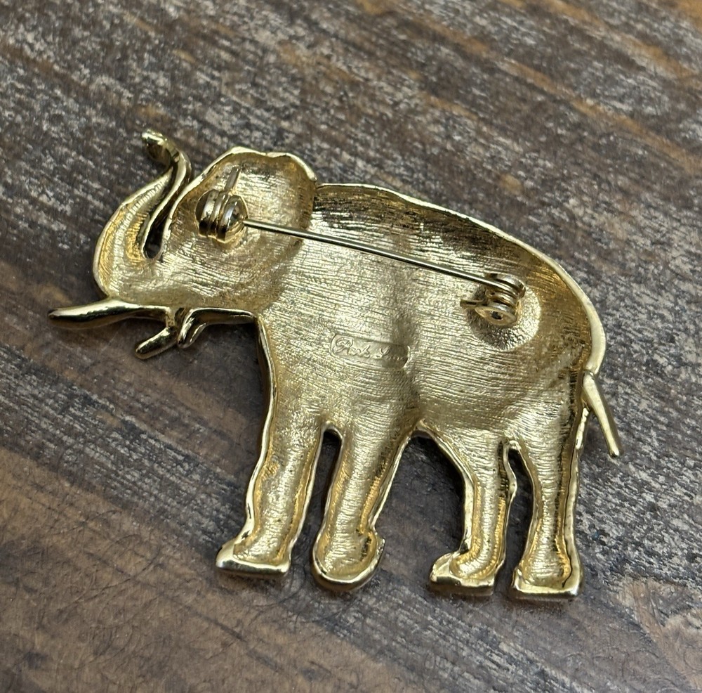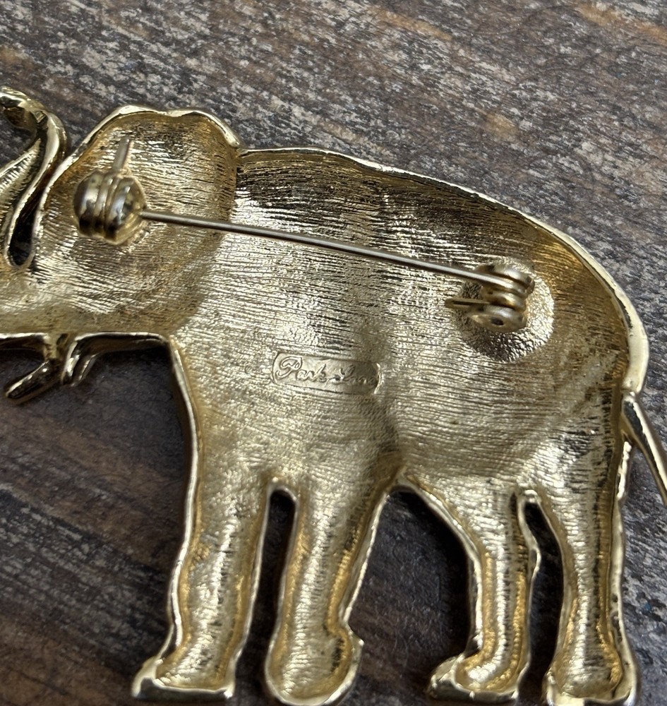 The Vintage Park Lane Elephant Brooch Pin is a unique and eye-catching piece of jewelry. Made of gold tone metal with a rhinestone eye, this brooch features an elephant shape and is signed by the brand Park Lane. The vintage design adds a touch of nostalgia, while the sparkling crystal eye adds a touch of glamour. Perfect for both men and women, this brooch is a stylish accessory to elevate any outfit. One scuff on front, see photos