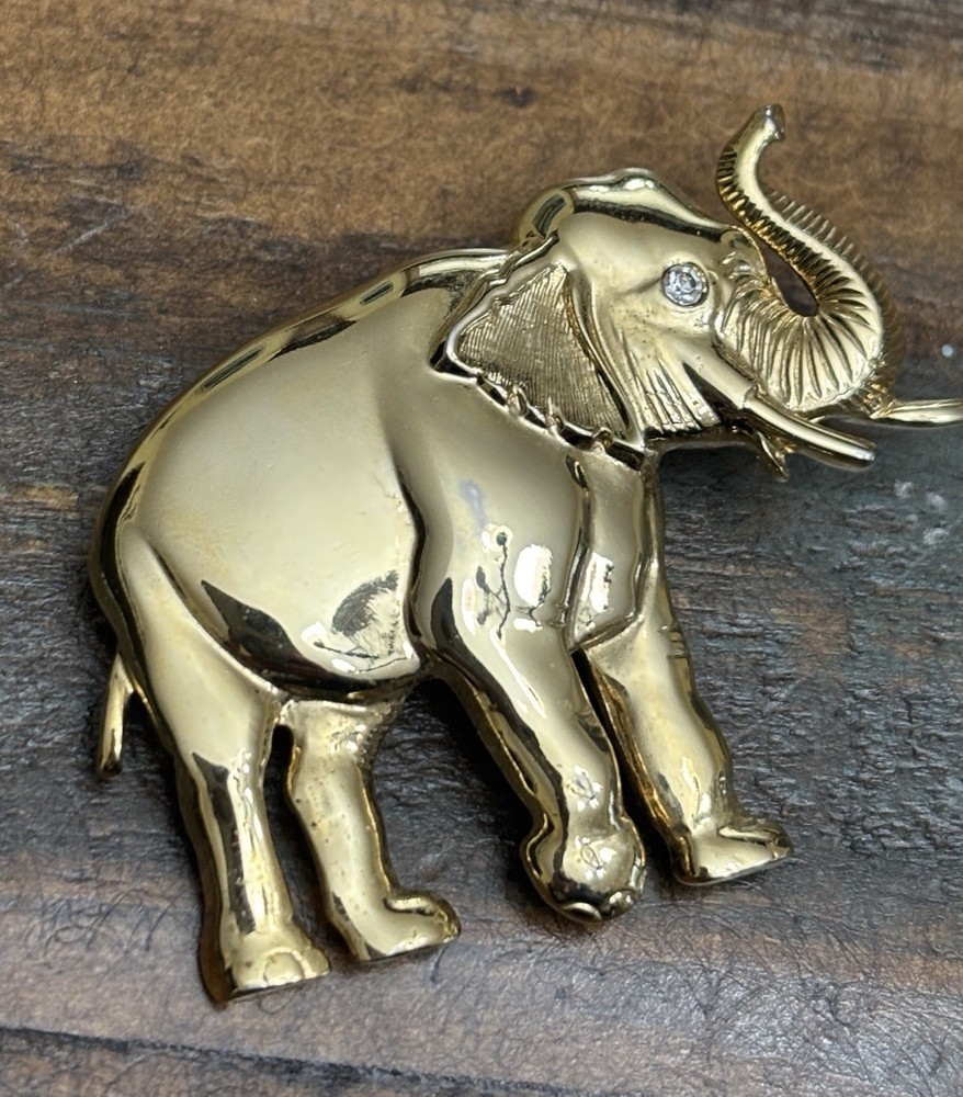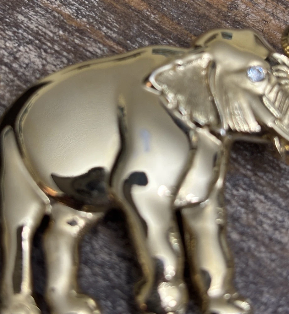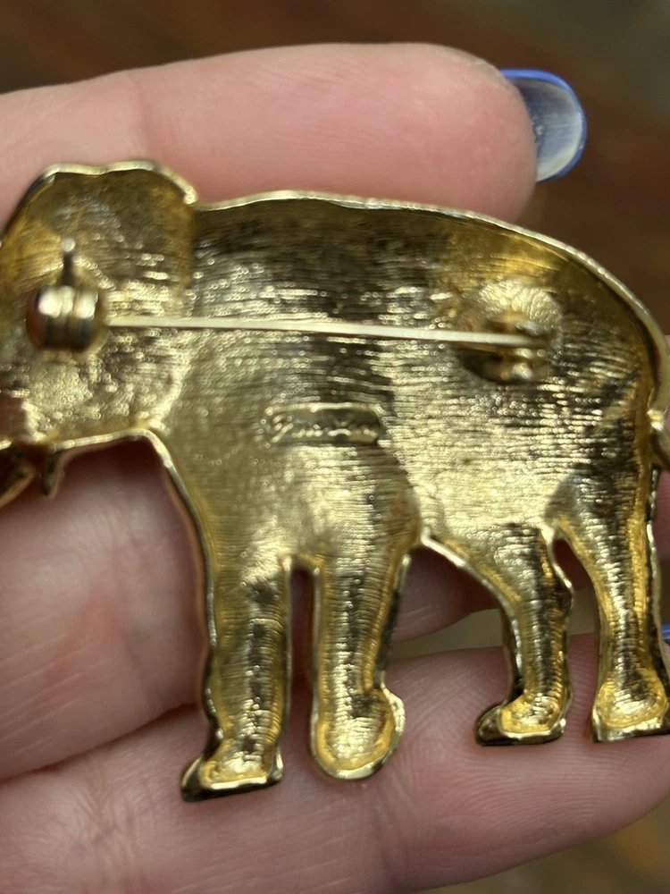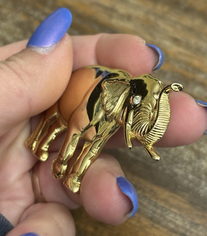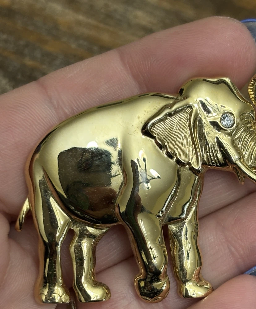 The Vintage Park Lane Elephant Brooch Pin is a unique and eye-catching piece of jewelry. Made of gold tone metal with a rhinestone eye, this brooch features an elephant shape and is signed by the brand Park Lane. The vintage design adds a touch of nostalgia, while the sparkling crystal eye adds a touch of glamour. Perfect for both men and women, this brooch is a stylish accessory to elevate any outfit. One scuff on front, see photos