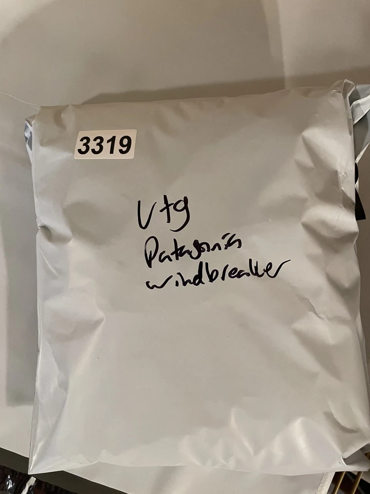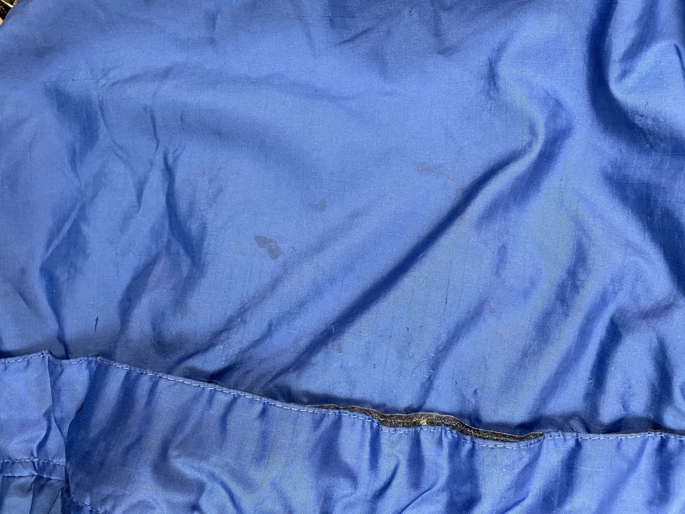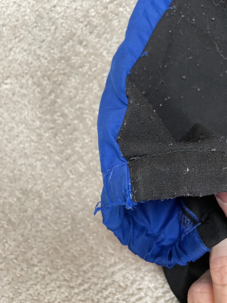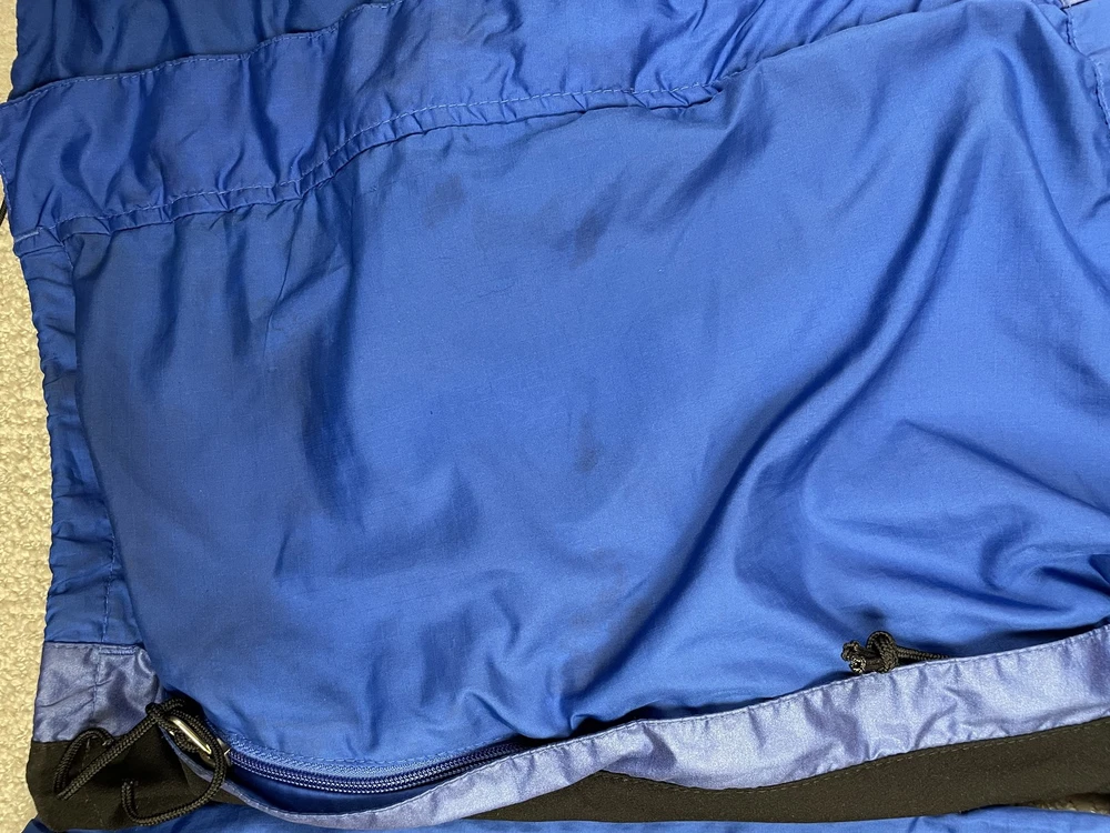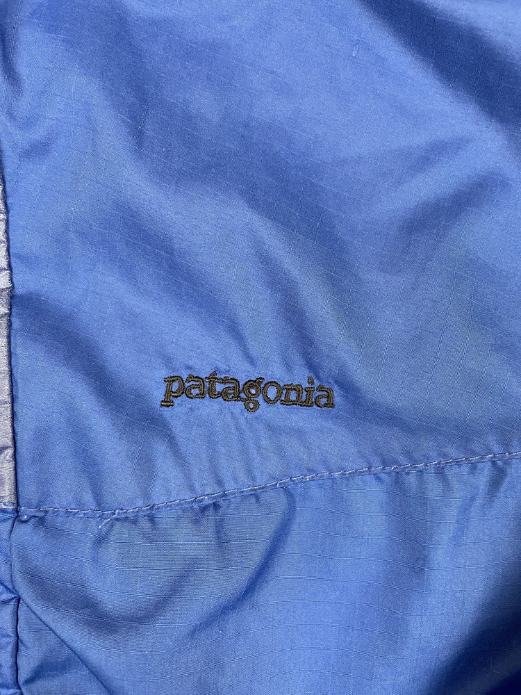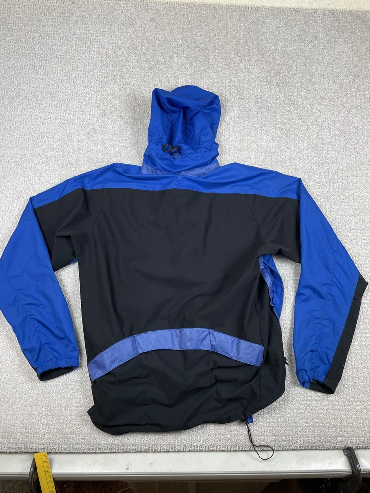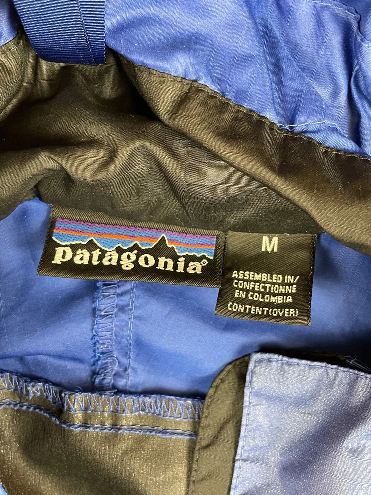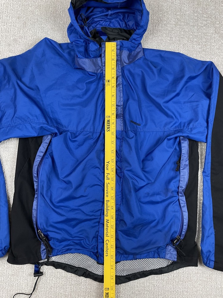 Vintage Patagonia Jacket Mens Medium Blue Black Hooded Windbreaker Coat 90s Condition: Fair vintage condition – shows signs of moderate wear, black fabric panels have lint/pilling, right sleeve cuff has fraying, several small marks and faint stains present (see photos), mesh lining intact Tag size: Medium (Mens) Made in Colombia Material: 100% polyester exclusive of trim Color: Blue with black sleeves and back panel, gray trim Features: Lightweight ripstop shell, mesh lining, full zip front with storm flap, zippered hand pockets, adjustable drawcord hem, hood with drawstring, embroidered Patagonia logo on front Style/Model info: Cut 2964, Style 29130, assembled in Colombia Approx. measurements (see photos for visual reference): - Pit to pit: ~25 inches - Collar to hem: ~29 inches Classic 90s era Patagonia outerwear suitable for hiking, casual, or retro outdoor style Please note visible flaws and refer to images for full details