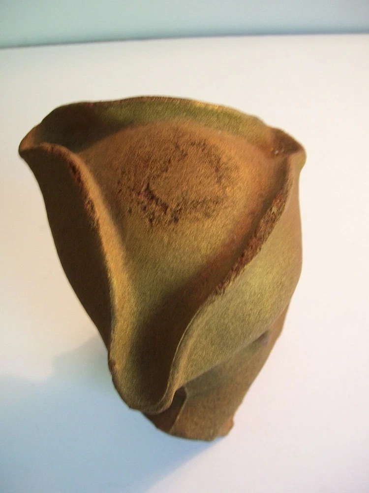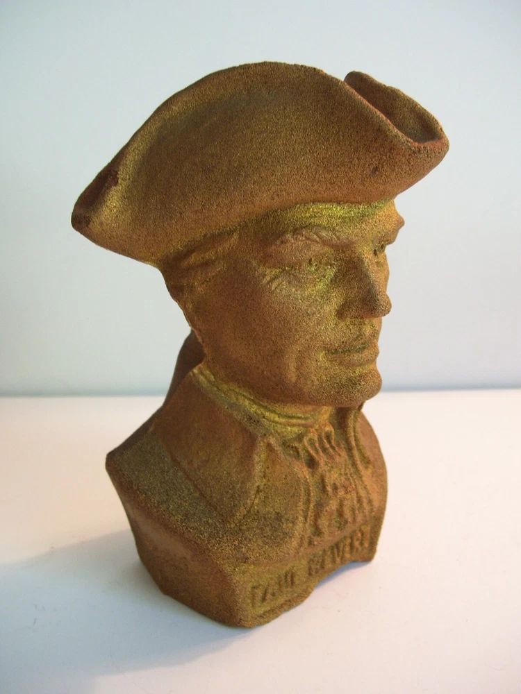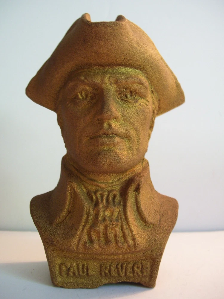 This is what I believe to be a sand casted mold of a head/bust figurine of the head of Paul Revere. This is stamped Redford Foundry Products on the reverse side. Sand casted molds are created for the casting of metal products. This sandy-textured and gritty mold is copper-colored with a sparkly or metallic finish. It measures approximately 6 1/2" tall and is about 4 1/3" across when measured at the corners of the tricorn hat. Nicely detailed down to the eye pupils, eyebrows, neck cravat, and hair wig that peeks out from beneath the tricorn hat. Bottom says "PAUL REVERE." Has a small break/chip in casting mold at bottom front edge and some wear on top of hat but otherwise in very good condition. A scarce item. Sale final; no return. Thanks for looking! Now for the fine print… I am happy to entertain your best, fair offer! I use the United States Postal Service (USPS) for all shipping. Items get shipped either first class or priority mail depending on their weight and size. Please keep in mind that shipping is expensive. I never charge an excessive shipping amount though I may add $1 to help defray the cost of shipping supplies. I will gladly invoice you and combine shipping for multiple items purchased. I ship every day; Monday through Friday (except during snow and ice storms) but do not ship on Saturdays. Thanks for your purchase!