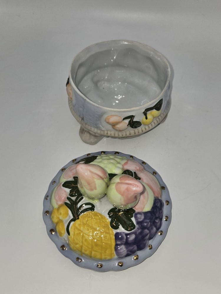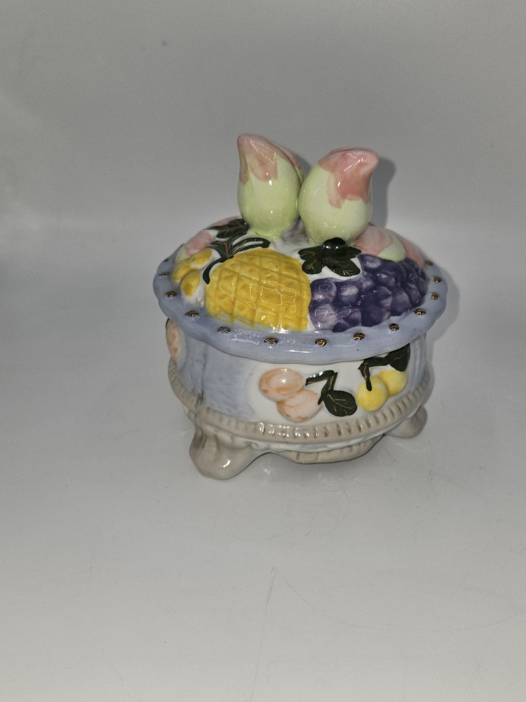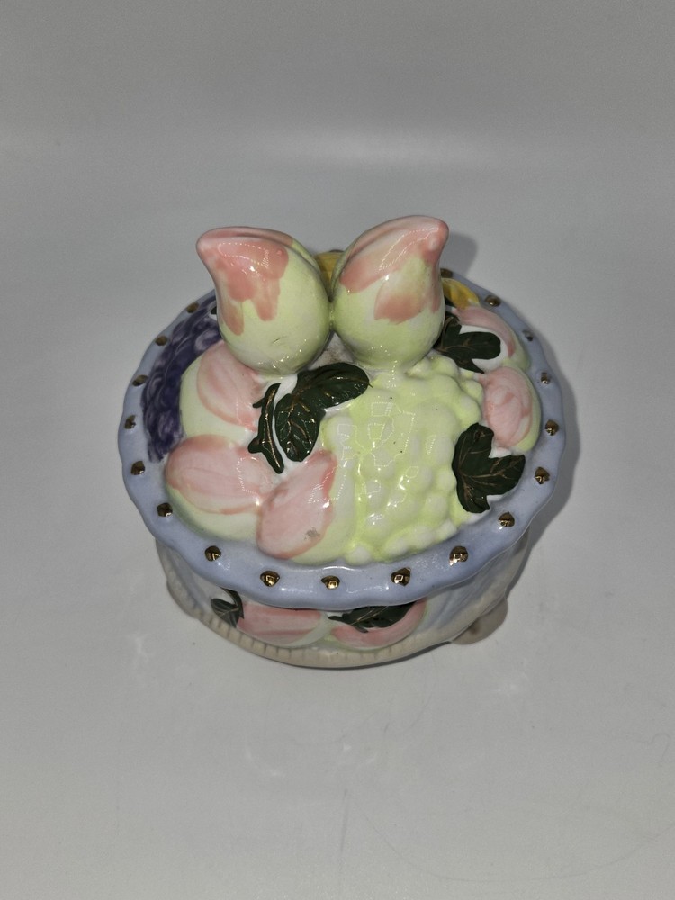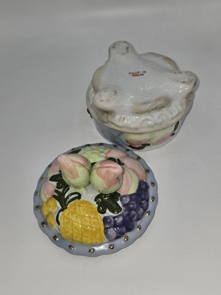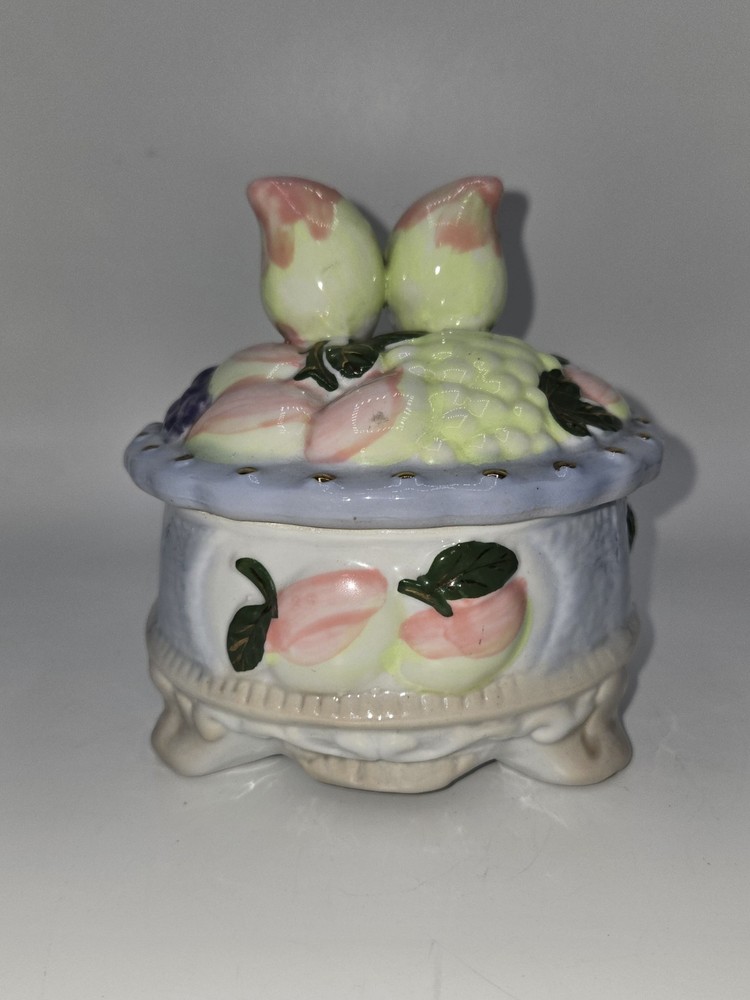 This vintage trinket box is a charming piece made in China, featuring a French Country style with a colorful design of peaches. Crafted from porcelain, it serves as a decorative and functional item for storing small treasures or jewelry. The intricate detailing and vibrant colors make it a delightful addition to any collection or home decor with its nostalgic appeal and elegant design.