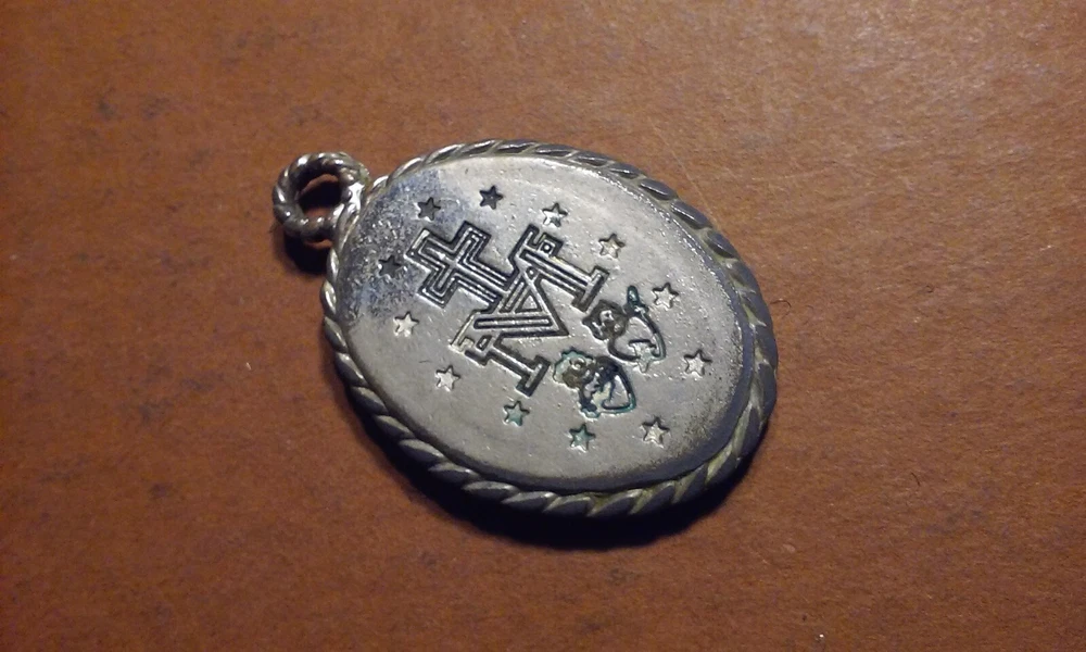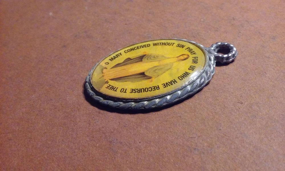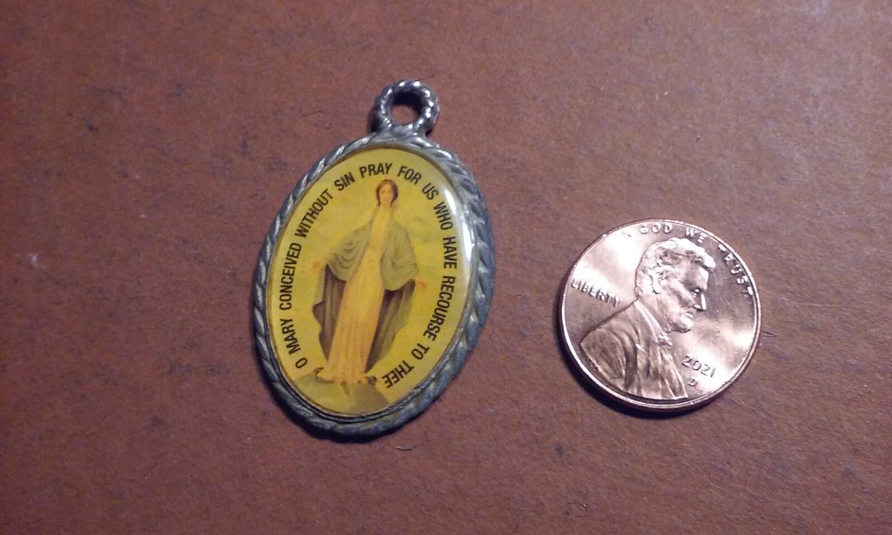 Vintage Pendant Virgin Mary Medal Oval Acrylic Coating Silver-Tone 1.5" Inches.