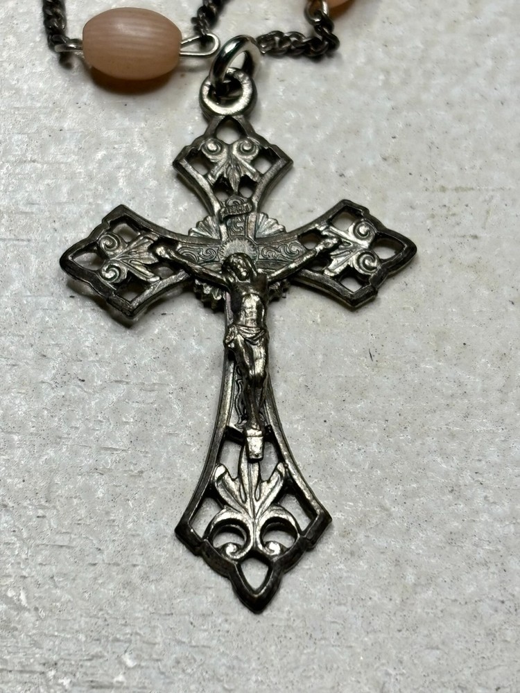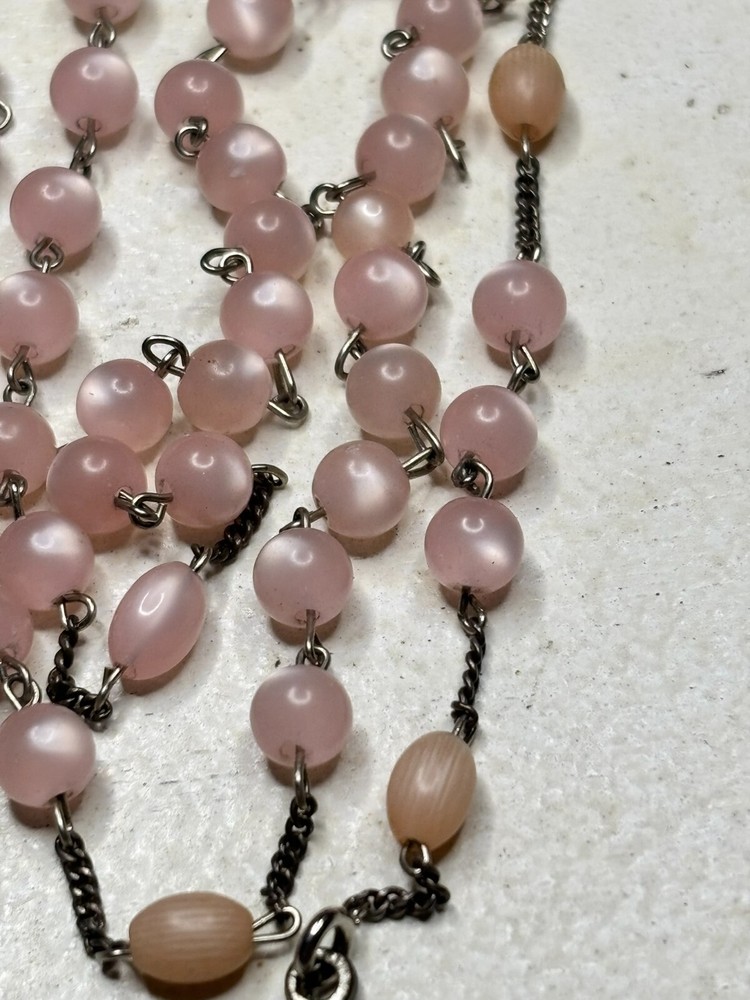 Vintage rosary with pink moon glow round 1/4" beads and oval 1/4" decade beads Total length is 21 inches with cross No damage