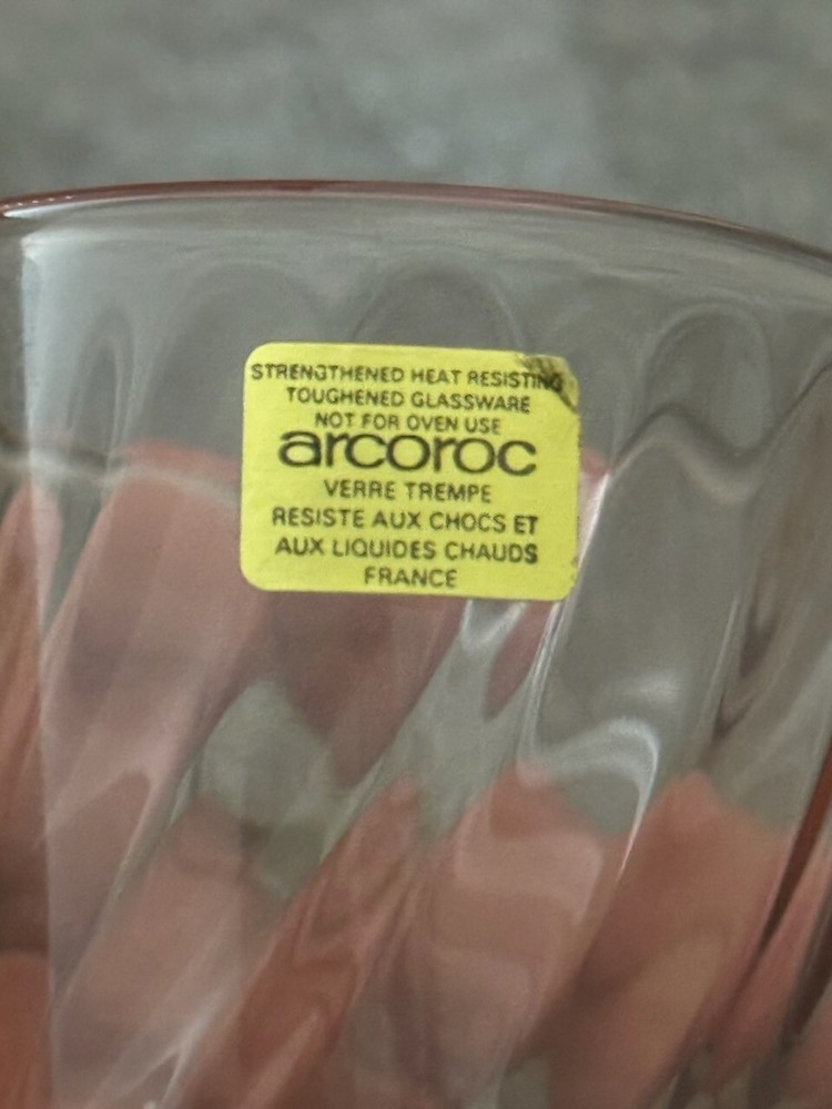 No cracks or damages. Kept in china cabinet, never used with liquids. Pink swirl design , includes punch bowl, pitcher, and 6 glasses.