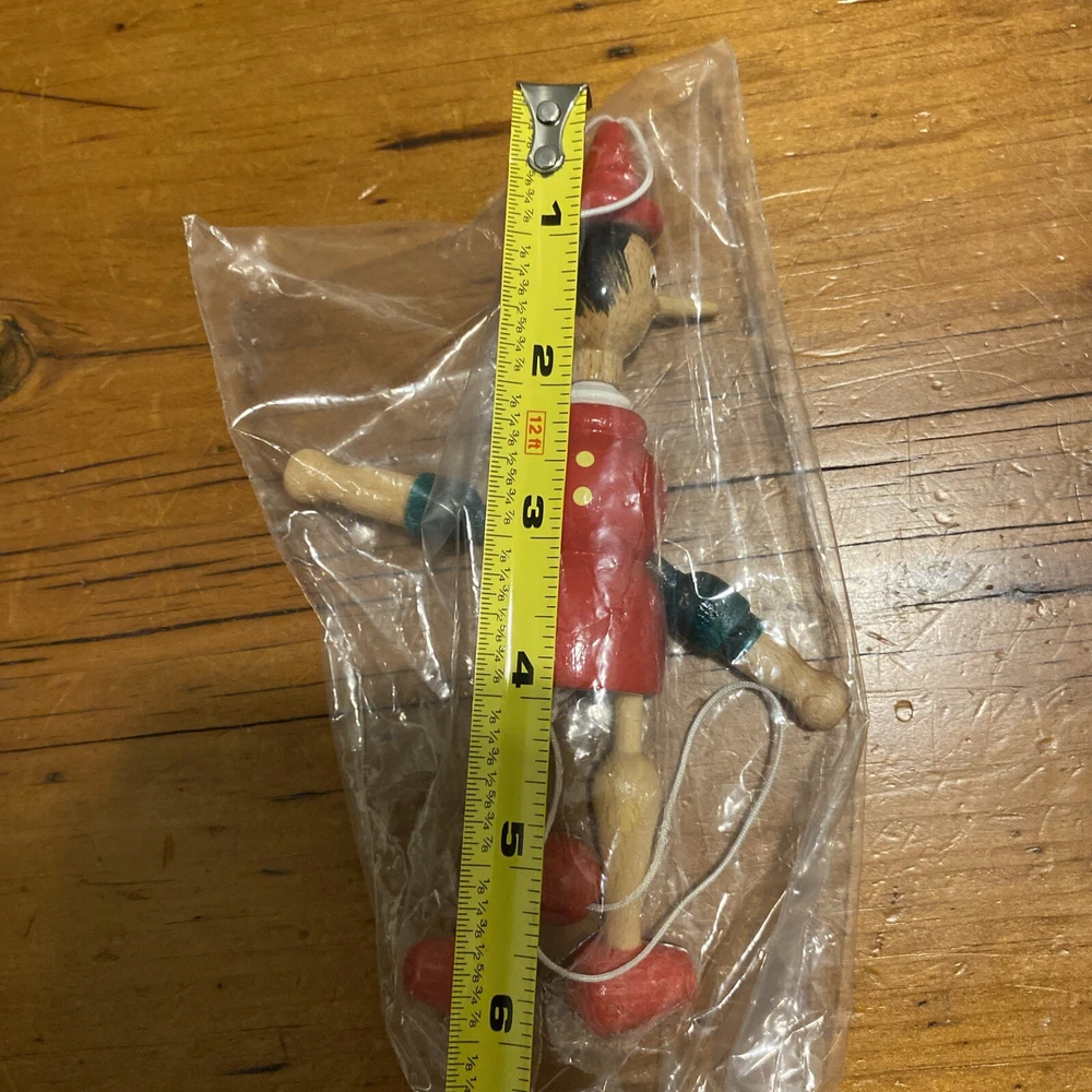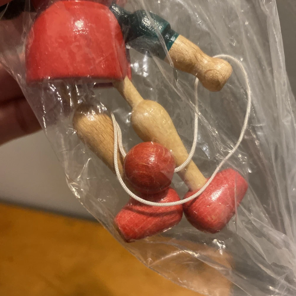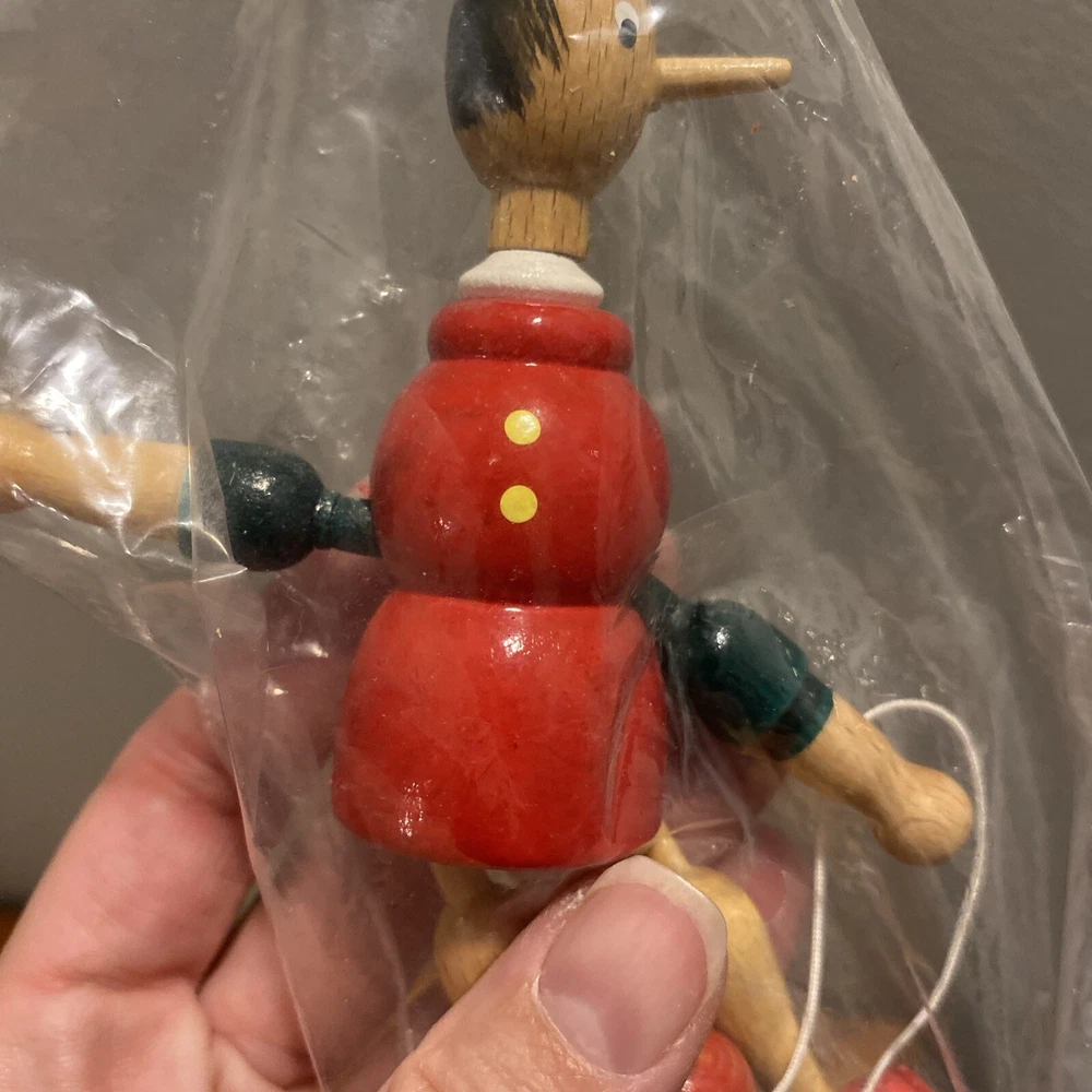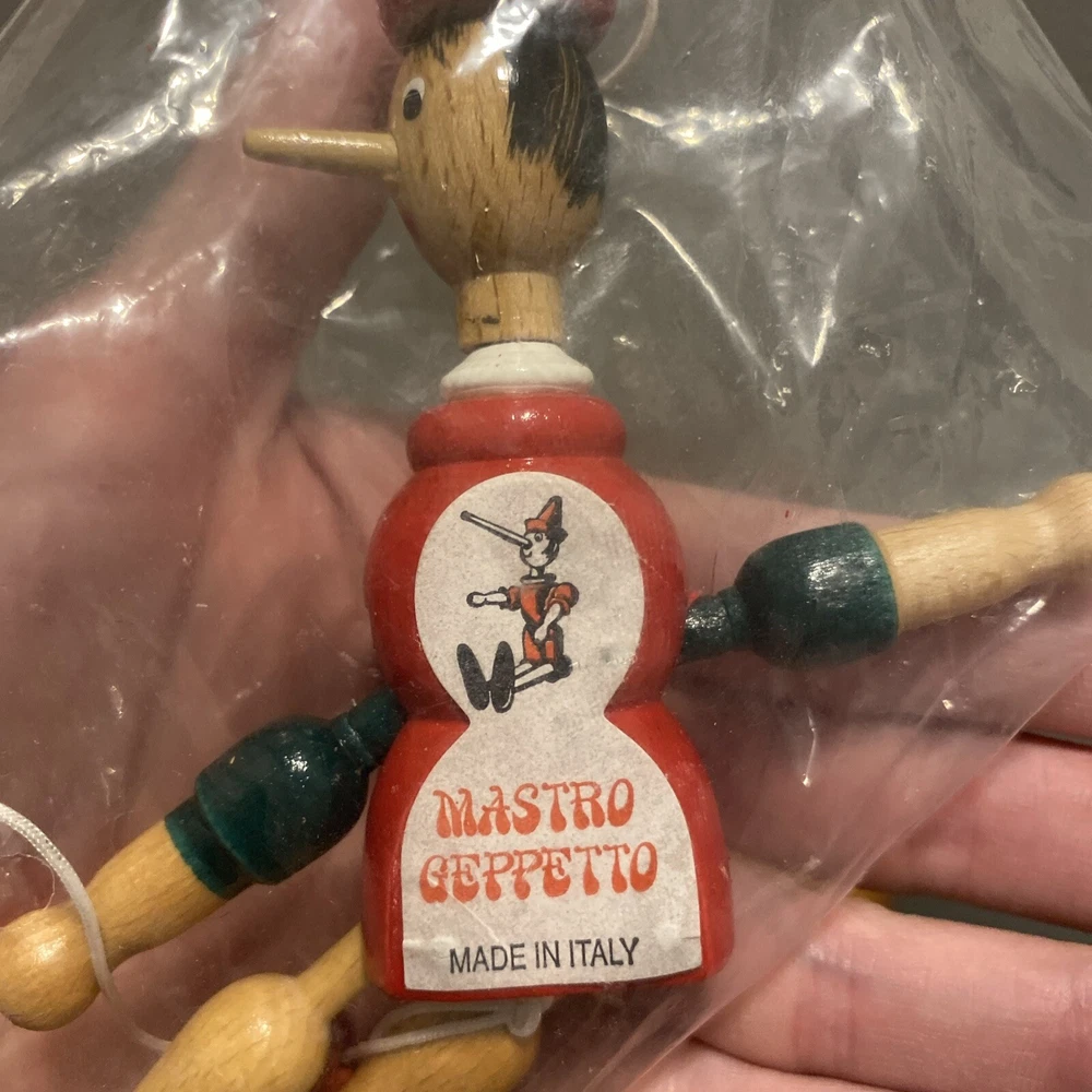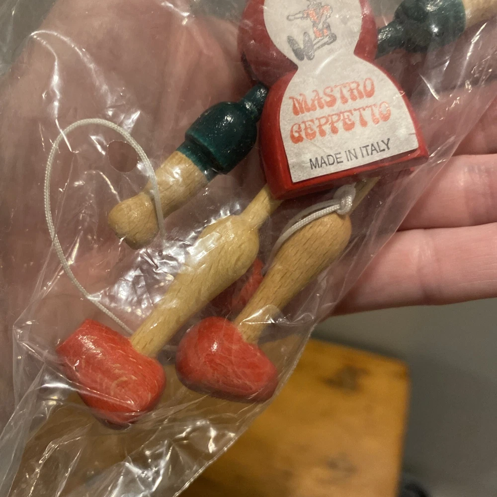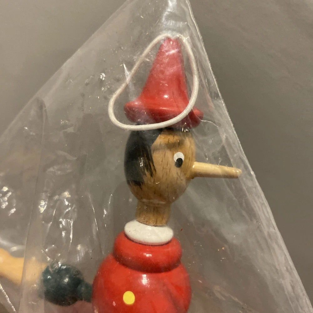 Vintage Pinocchio CHRISTMAS ORNAMENT Wooden Jointed Mastro Geppetto Italy 6”. Like new.