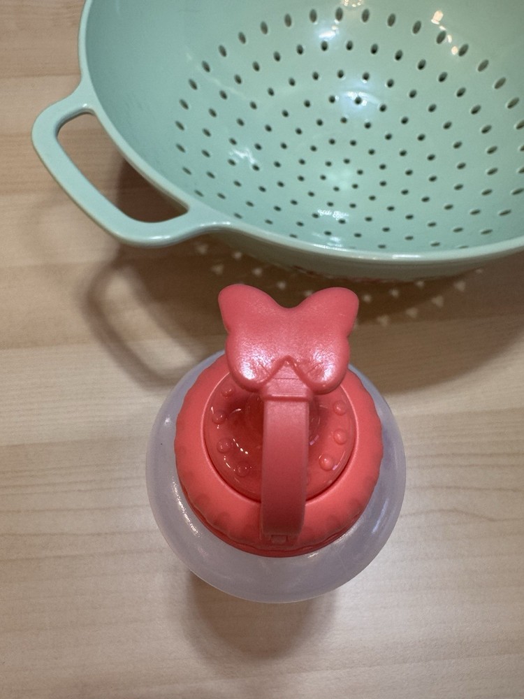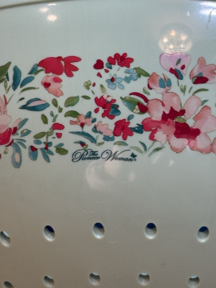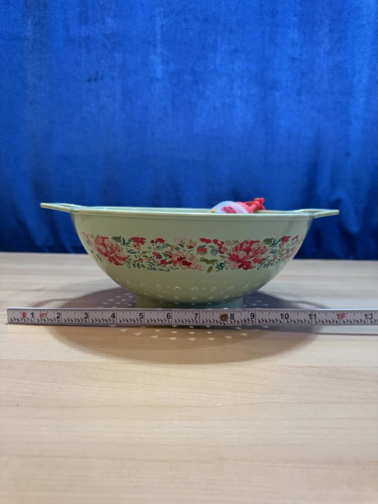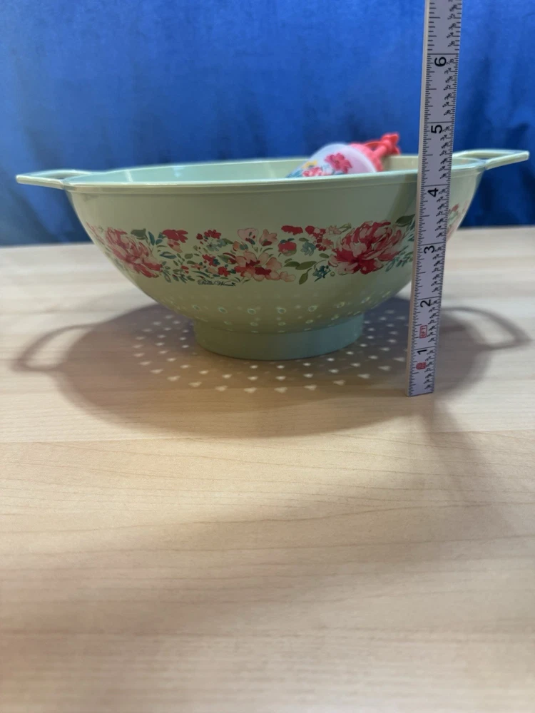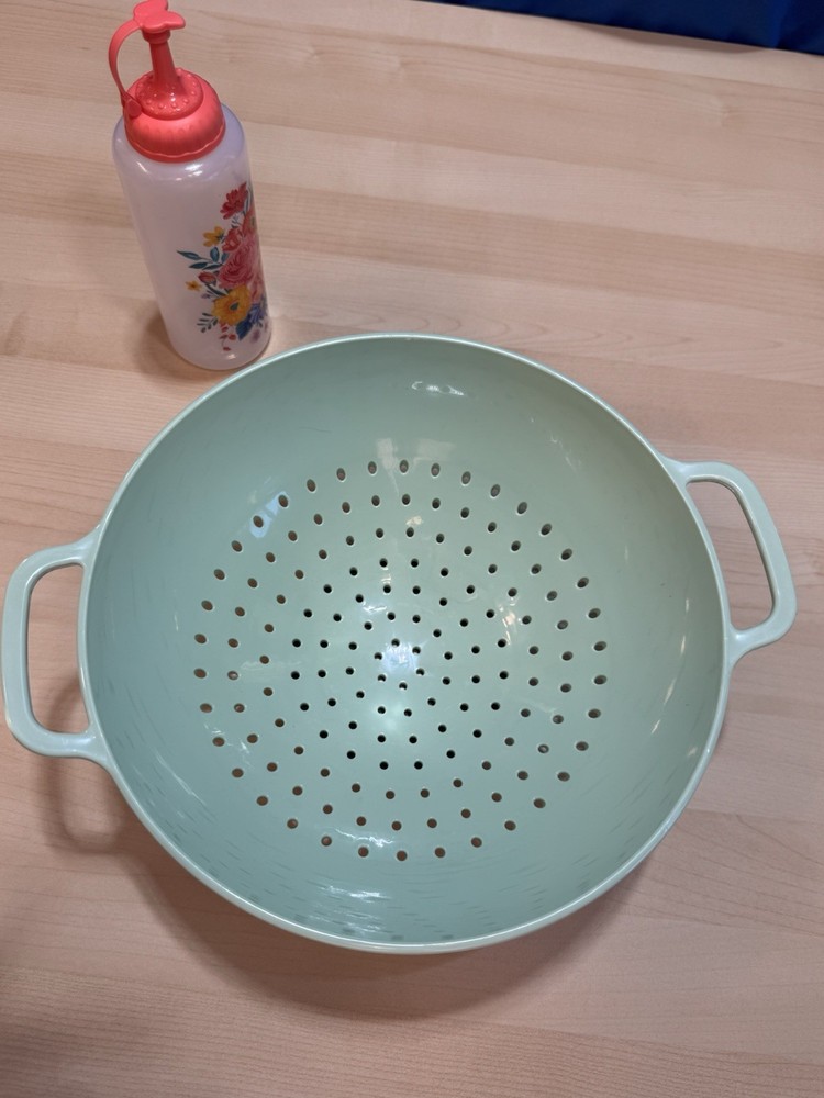 The VTG Pioneer Woman Mint Green Flowers Melamine Colander Food Strainer is a medium-sized kitchen gadget featuring a vintage/retro style. Made of durable melamine material, this colander is designed with a green color and mint green flowers, adding a touch of charm to your kitchen decor. It includes both a food strainer and colander functions, perfect for straining universal, fruit, and pasta dishes. Easy to clean and reusable, this Pioneer Woman colander with handles is a practical and stylish addition to your kitchen tools and gadgets collection. Plus a bonus condiment squeeze bottle.
