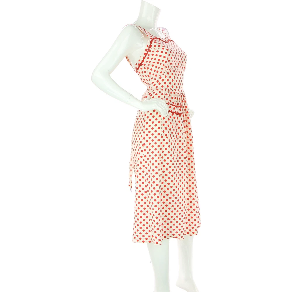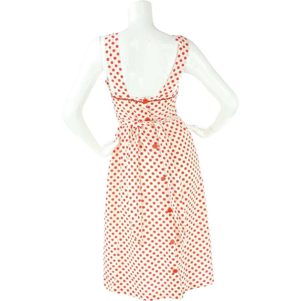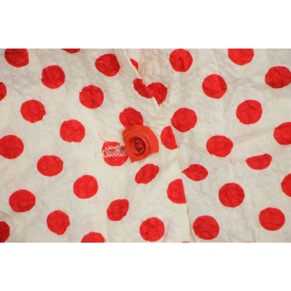 Step into the enchanting world of vintage charm with this Puckered Fabric Polka Dot Dress, embodying the essence of Cottagecore and Prairie style. Perfect for summer festivities, this dress features a pin-up rockabilly design that's both playful and chic. Ideal for parties and dancing, its unique puckered texture and classic polka dot pattern make a delightful statement. Embrace a look that combines timeless elegance with a touch of whimsy, perfect for those who love to stand out with retro flair. Vintage Puckered Fabric Polka Dot Cottagecore Prairie Summer Pin-up Rockabilly Party Dancing Dress material:cotton colors: red, white unlined no tags one of the buttons is broken size on tag:no size tag fits like a: XS mannequin is 6' 1" and a size small armpit to armpit:14.5 length(top to bottom):44 waist:13 hips :21 all measurements are in inches any major defect will be mentioned and/or photographed 14612 8t4s1