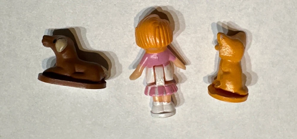 COMPLETE In very good condition see photos Relive cherished memories with the Vintage Polly Pocket Buttons Animal Hospital Vet Playset, a treasured find for collectors and fans of the iconic Bluebird brand. This complete set from 1989 comes in a compact size, featuring the beloved character Polly Pocket and her animal friends. The playset showcases the classic light complexion and straight orange hair of the 1-inch doll, with brown eyes that reflect her vibrant personality. Crafted from durable plastic, this doll playset is a snapshot of the 1980s nostalgia and represents a piece of Polly Pocket history. It includes all the original accessories attached in a circular compact, allowing you to recreate your favorite scenes or imagine new adventures. This original, non-antique yet vintage piece, without its original packaging, brings the magic of Polly Pocket's world right into your home.