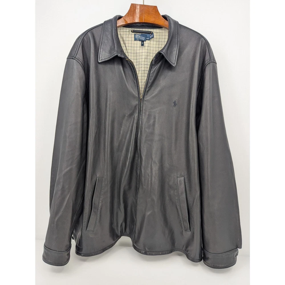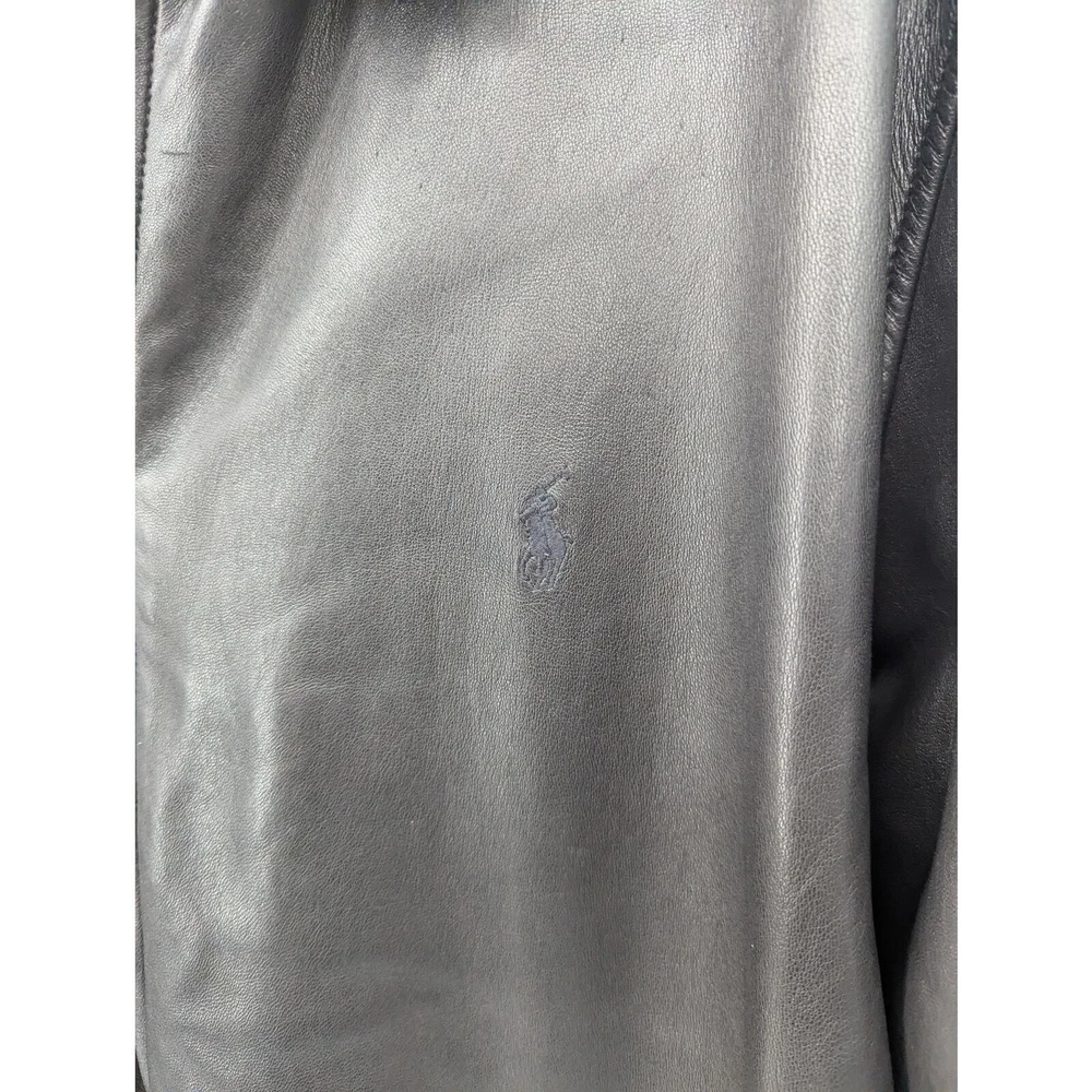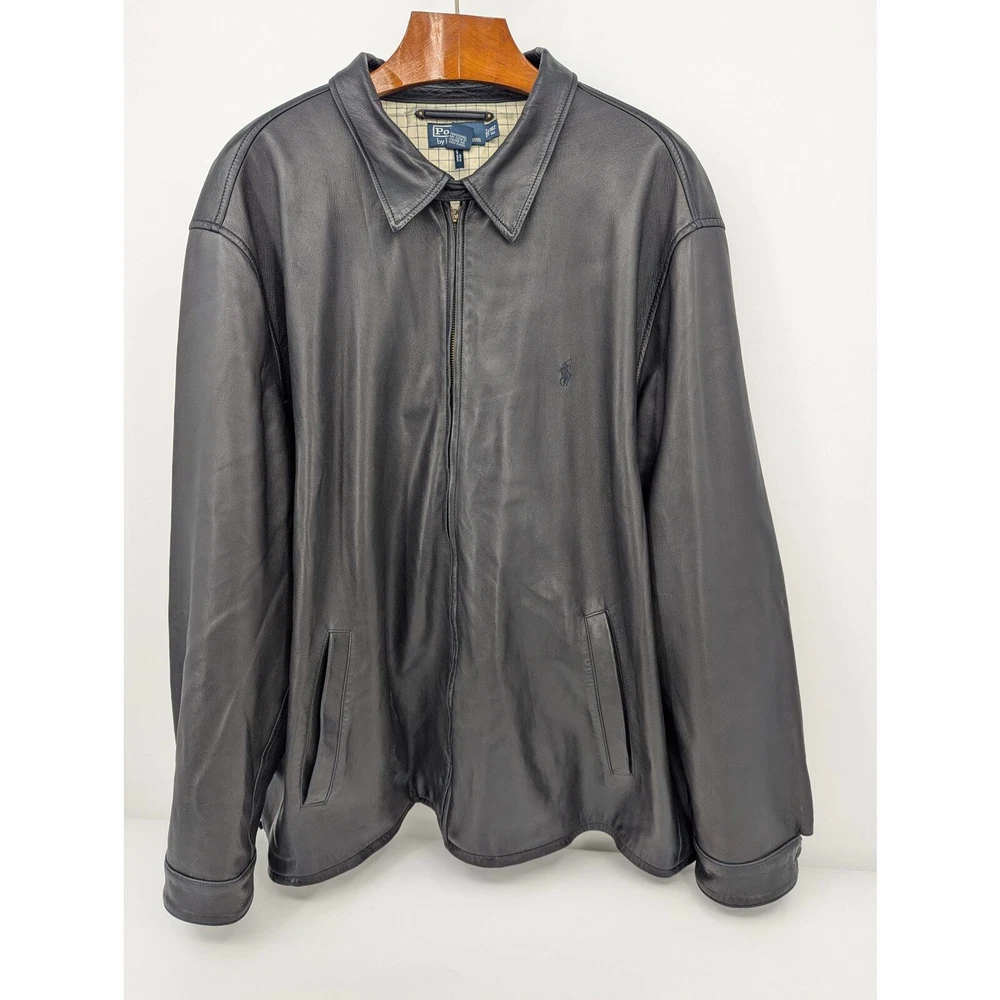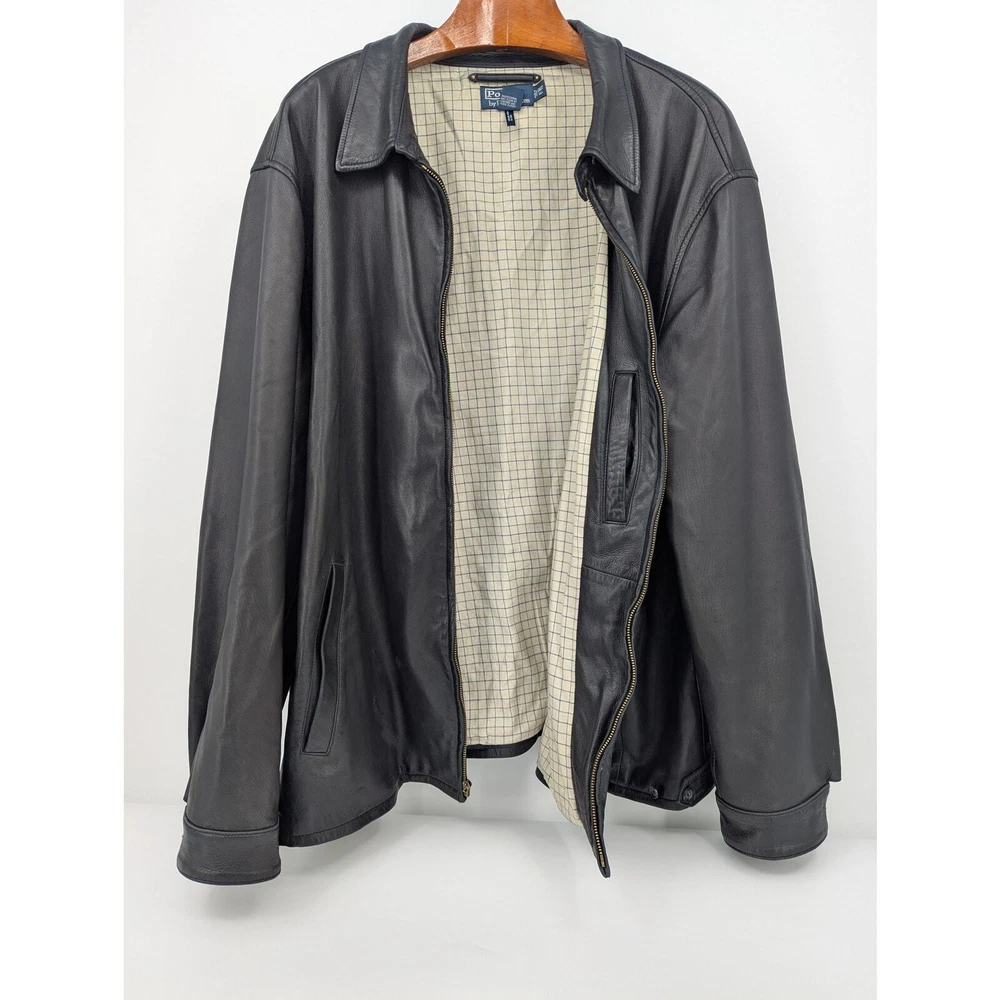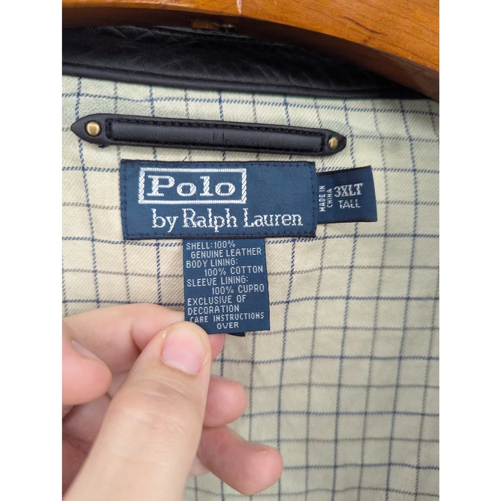 Vintage Polo Ralph Lauren leather jacket Full-zip closure 100% Genuine leather shell with 100% Cotton lining Men's 3XL Tall (see measurements below) Ships in box to preserve condition Approximate Measurements Length: 33 inches Chest Width: 31 inches Sleeve: 28 inches Zipper pull tab is broken, but zipper is still fully functional Very minor wear on back Is as pictured Smoke-free home Questions? Please ask SKU-CB431
