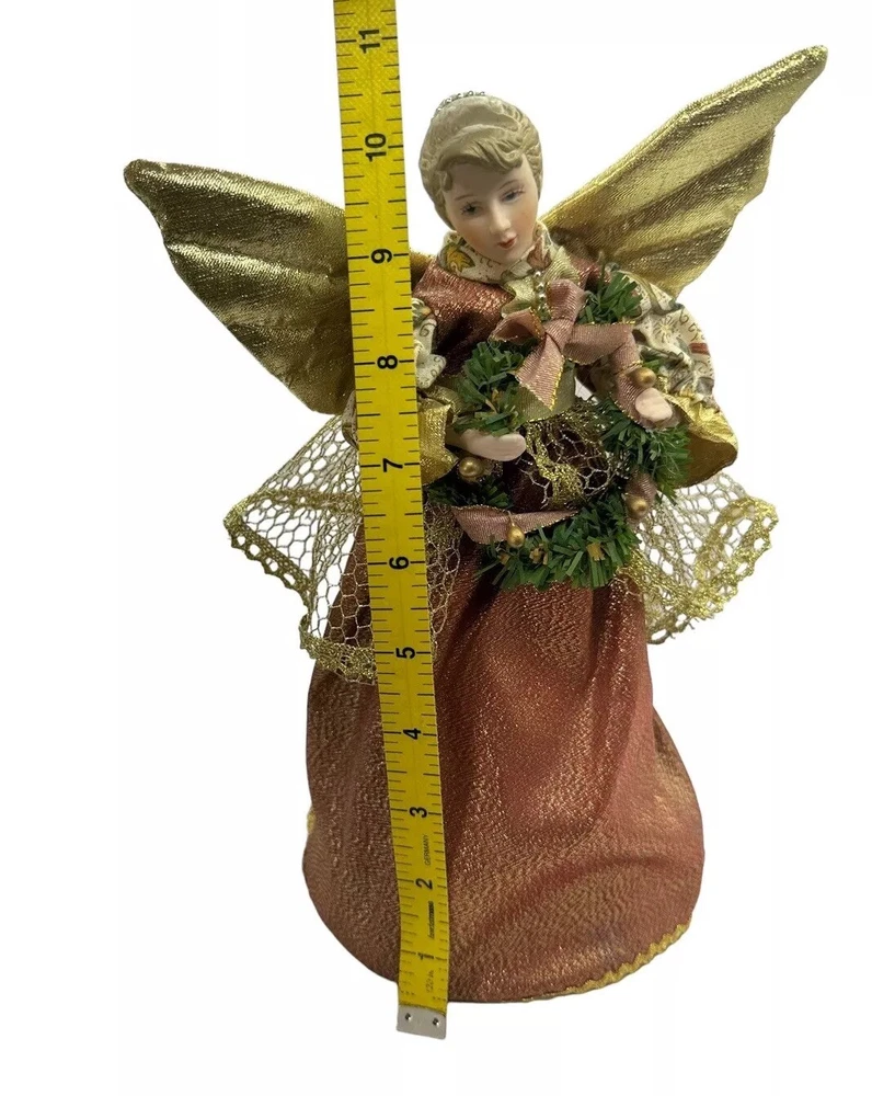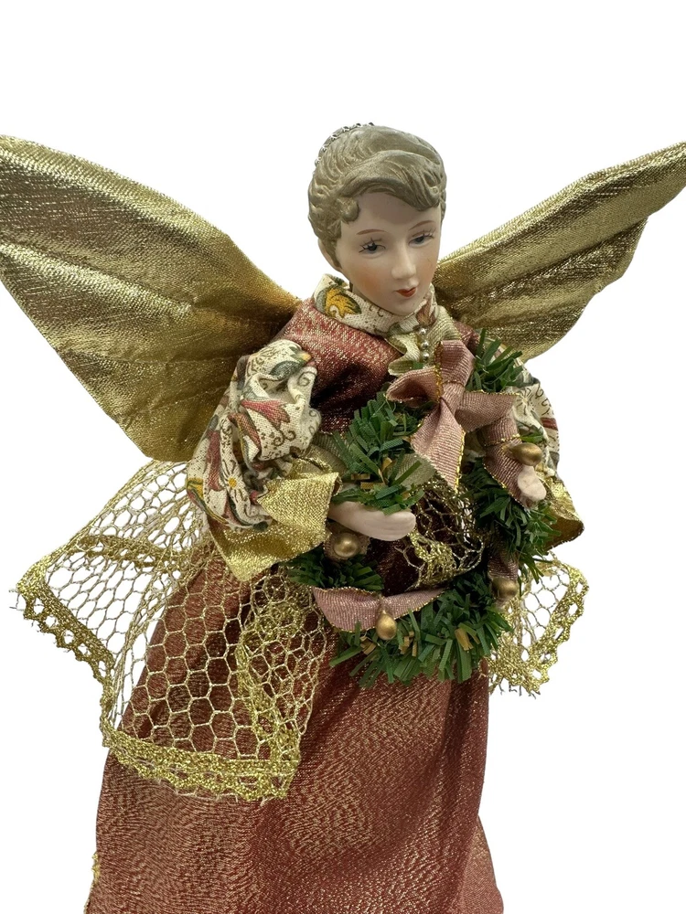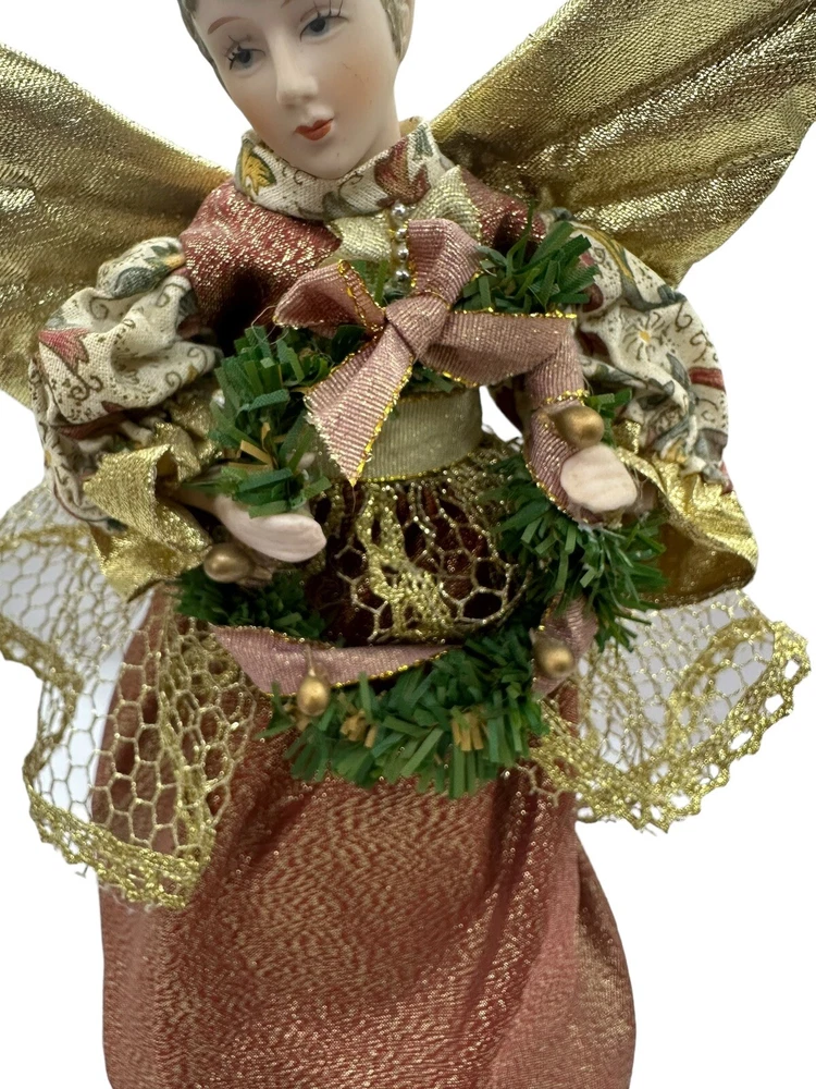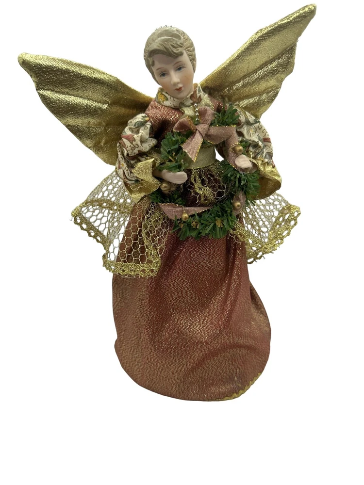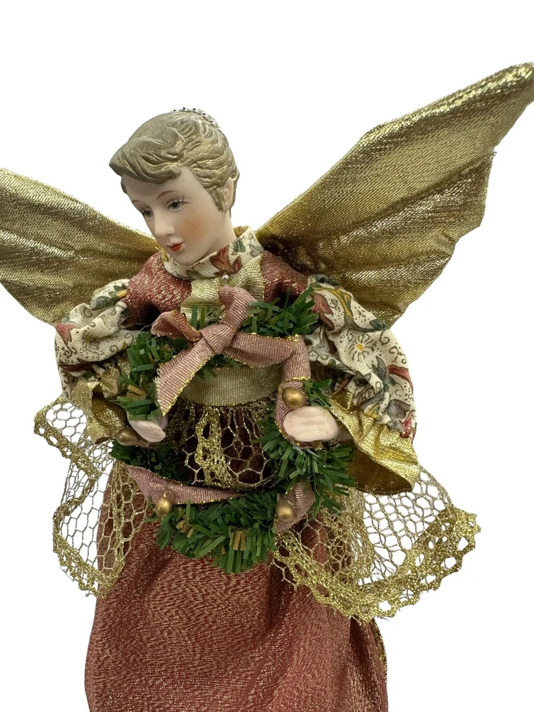 HomeVintage Porcelain Christmas Tree Top Angel Victorian Print Dress Gold Wings 10”