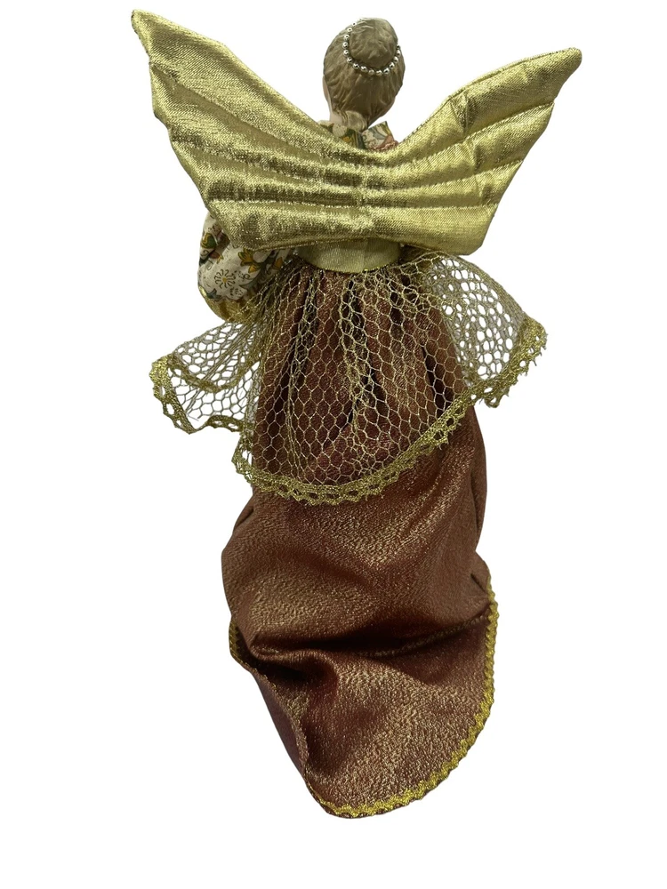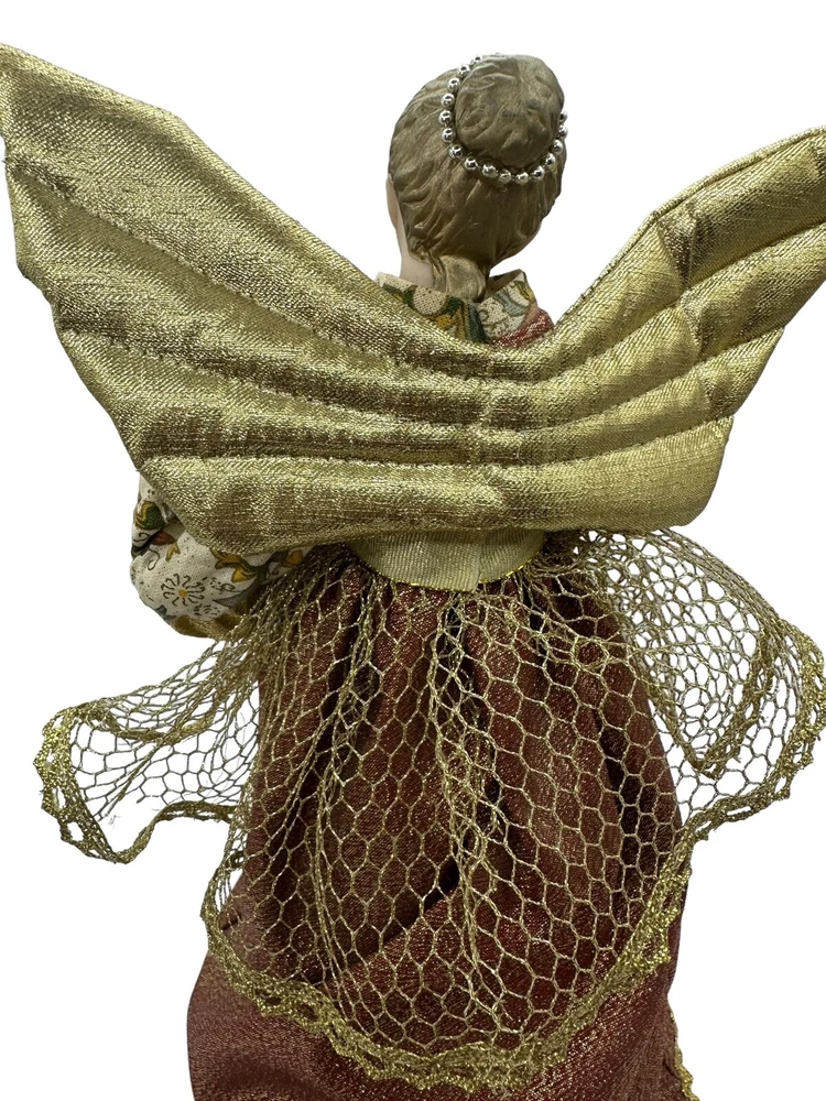 Vintage Porcelain Christmas Tree Top Angel Victorian Print Dress Gold Wings 10”