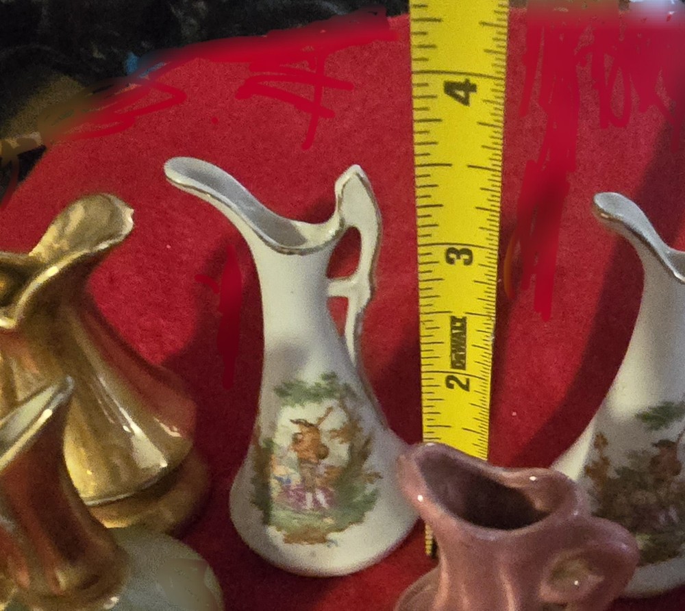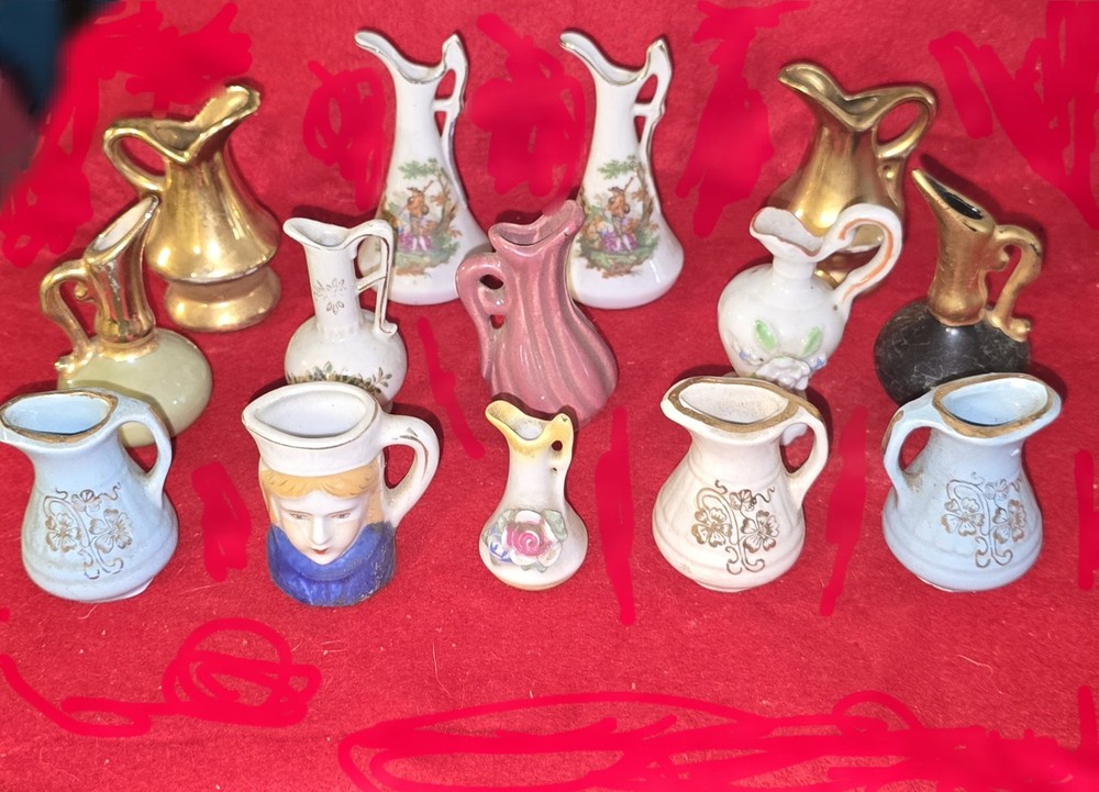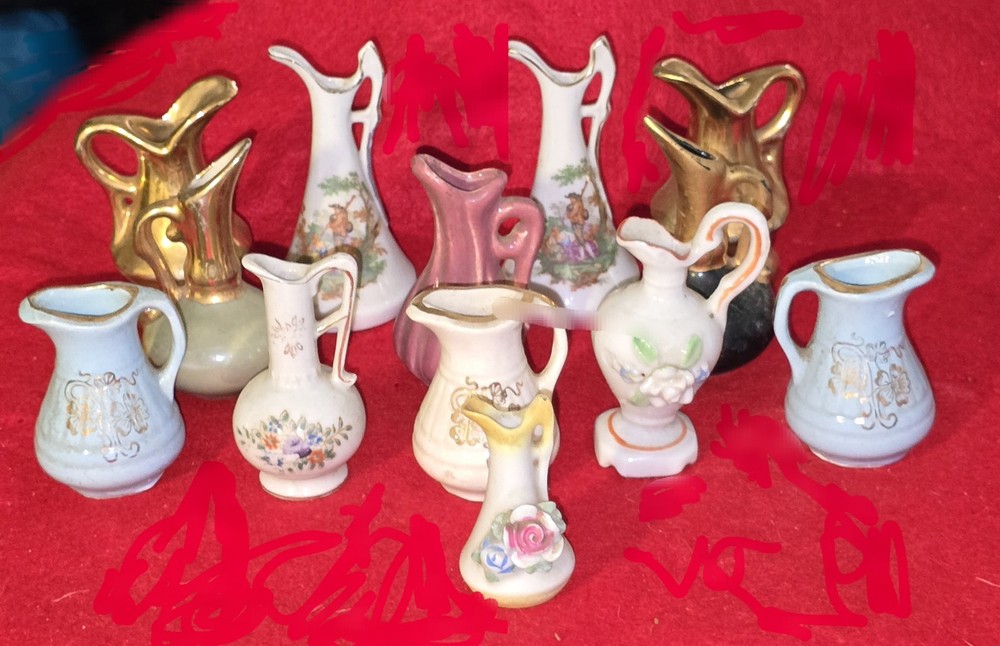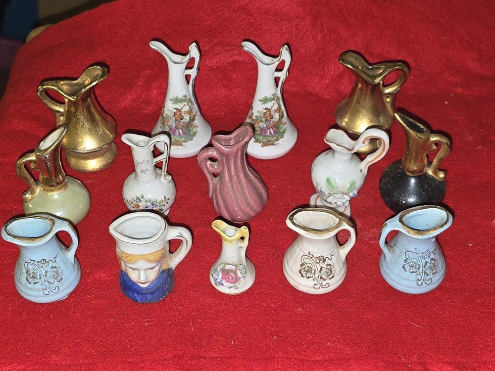 This is a lot of 14 vintage porcelain miniature pitchers from the 1940s -1960s, made in Japan. The pitchers are glazed and hand-painted with gold trim, and they feature a variety of Victorian and floral themes. Some of the pitchers are occupied and some are empty, adding to their charm and realism. These pitchers are suitable for any room and are perfect for collectors of dollhouse miniatures.
