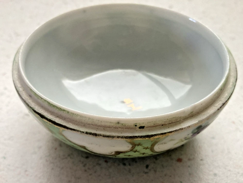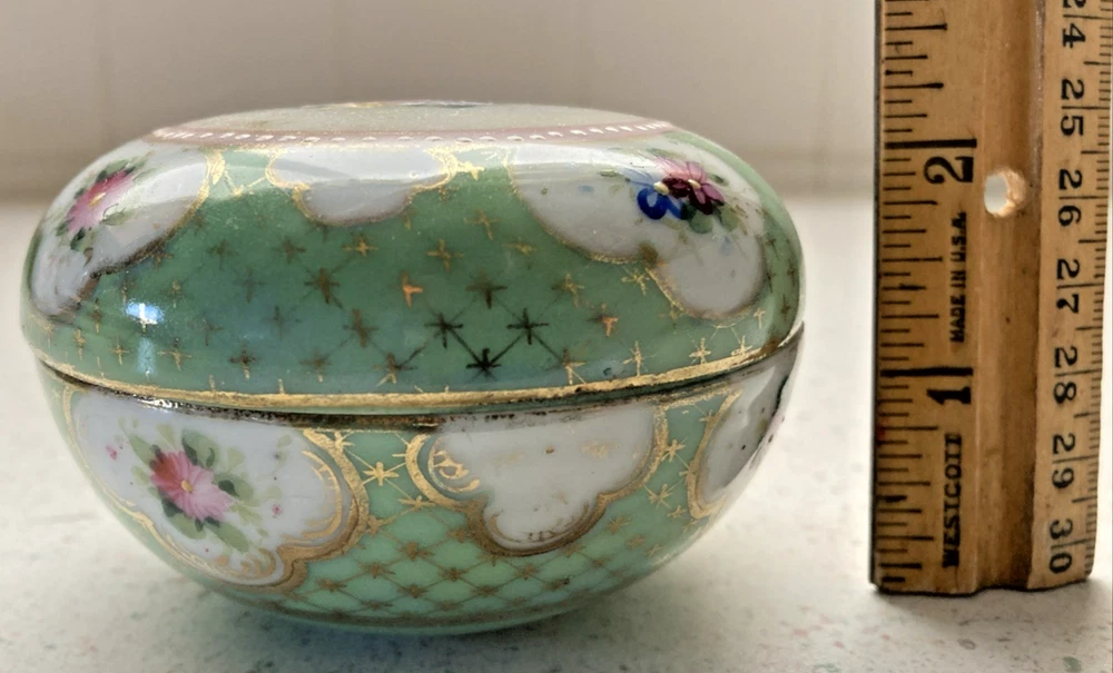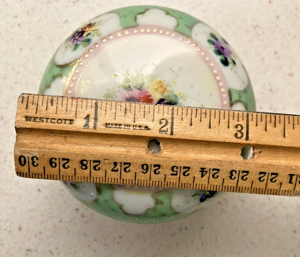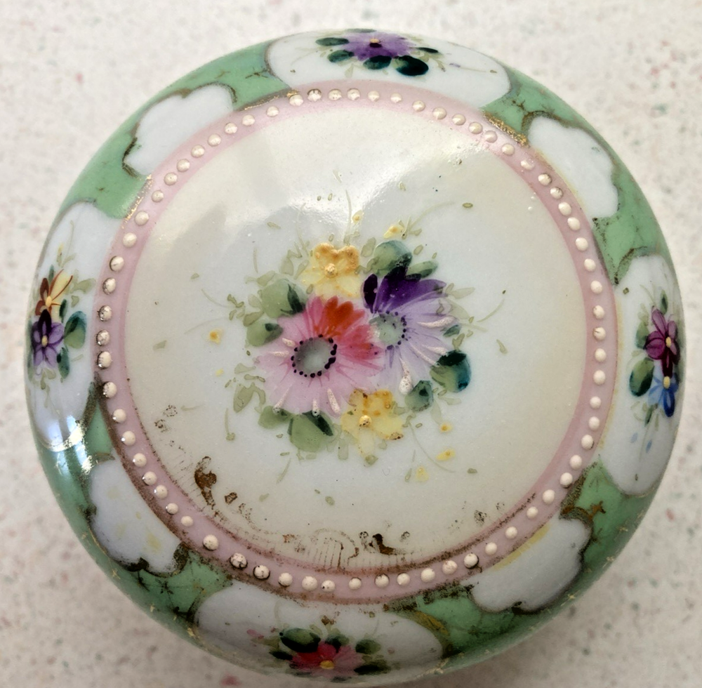Vintage. Porcelain Lidded Trinket Box. Border on top of white dots are raised. Features Spring Flowers. Very good condition. Shows some wear around inside of lid and box. Wear on bottom of box. See photos for details and condition. From smoke and pet free home. Buyer pays shipping. Thank you for shopping with us. 138