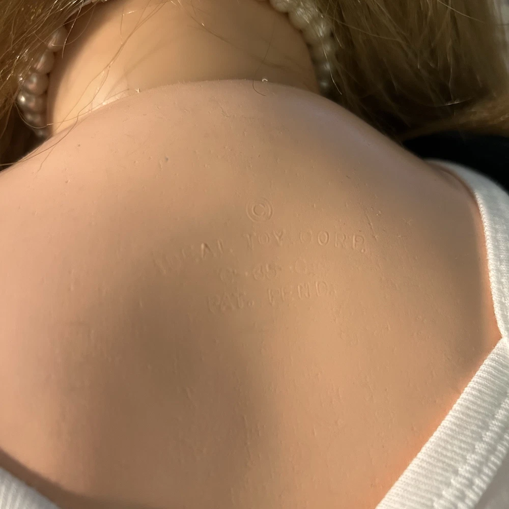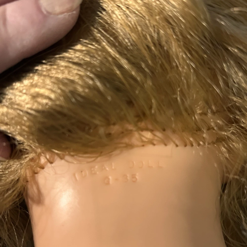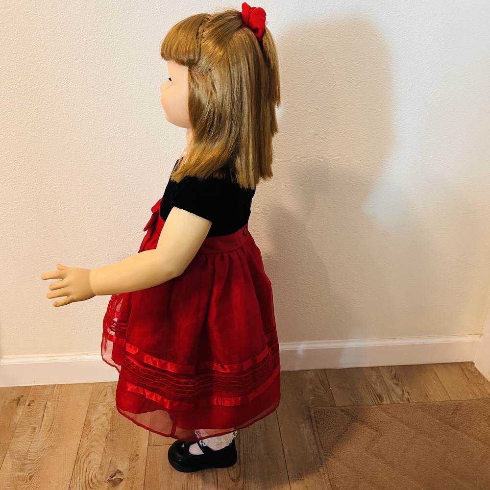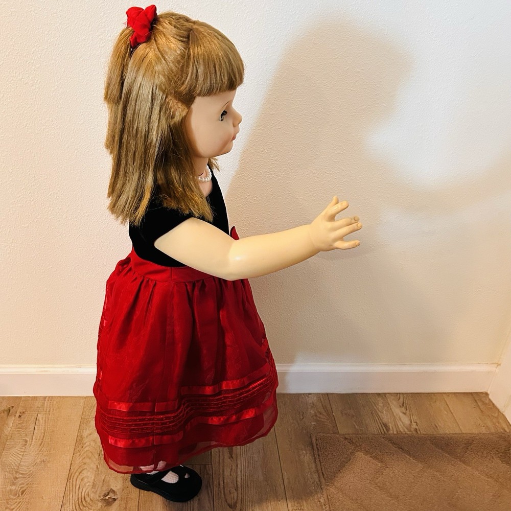 The Vintage Pretty Ideal Patti Playpal Doll is a 35" tall collectible from the 1960s, making it a rare and sought-after item for doll enthusiasts. This Play Pal doll, designed by artist Neil Estern, features honey blonde hair, blue eyes, and is marked with the Ideal brand. Made of vinyl and hard plastic, this original doll is perfect for all occasions and is a nostalgic piece for collectors of vintage dolls. She is in very good condition for her age. She has some scuff wear on bottom and heels from age wear. Please see photos. She comes in Christmas dress, petticoat, ruffle socks and black shoes. If you hold her arm she will take a step, you have to guide each step. She has been displayed and a stand is recommended. She is a vintage doll. I have had the doll a couple years, displays nicely.