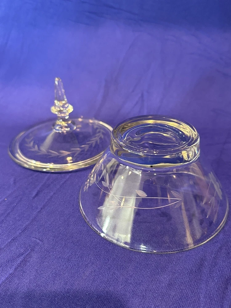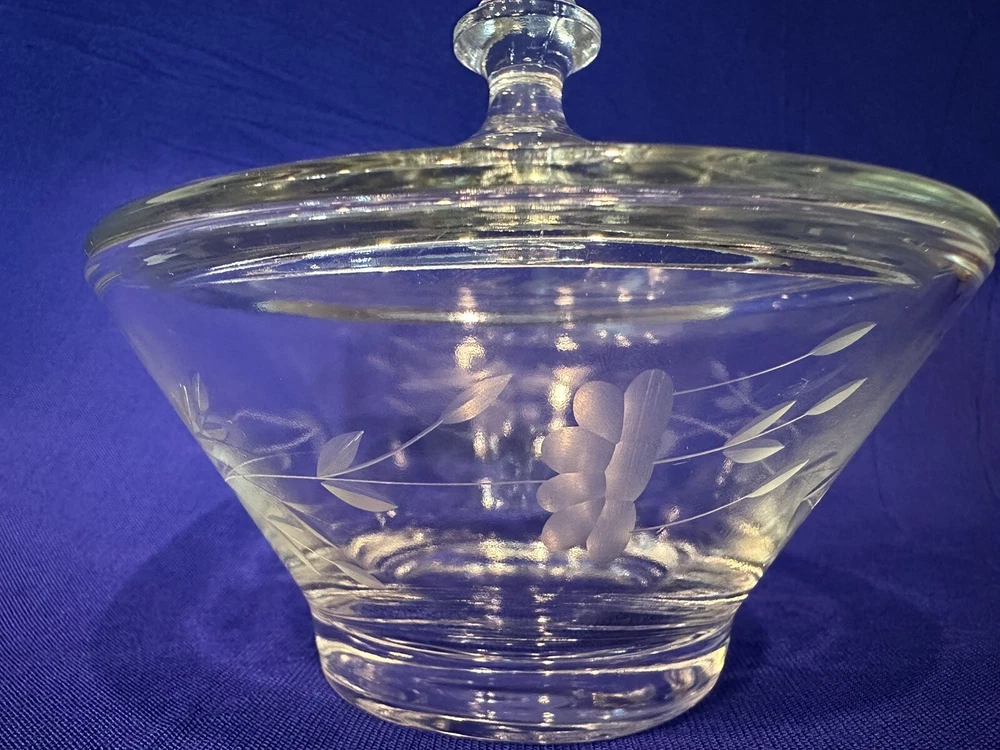 Pretty floral etched candy dish and lid. Dimensions Height - Bowl: 2 1/2 inches Bowl with lid: 6 inches Weight- 1 lb, 3 oz Diameter - 5 inches Very good condition with no discernible cracks or chips on bowl. Lid has a scratch. Etching is in excellent condition. Please refer to pictures. Sold as is.