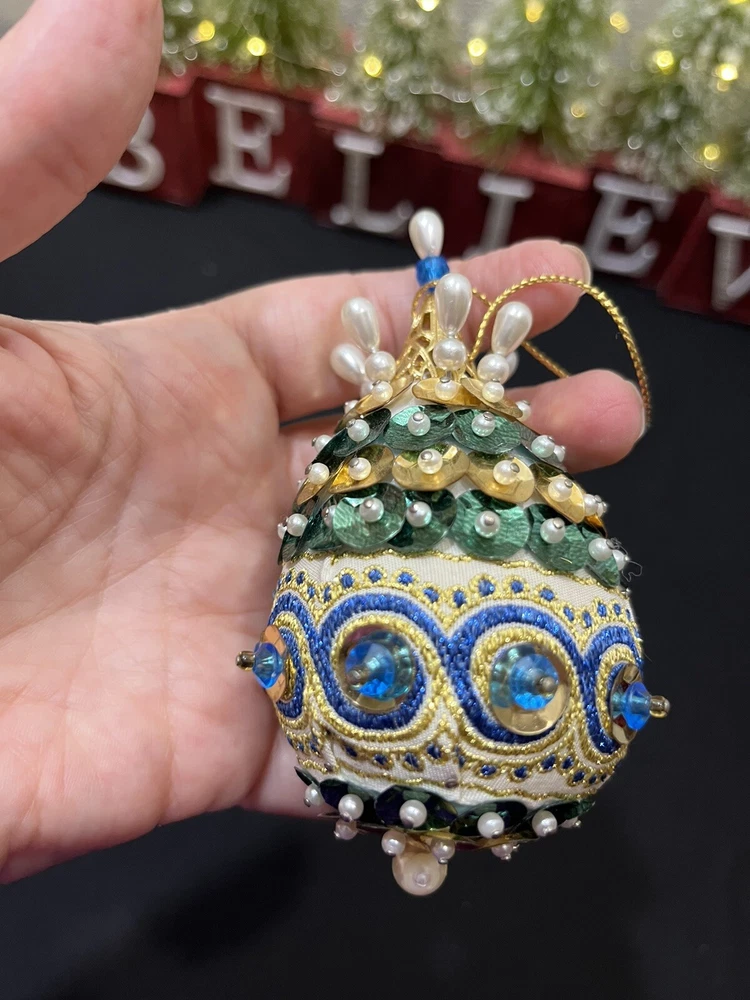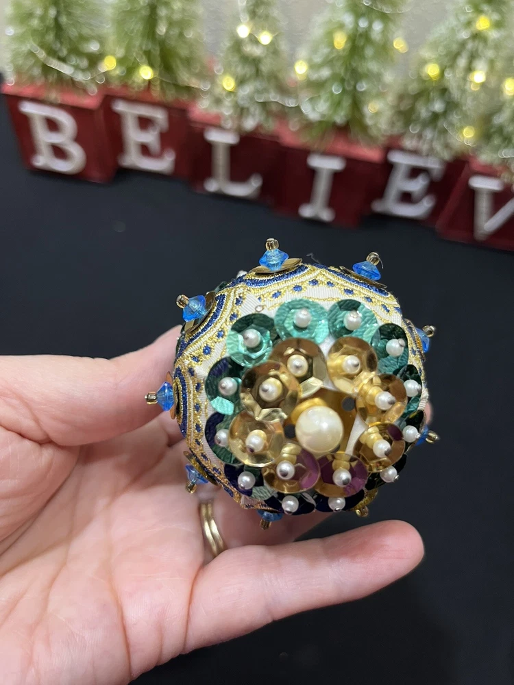 Add a touch of vintage charm to your holiday décor with this handmade push pin ornament. The oval-shaped ornament features a multicolor sequined design on a satin background, with a size of 4 inches. The antique-style ornament is perfect for Christmas or any other occasion, and is sure to catch the eye of any collector. This Mid-Century Modern style ornament is a one-of-a-kind piece that is perfect for adding a unique touch to your collection. The beaded and handmade design makes it a truly special ornament, and the fact that it is vintage adds to its charm. Celebrate the holiday season with this beautiful and timeless ornament, perfect for any recipient over the age of 18.