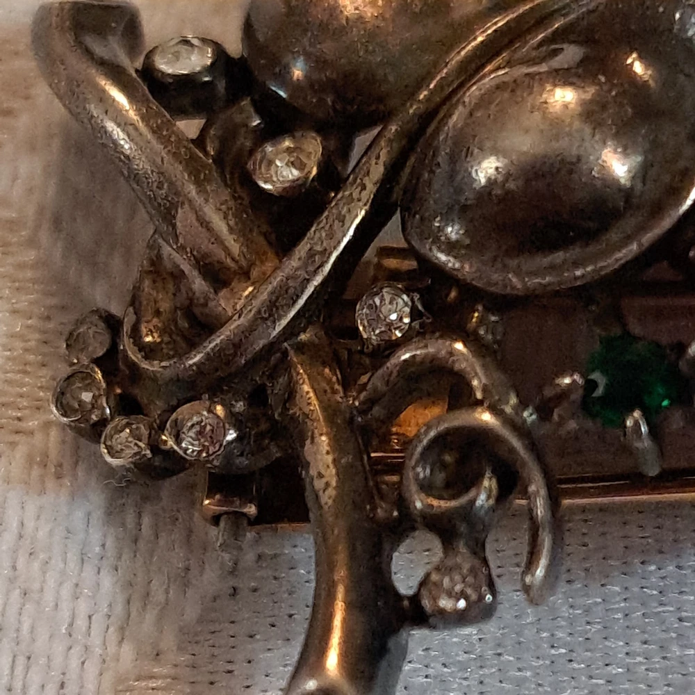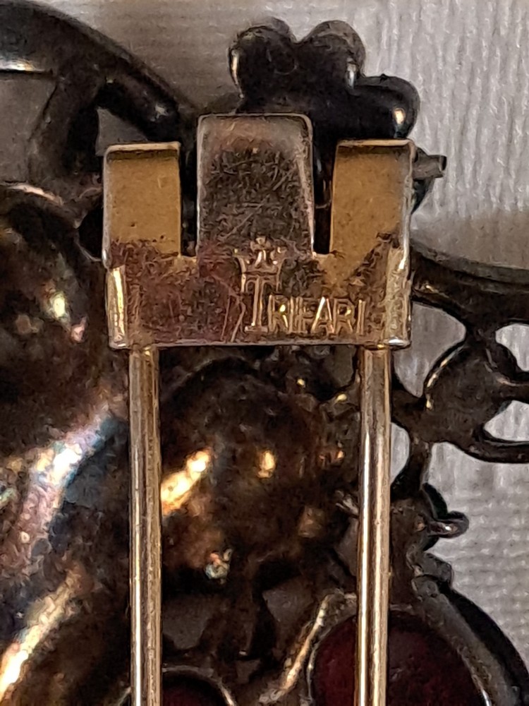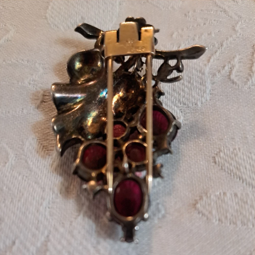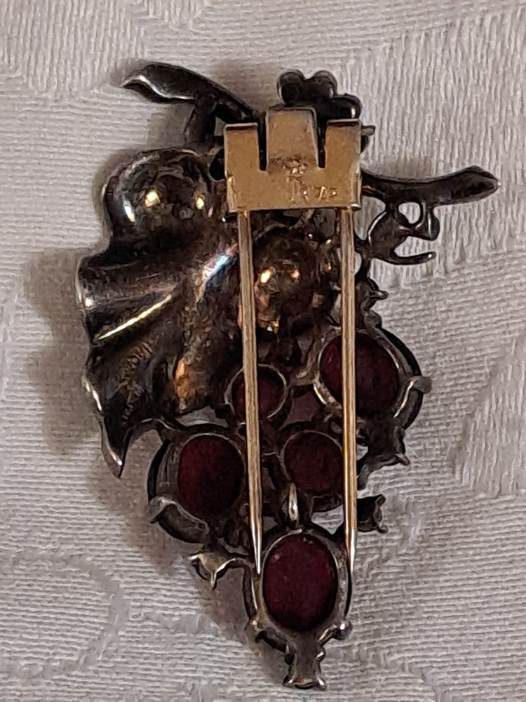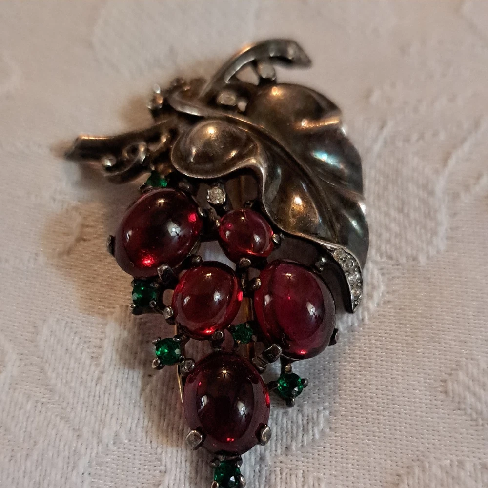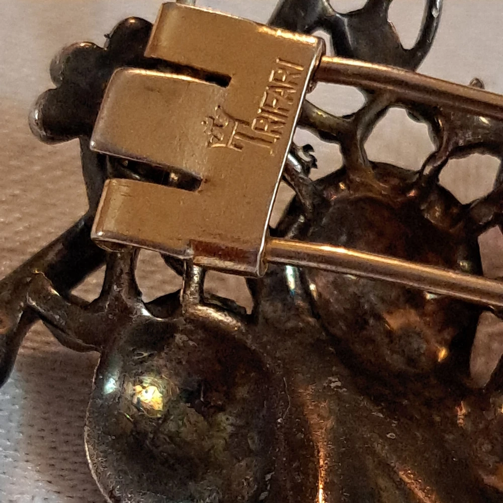 This Vintage Rare 1955 Sterling Trifari By Alfred Philippe Grape Fur Clip Brooch is a stunning piece of retro-era jewelry. Made in the United States with 925 sterling silver, this brooch features a delicate grape cluster design with round rhinestones, adding a touch of beauty and elegance to any outfit. The Trifari brand and signed design guarantee its authenticity and quality, making it a perfect accessory for special occasions like anniversaries or birthdays. This original piece is a timeless addition to any jewelry collection, showcasing the craftsmanship and design of the mid-20th century. This fur clip is in excellent condition. I have not cleaned this piece. I can not find another one exactly like it. It has patent numbers. Please view all pictures. I can combine shipping to save you some $$ 🥳