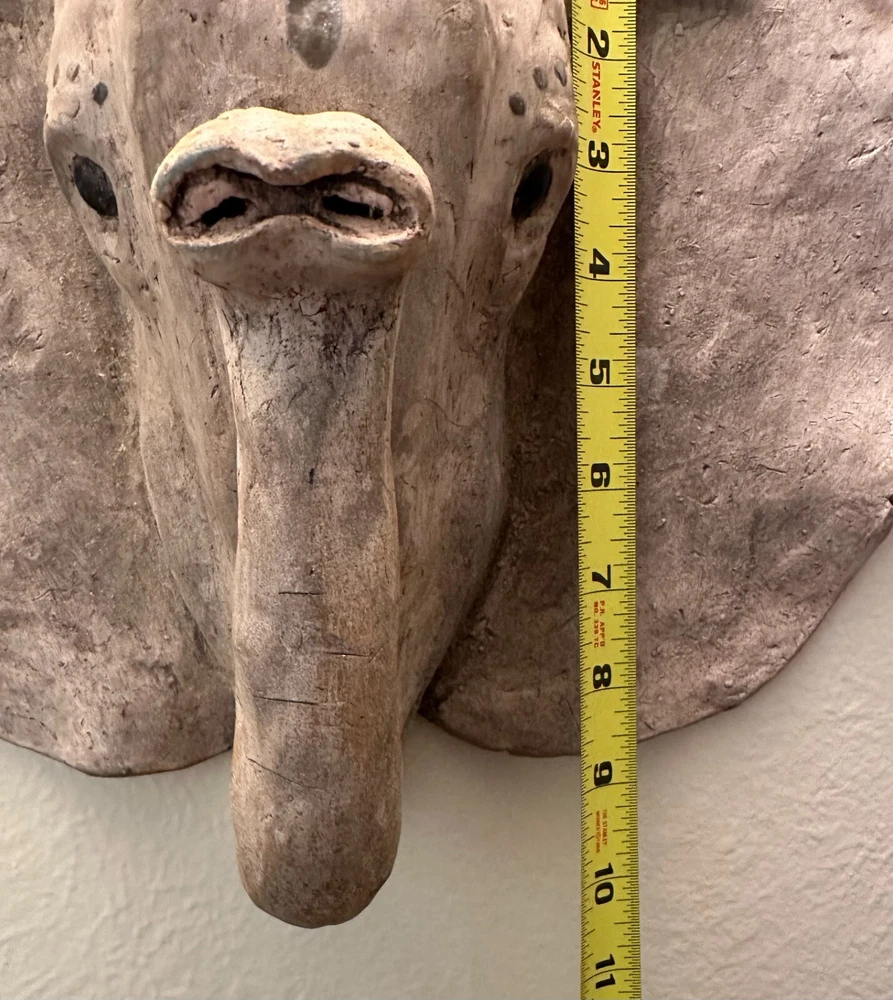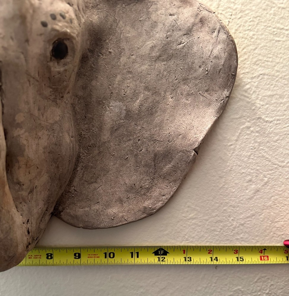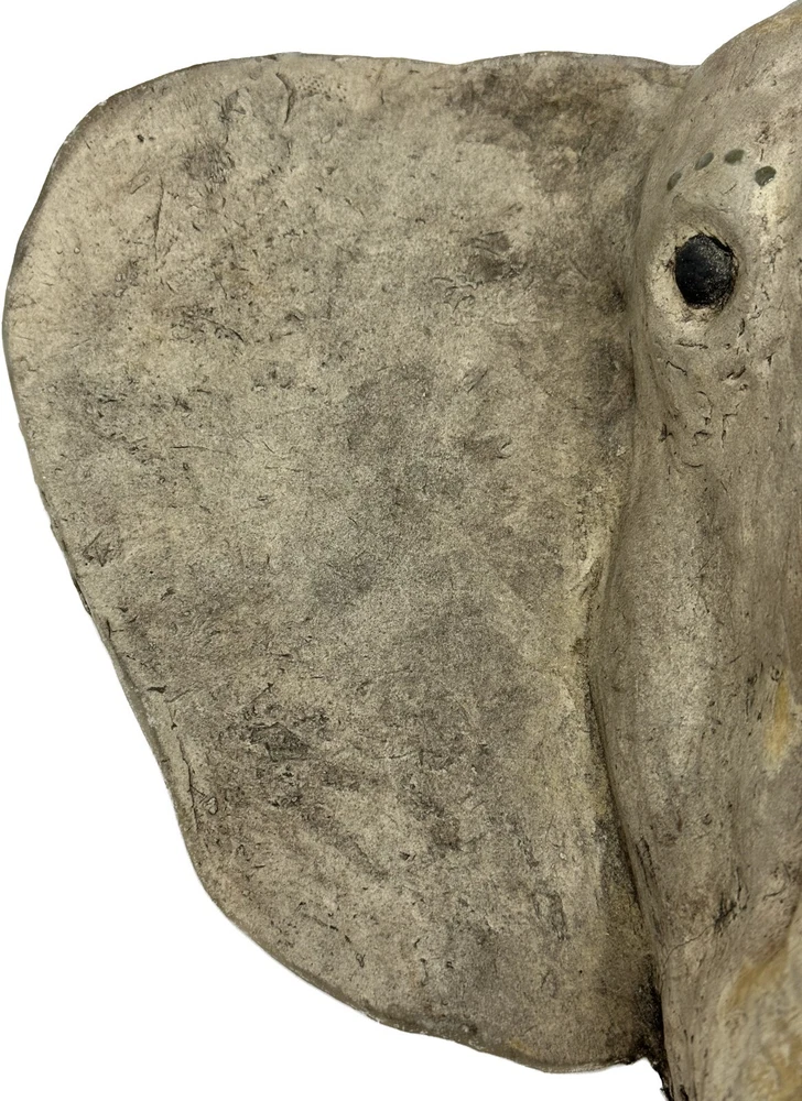Vintage Gray Elephant Head Handcrafted Concrete Wall Hanging Sculpture 10" Tall Vintage realistic gray elephant head wall sculpture. Handcrafted from durable clay or concrete. Impressive 10 inches in height and weighs Apx 6 lbs! Unique and eye-catching design with detailed features such as textured skin and tusks. Adds a touch of exotic, rustic charm to any space. Perfect for animal lovers and collectors. Timeless piece with a distinct vintage appeal. Approximate Measurements Length: 15" Height: 10" Weight: 6 lbs Take a look at the actual photos as they are part of our description.