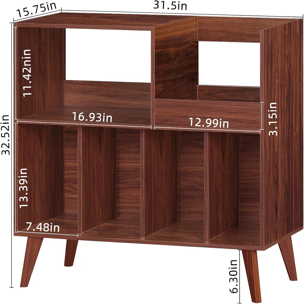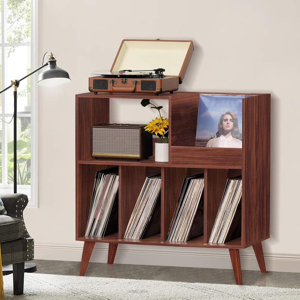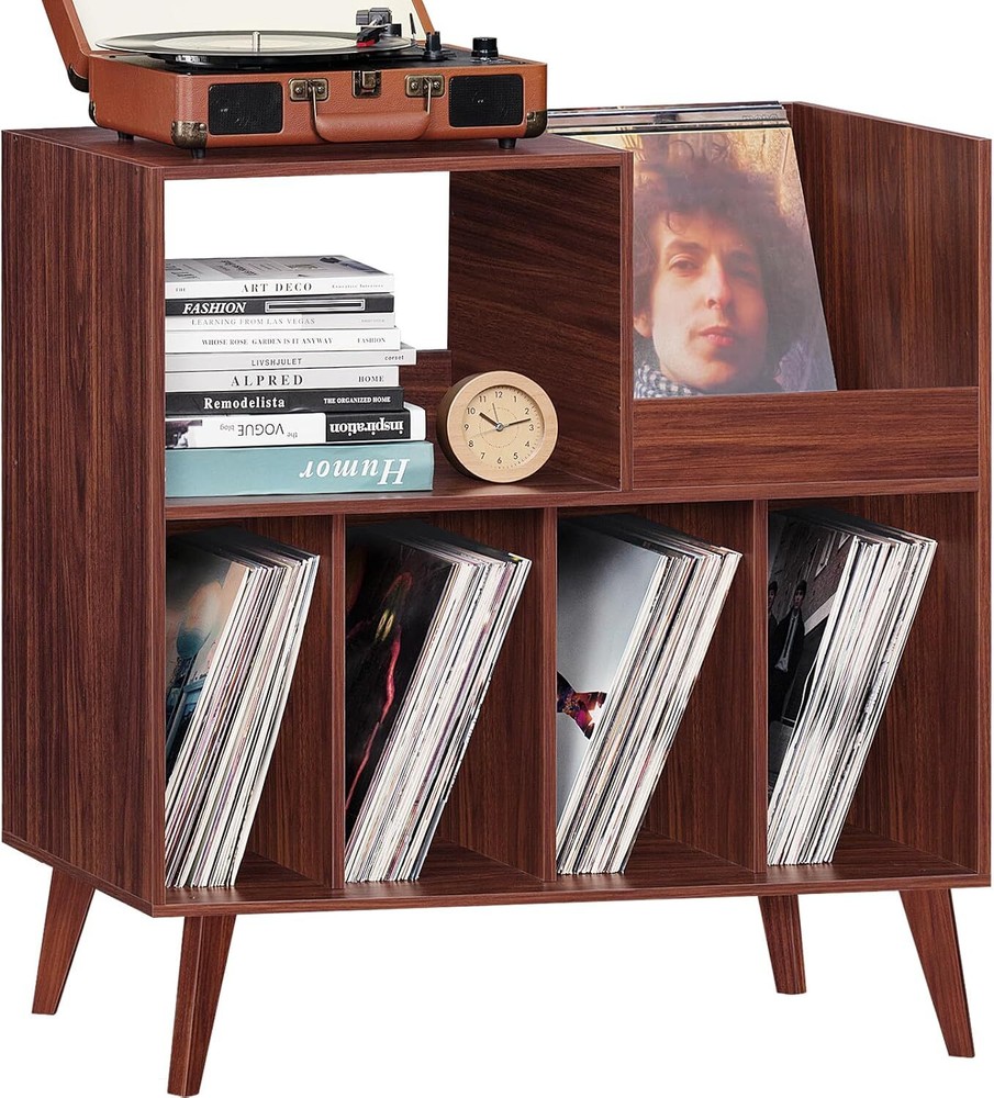 Product Description: 【Typical Retro turntable stand】 This large record player stand is assembled with a full wooden structure, and each panel has a unique wood texture. This huge vinyl record holder is like a ship full of historical stories sailing on the sea, carrying every vinyl record you love, allowing you to freely navigate the boundless sea with the melodious melody. 【Easy storage for 300 records】 This ultra-large capacity record player holder can easily store more than 300 vinyl records, with 4 broad partitions to store different styles of vinyl records. We have also designed a unique open display area for the vinyl records in this record player table for you to easily select the vinyl record you want. 【Connecting to audio equipment is more convenient】 The hollow back panel design makes it easier to connect the audio and record player, and the storage space below the record stand can hold most external audio sizes. This super-large vinyl record storage is an excellent choice for most black vinyl record lovers! 【Tough rubber wood support legs】 This all-wooden record player table body is assembled with environmentally-friendly wood boards certified by the rubber wood legs. Its reasonable structural design gives it a more stable carrying capacity. Dimensions: 31.5'' L x 15.75'' W x 32.52'' H, width of a single partition below: 7.48'' H. Specification: Color: Walnut Recommended Uses For Product: Vinyl Records Product Dimensions: 15.75"D x 31.5"W x 32.52"H Special Feature: Storage Material: Wood