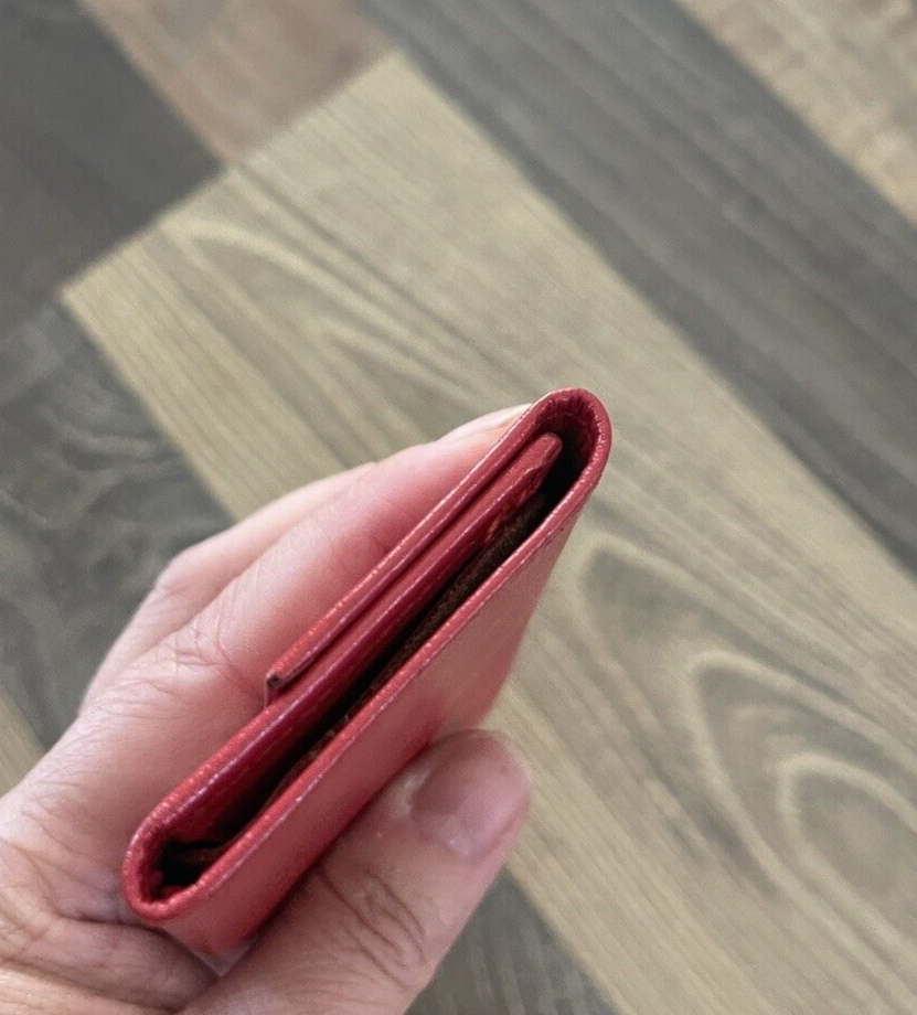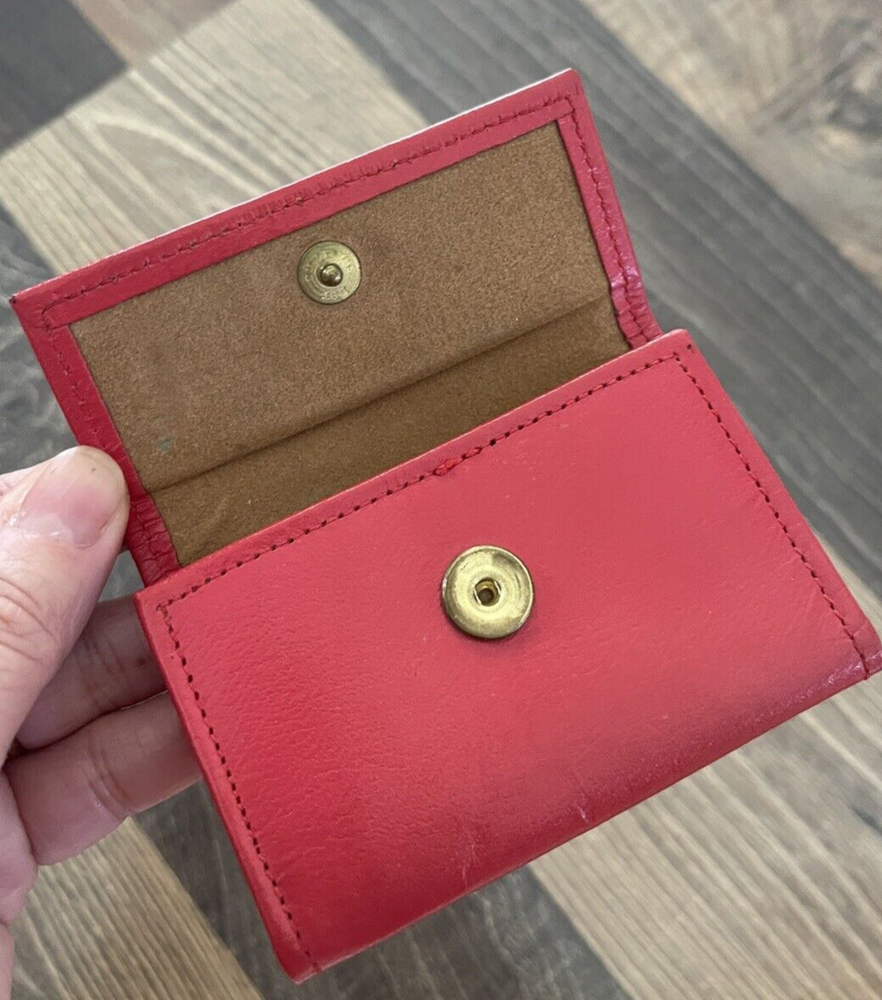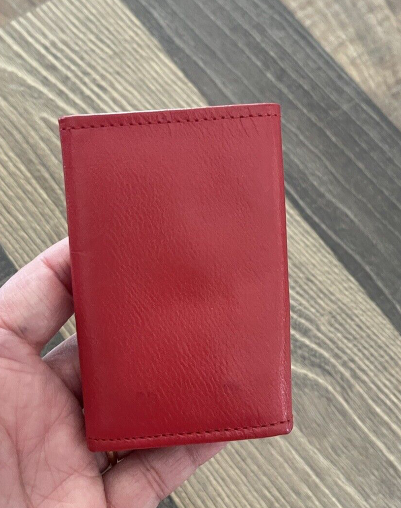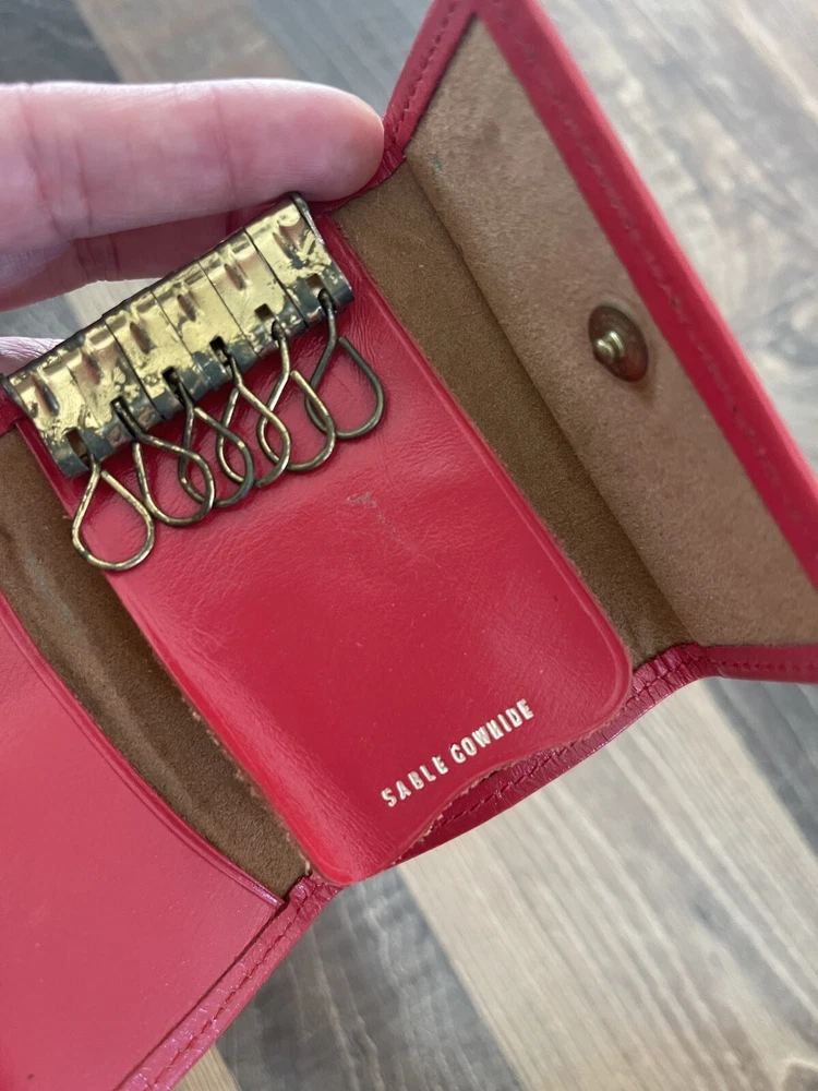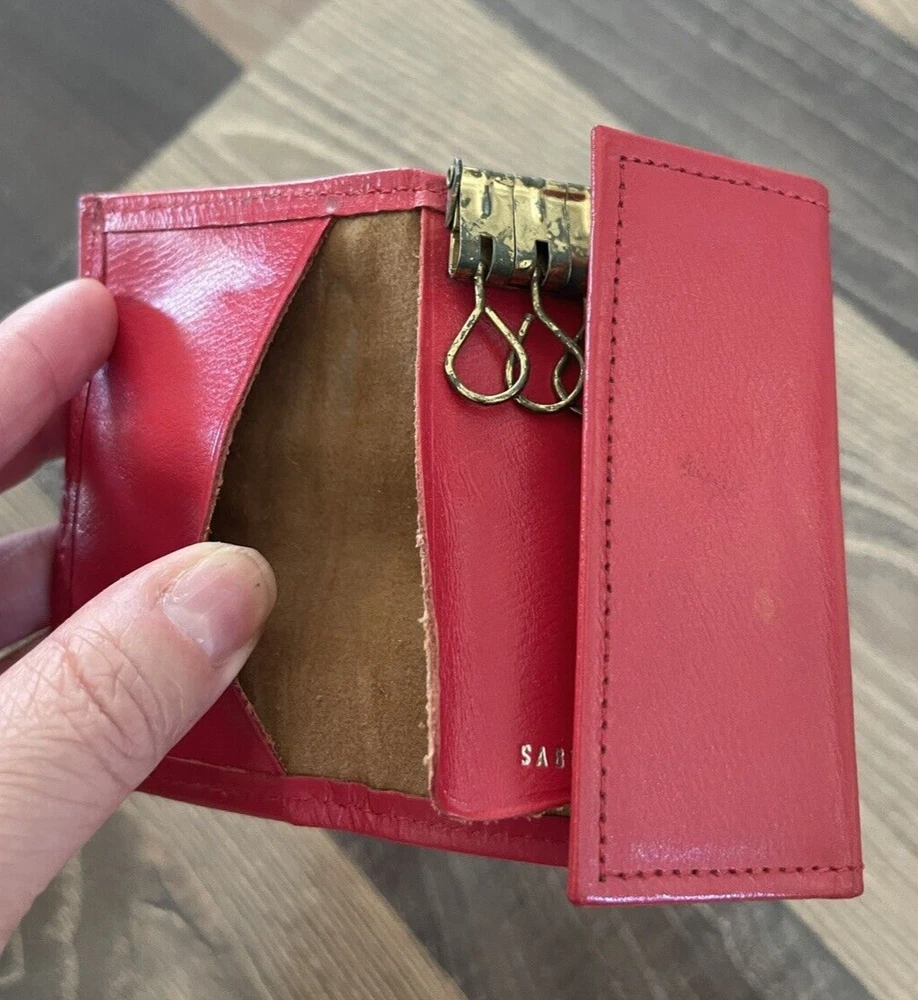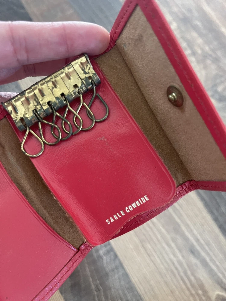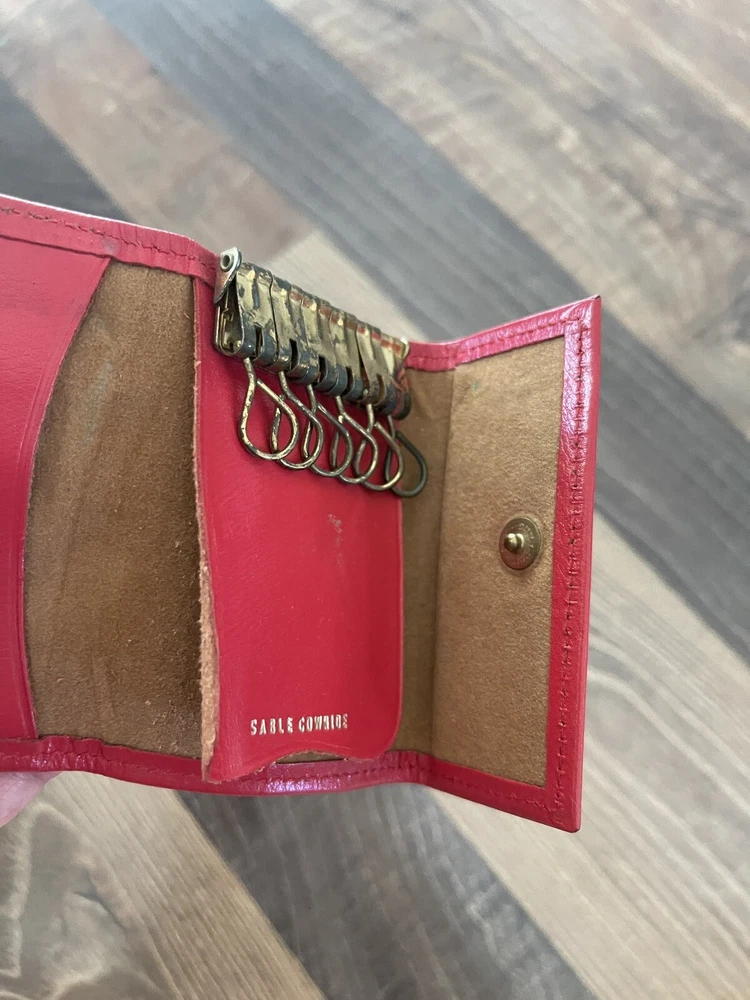This vintage red sable cowhide leather key holder case is the perfect addition to any boho-inspired outfit. With 6 hooks, it can hold all your keys in one convenient location. The folding style makes it easy to slip into your pocket or purse, while the solid pattern in red adds a pop of color to your accessories collection. -3.5 X 2 inches, shows wear throughout upper leather and hardware shows tarnishing Crafted from high-quality leather, this key wallet is durable and long-lasting. The XS size is perfect for women who prefer smaller accessories, and the designer theme adds a touch of sophistication. This wallet is pre-owned but remains in excellent condition, ready to add a stylish flair to your everyday look.