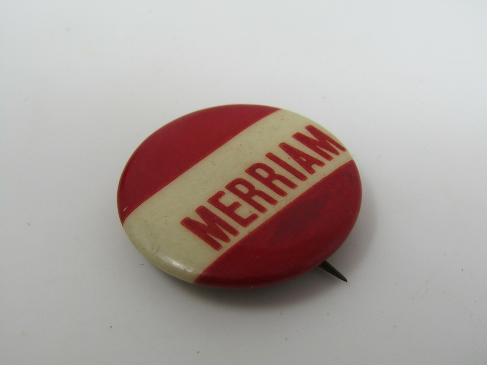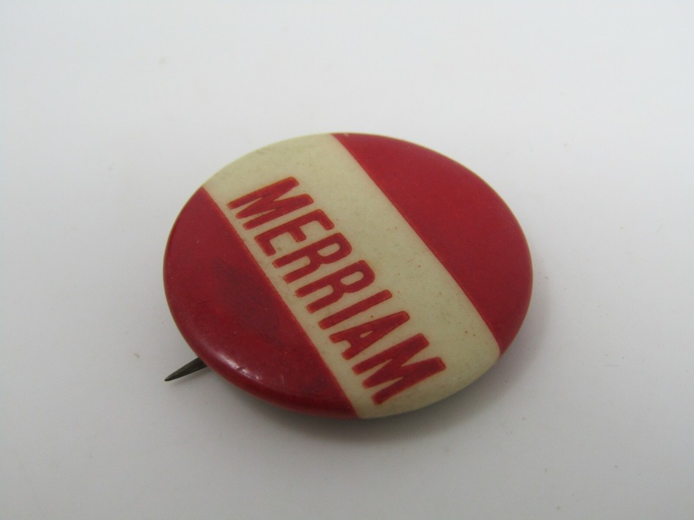 MERRIAM Pin Button Vintage Red & White ~ Almost all of our items are vintage and will have various degrees of wear, but we really don't carry anything that we wouldn't own ourselves. Please take a look at the pictures for the all vintage pins to get the best idea of wear. ~